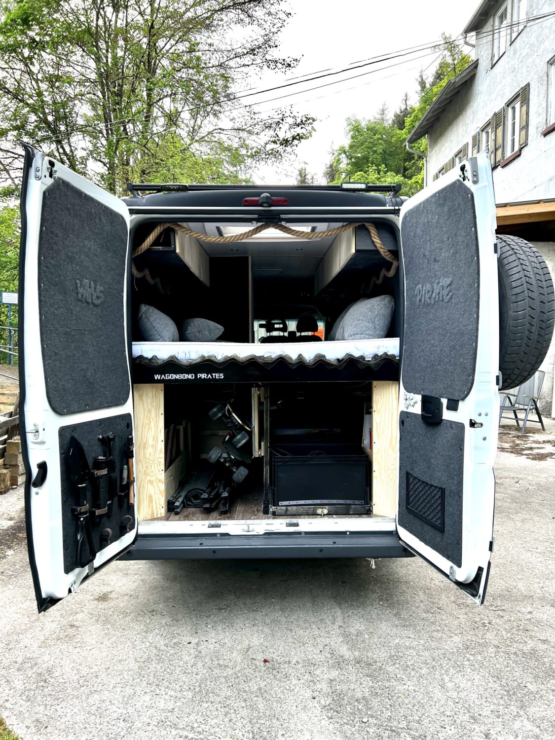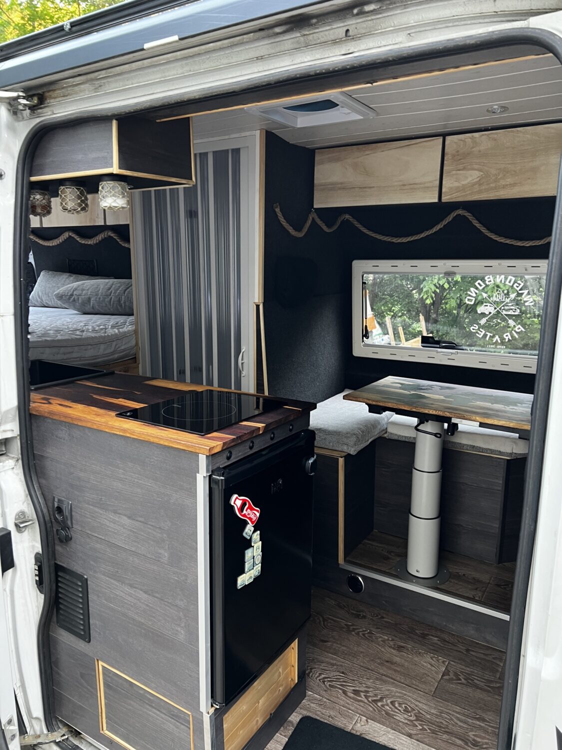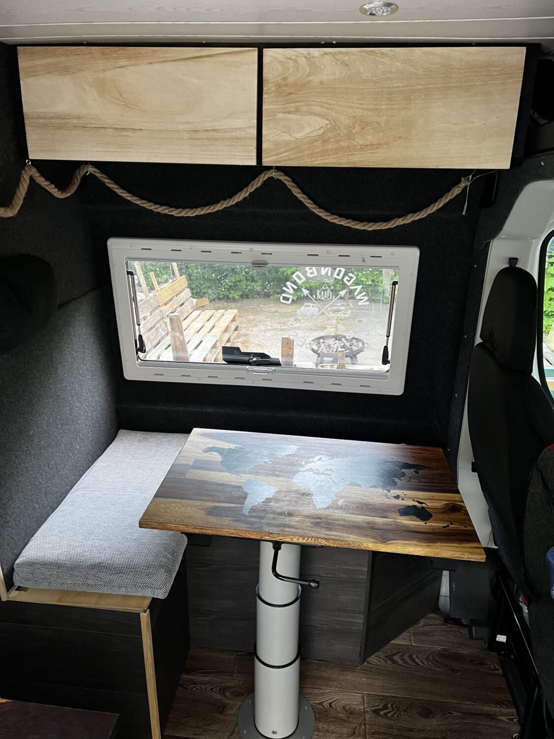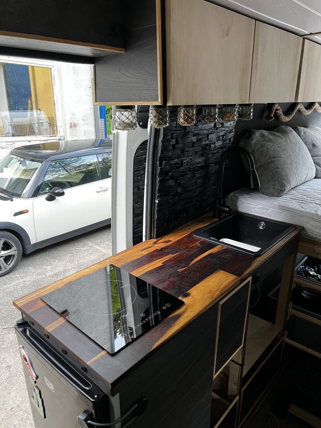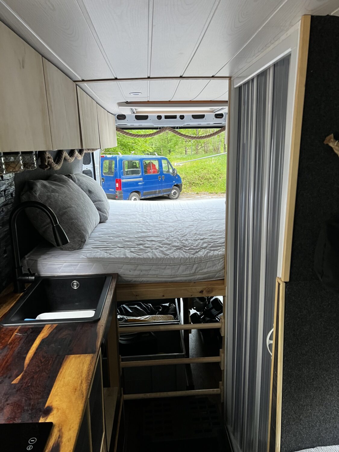 Der Ausbau hat mit mehreren zwangspausen ca.ein halbes Jahr gebraucht. Er hat eine Sitzecke, Küche, Dusche mit Toilette und ein großes 180x190cm Bett, außerdem in der Heckgarage einen Euroboxen Schwerlastauszug und eine E-Skateboard halterung zum ausziehen. Ich habe mit Van zusammen ca.15000€ ausgegeben und bin deshalb besonders Stolz auf meine Design Highlights wie weltkarte im Tisch oder beleuchtete Berglanschaft am Bett.