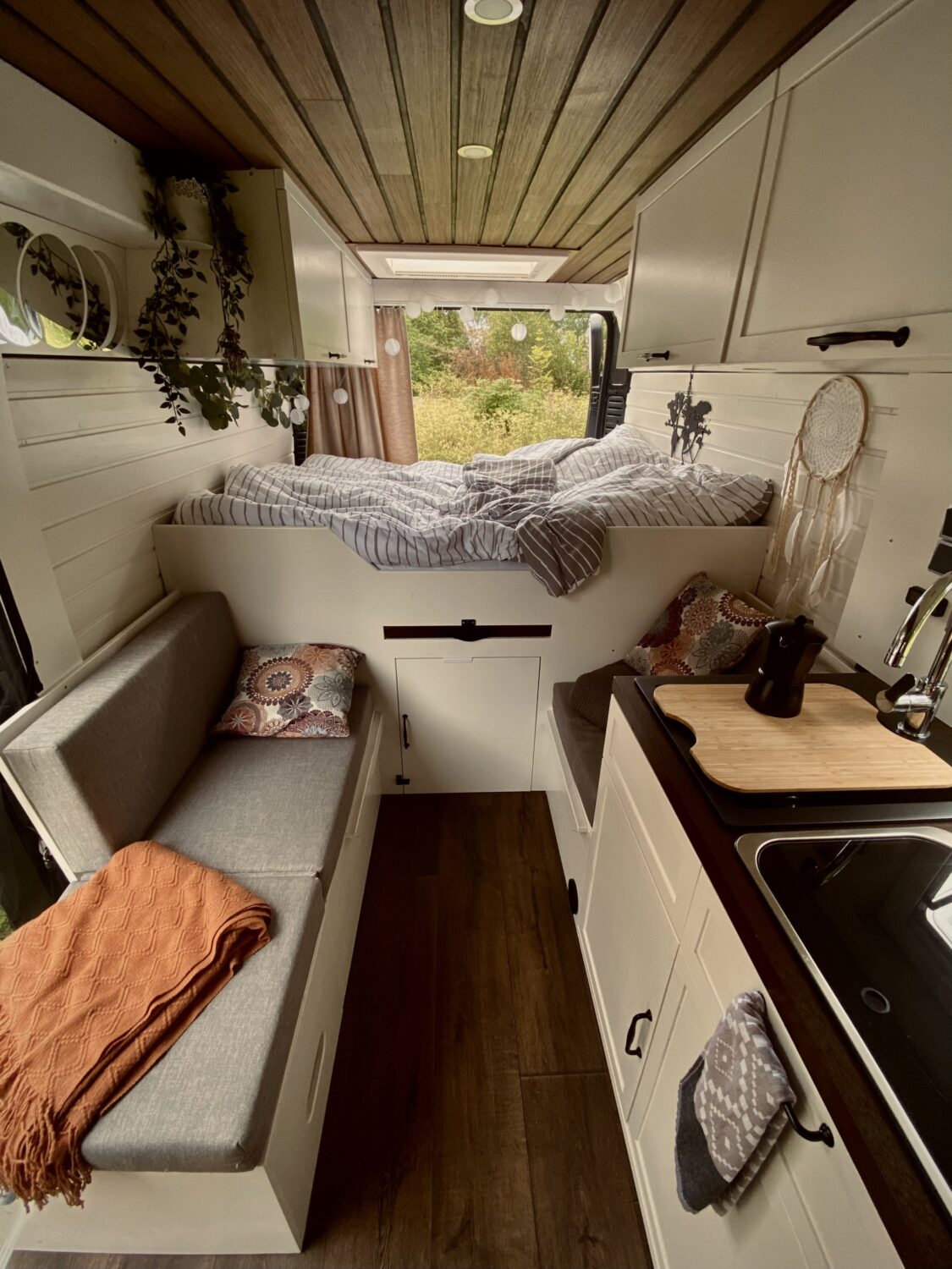 Der Ausbau wurde von World Wide at Home in Osnabrück innerhalb von ca. 6 Monaten vorgenommen. Wir stehen autark, dank unser zwei Solarpanels. Wir haben keine Nasszelle, aber eine Toilette an Bord. Wir lieben unseren natürlichen Ausbau aus Holz und froh, ein Querschläfer-Bett zu haben. 🙏🏼