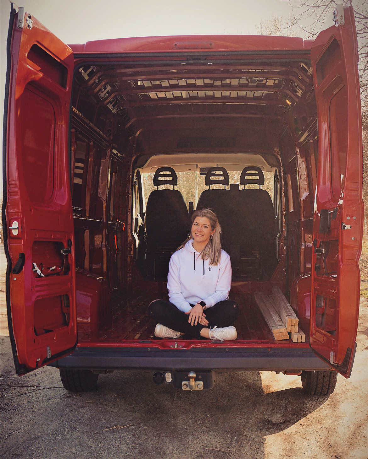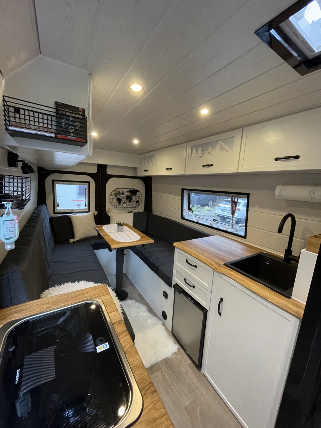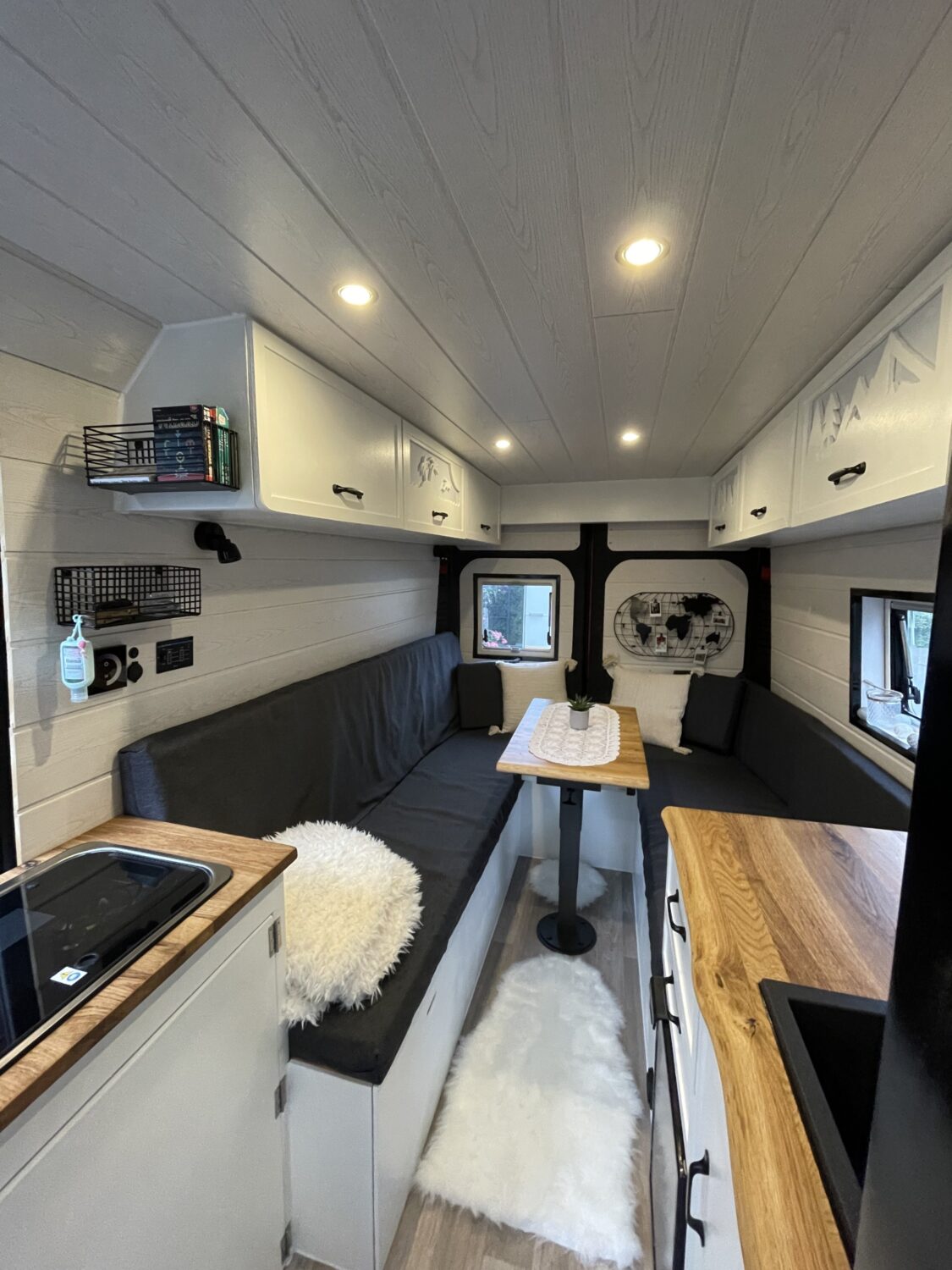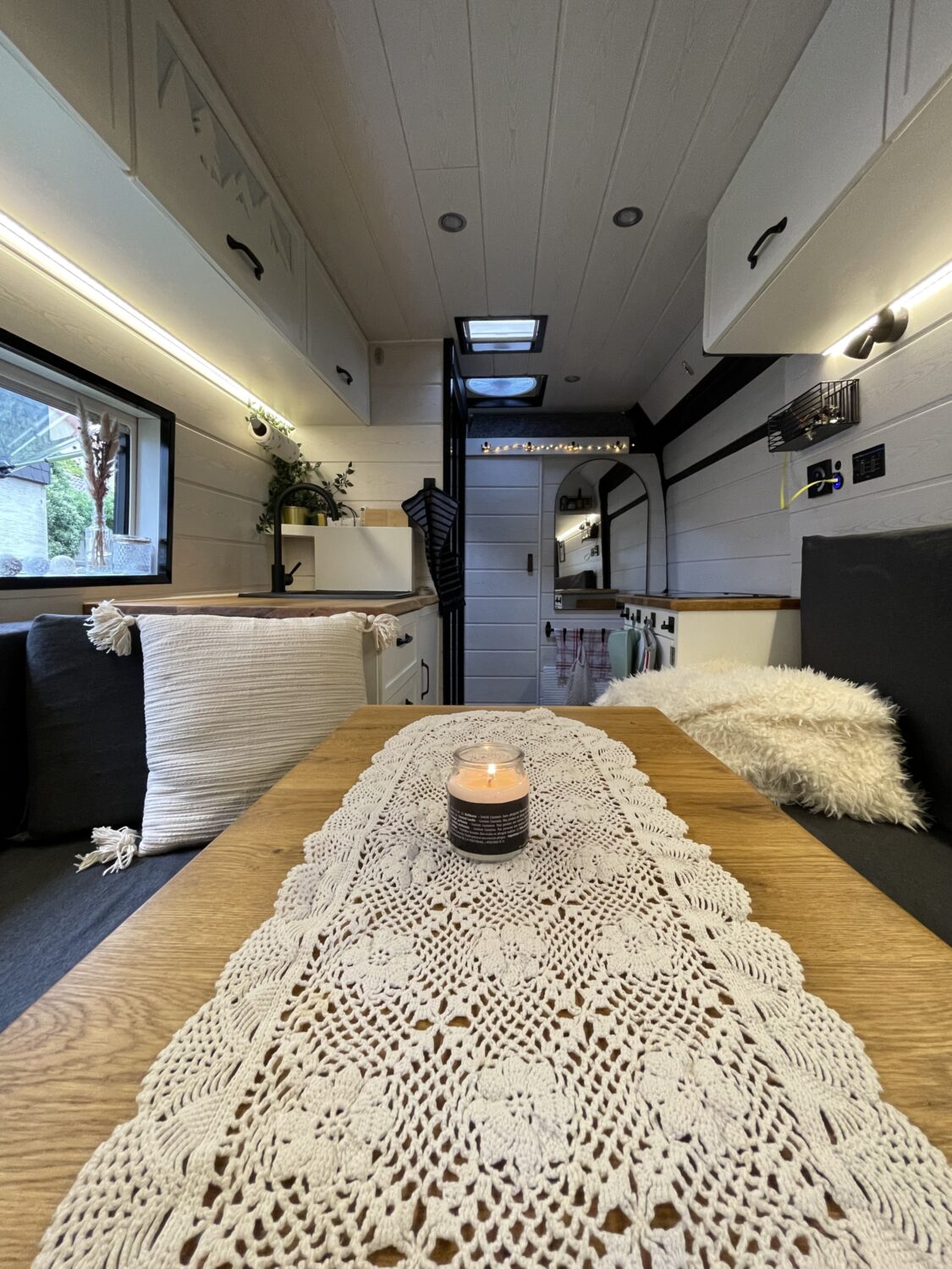 Wir haben eine Dusche, können unser Wohnzimmer zum Schlafzimmer umbauen, haben eine Heizung und eine Schiebetür zur Fahrerkabine. Außerdem habe ich einige Fronten von unseren Hängeschränken mit Motiven versehen, welche ich ausgesägt und angestrichen habe.