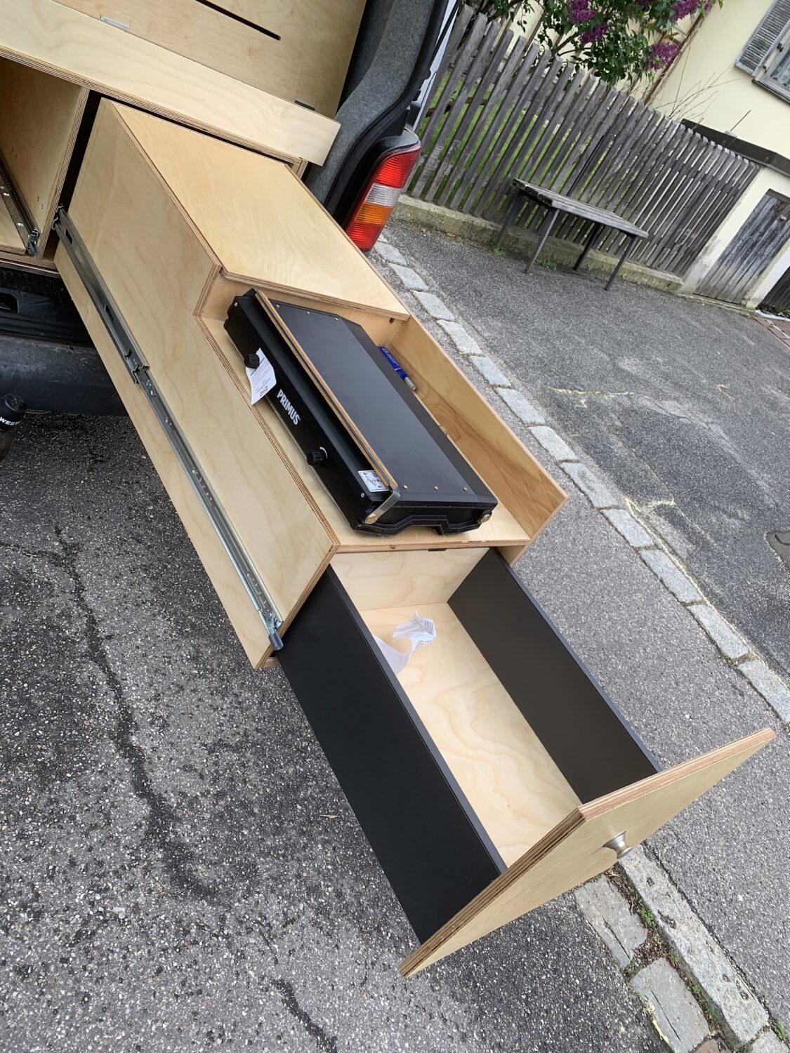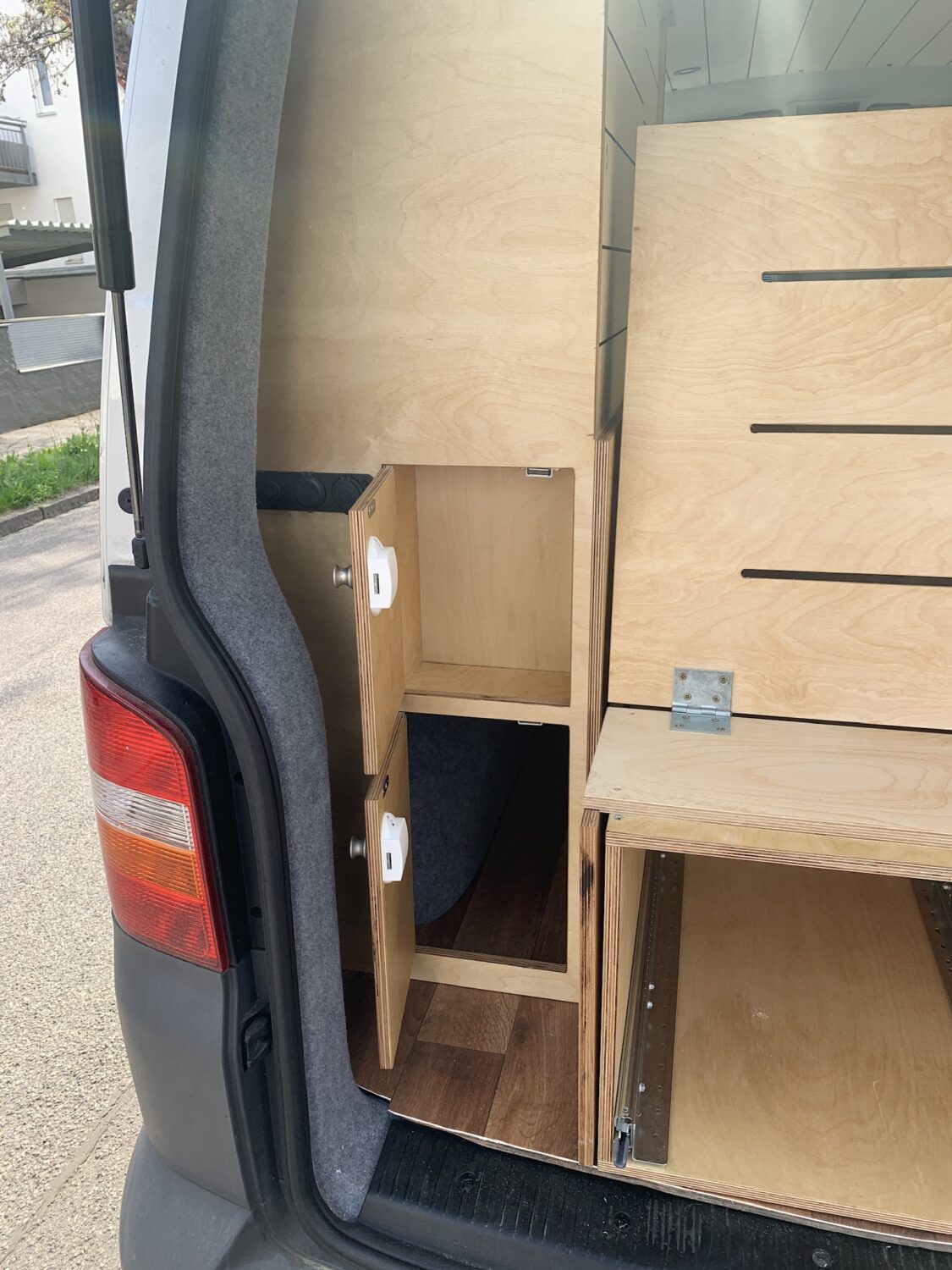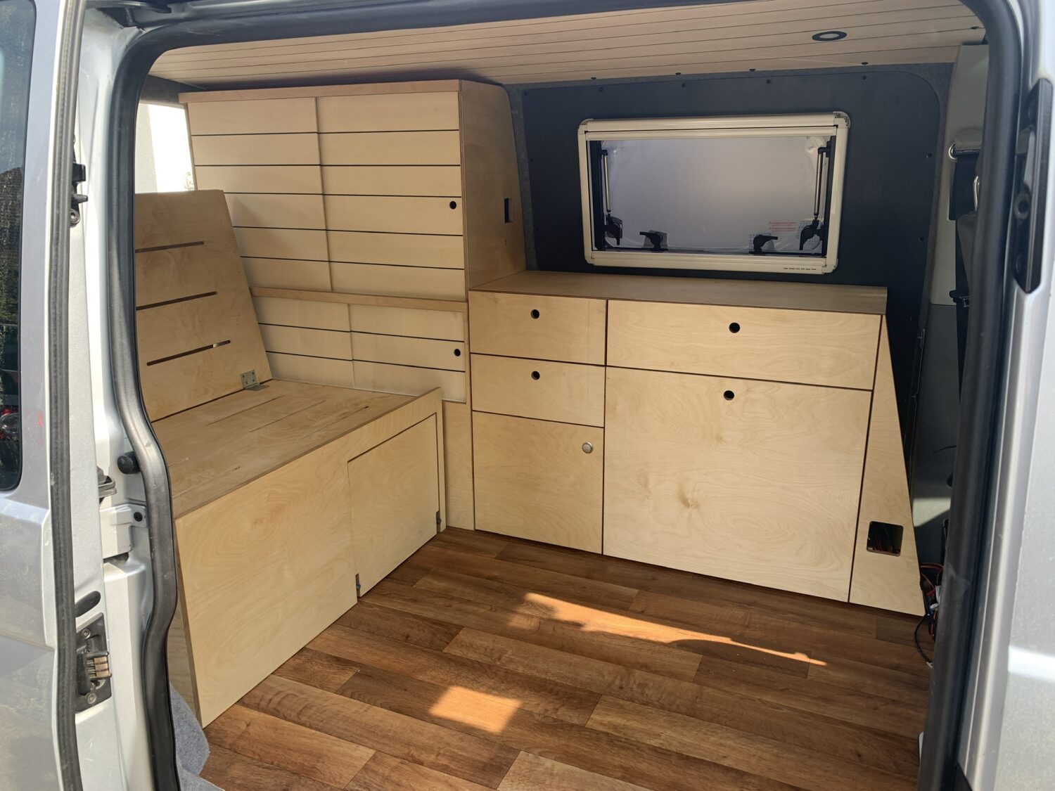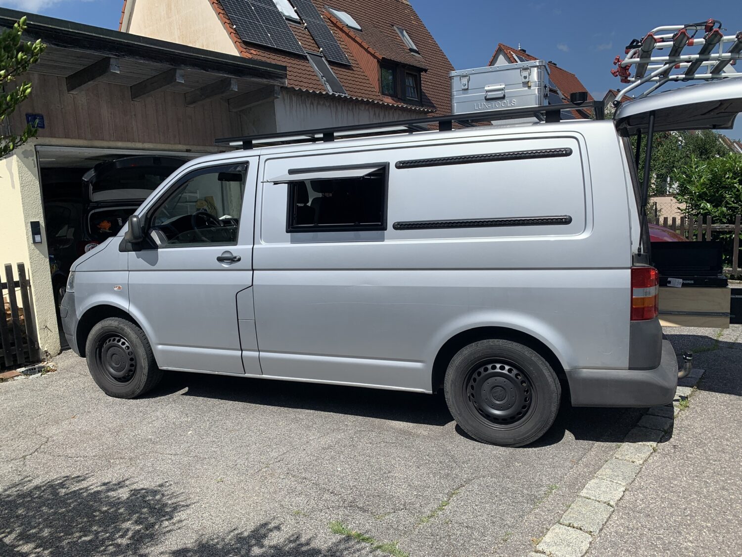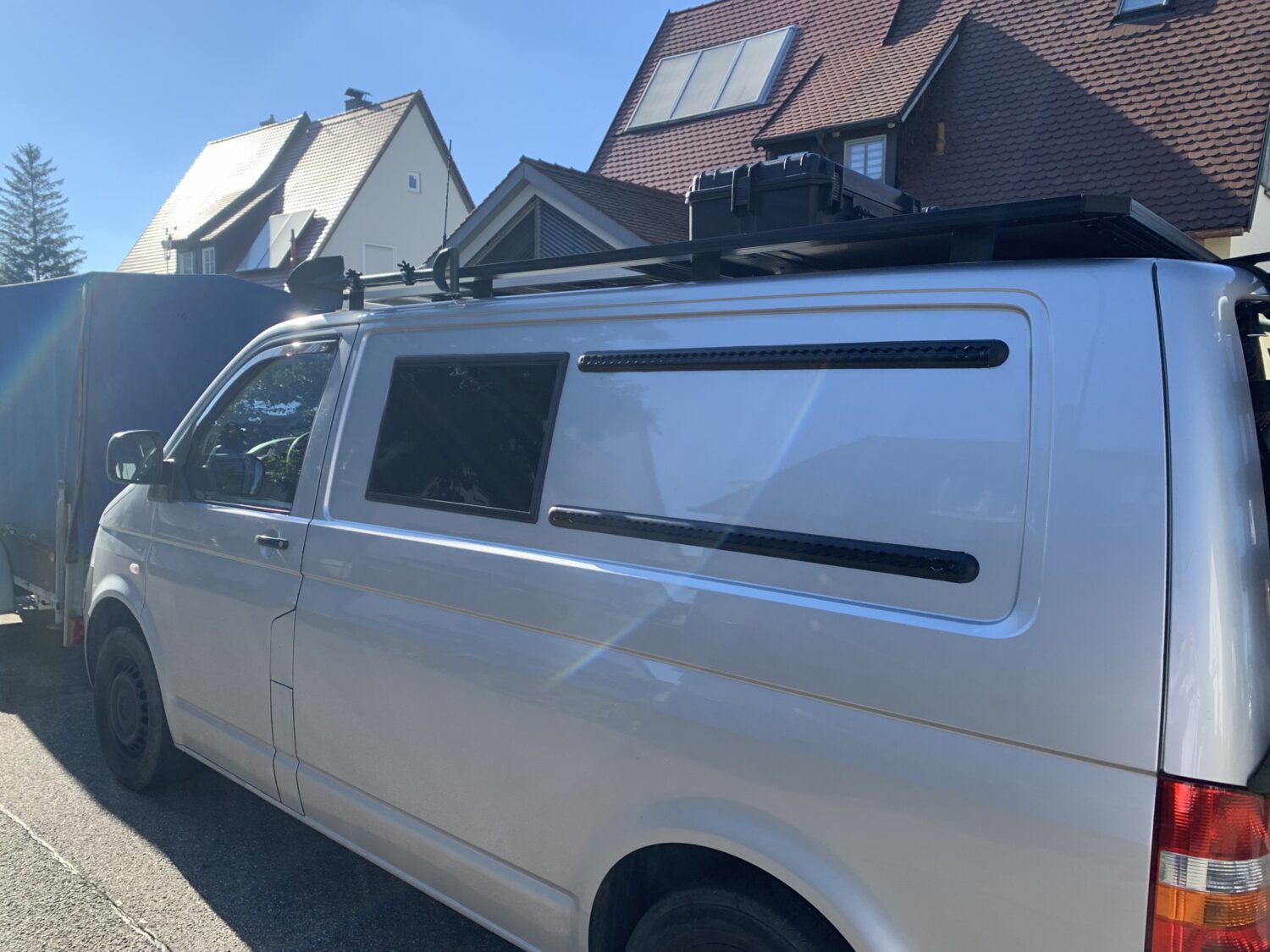 DIY Ausbau eines T5 Transporters - Autark durch 2x 120W Solar Panels - Ausziehbares Bett 125cm x 200cm - Küche als Heckauszug - Markise 2m x 2m - Dachträger aus Alu Profilen - Dachterasse - Heckträger mit Airlineschienen - Airlineschienen an der Karosserie - Innenausbau aus Multiplex - Drehkonsole für die Doppelsitzbank - Ausstellfenster