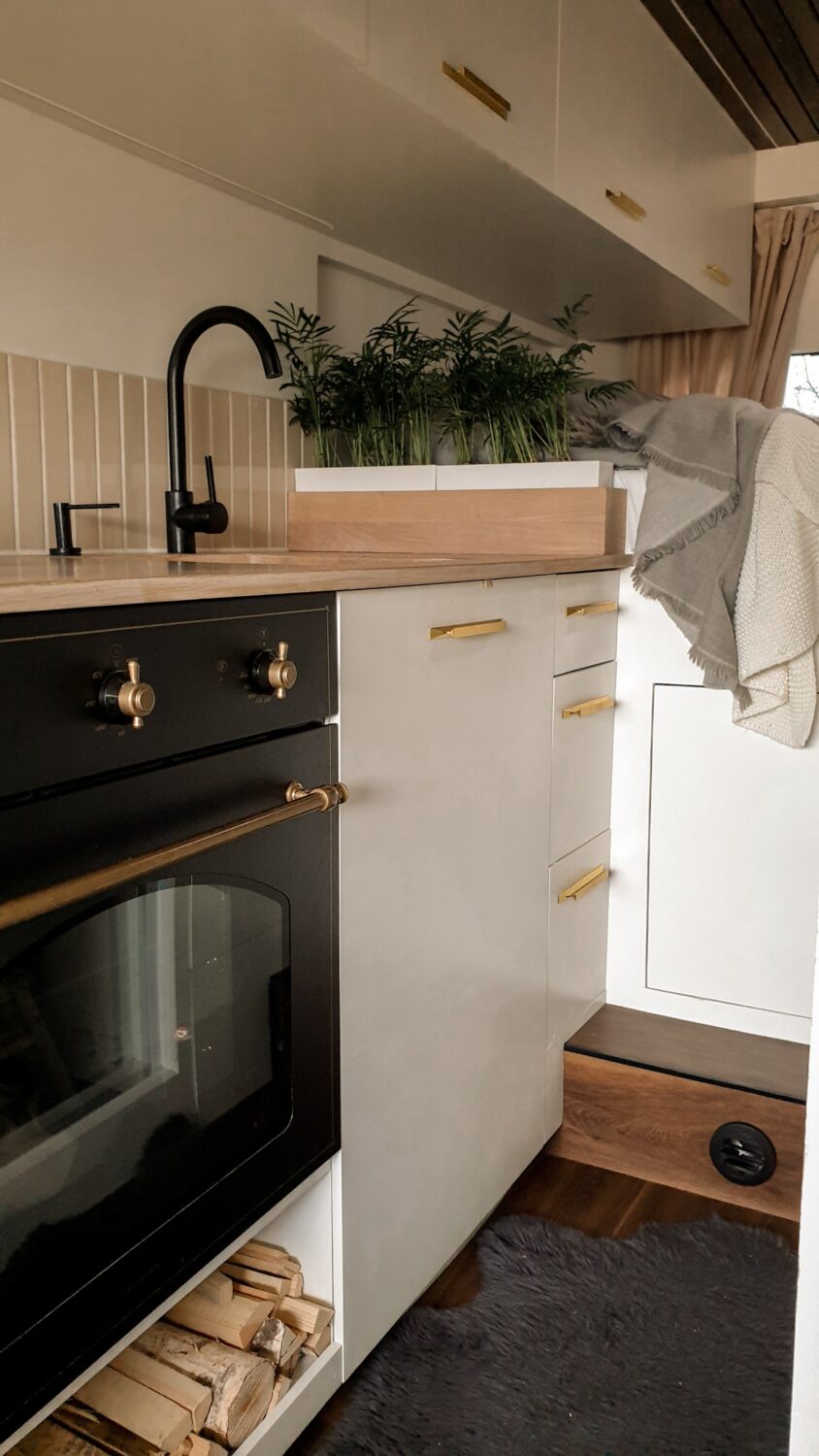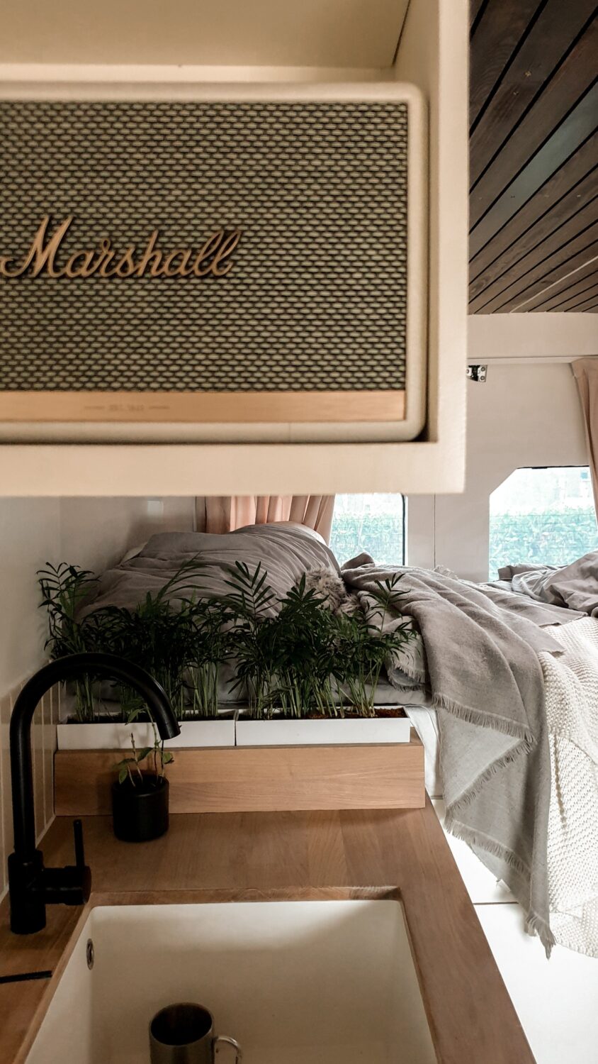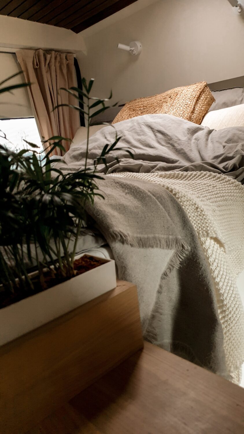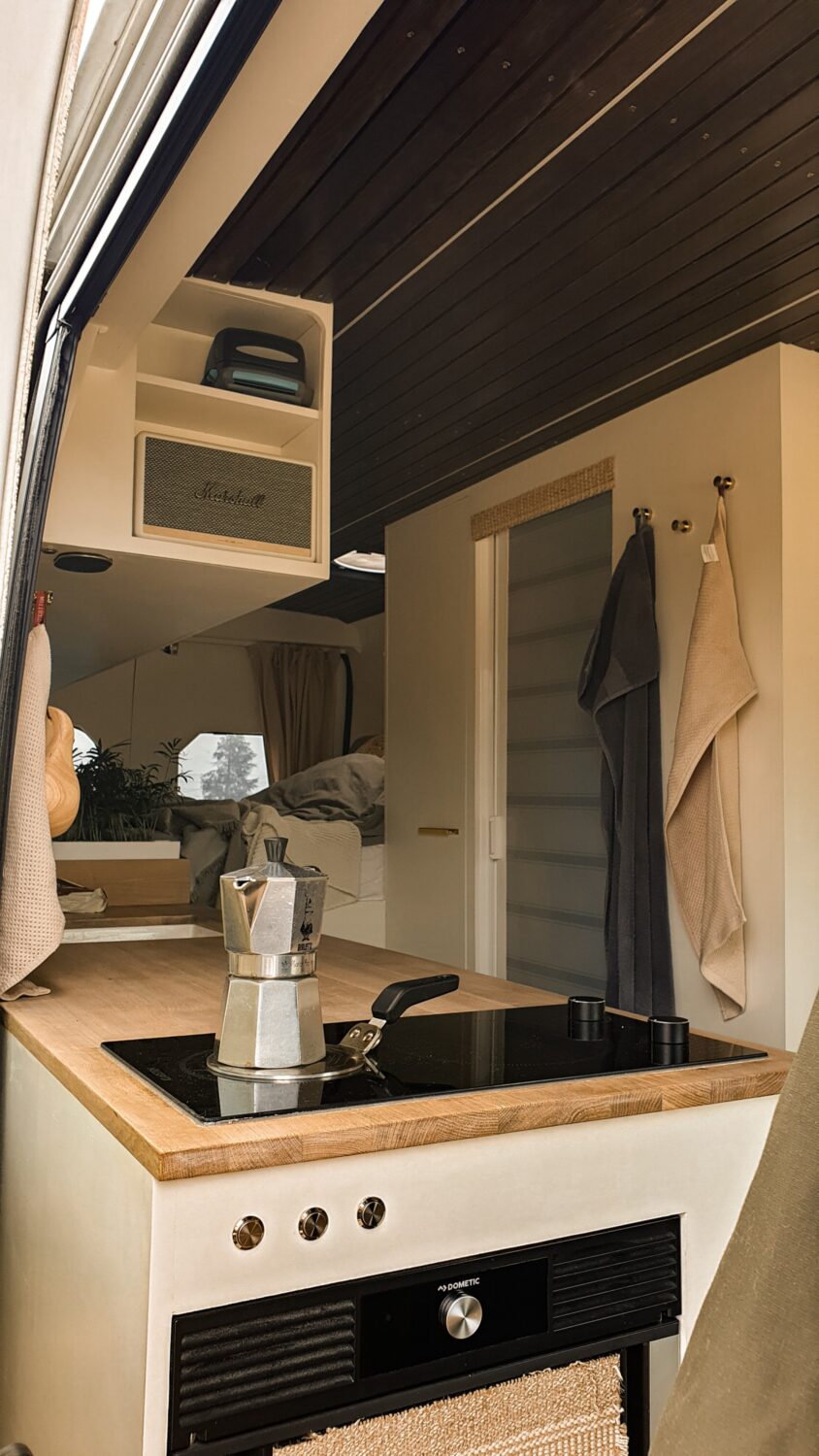 Unser Herbert wurde nach dem Opa von Sabrina benannt und ist das schönste Zuhause, welches wir uns vorstellen können. Wir haben uns ein Jahr Zeit gelassen um ihn nach unseren Vorstellungen in unser Heim auf vier Rädern umzubauen. Da Sabrina unbedingt eine Terrasse wollte und Marius meinte wir haben keinen Platz auf dem Dach, da wir Solarpanels brauchen und unsere Surfboards unterbekommen müssen, ist die Terrasse kurzerhand unter das Bett gewandert, was im Nachhinein die beste Entscheidung war. Somit dient sie als Markise, als Balkon, als Leiter und als Aussichtsplattform wenn man vor einer Klippe parkt. Da wir auf Gas verzichten wollten, haben wir auf ein großes Strom-Setup, mit 800Ah Batteriekapazität, gesetzt und können mit unserem 3000W Wechselrichter sowohl unser Induktionsfeld als auch unseren Haushaltsbackofen betreiben. Mit unserem 150 L Wassertank haben wir jederzeit genügend gefiltertes Wasser um lange autark zu stehen und uns auch mal eine Warme Dusche zu gönnen. Die Nasszelle dient hierbei nicht nur als Dusche/Toilette, sondern durch einen Auslass der Dieselheizung und einem Lüfter im Dach ist sie auch der perfekte Trockner für unsere Wetsuites an Regentagen und Snowboards wenn es mal auf die Piste geht.