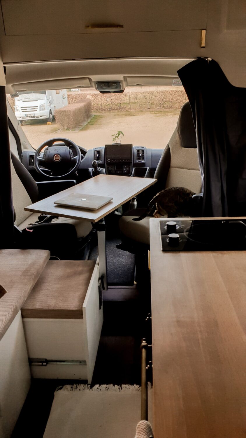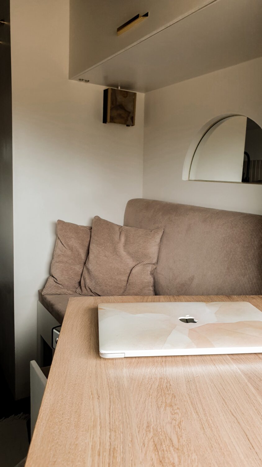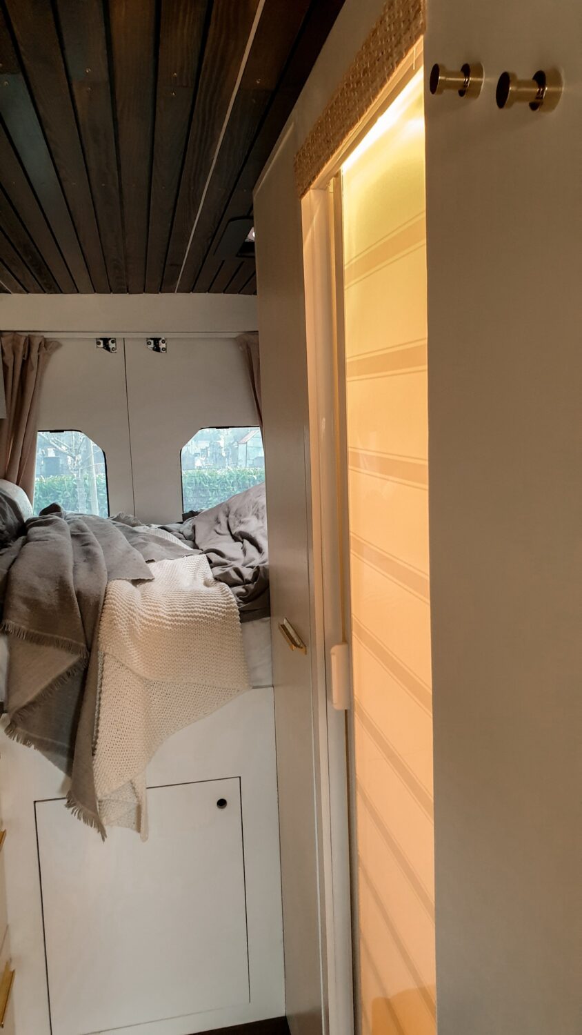 Unser Herbert wurde nach dem Opa von Sabrina benannt und ist das schönste Zuhause, welches wir uns vorstellen können. Wir haben uns ein Jahr Zeit gelassen um ihn nach unseren Vorstellungen in unser Heim auf vier Rädern umzubauen. Da Sabrina unbedingt eine Terrasse wollte und Marius meinte wir haben keinen Platz auf dem Dach, da wir Solarpanels brauchen und unsere Surfboards unterbekommen müssen, ist die Terrasse kurzerhand unter das Bett gewandert, was im Nachhinein die beste Entscheidung war. Somit dient sie als Markise, als Balkon, als Leiter und als Aussichtsplattform wenn man vor einer Klippe parkt. Da wir auf Gas verzichten wollten, haben wir auf ein großes Strom-Setup, mit 800Ah Batteriekapazität, gesetzt und können mit unserem 3000W Wechselrichter sowohl unser Induktionsfeld als auch unseren Haushaltsbackofen betreiben. Mit unserem 150 L Wassertank haben wir jederzeit genügend gefiltertes Wasser um lange autark zu stehen und uns auch mal eine Warme Dusche zu gönnen. Die Nasszelle dient hierbei nicht nur als Dusche/Toilette, sondern durch einen Auslass der Dieselheizung und einem Lüfter im Dach ist sie auch der perfekte Trockner für unsere Wetsuites an Regentagen und Snowboards wenn es mal auf die Piste geht.