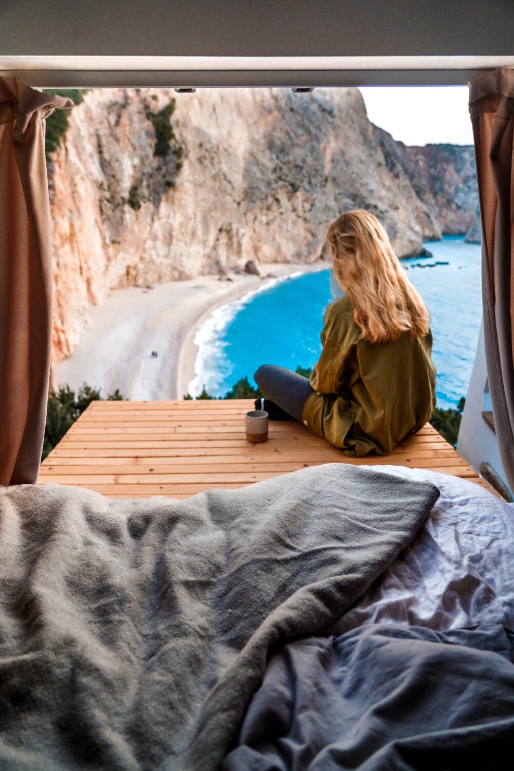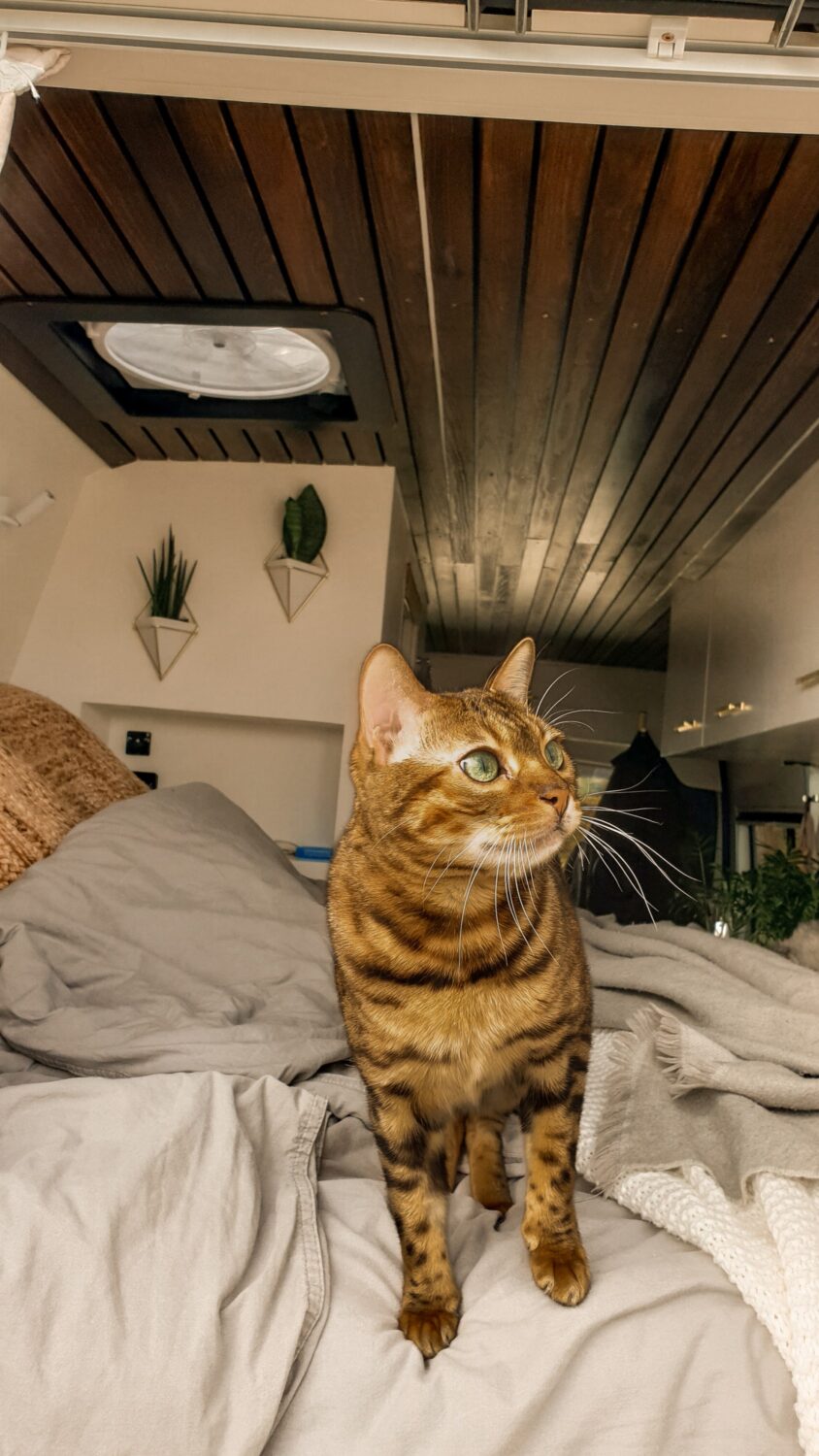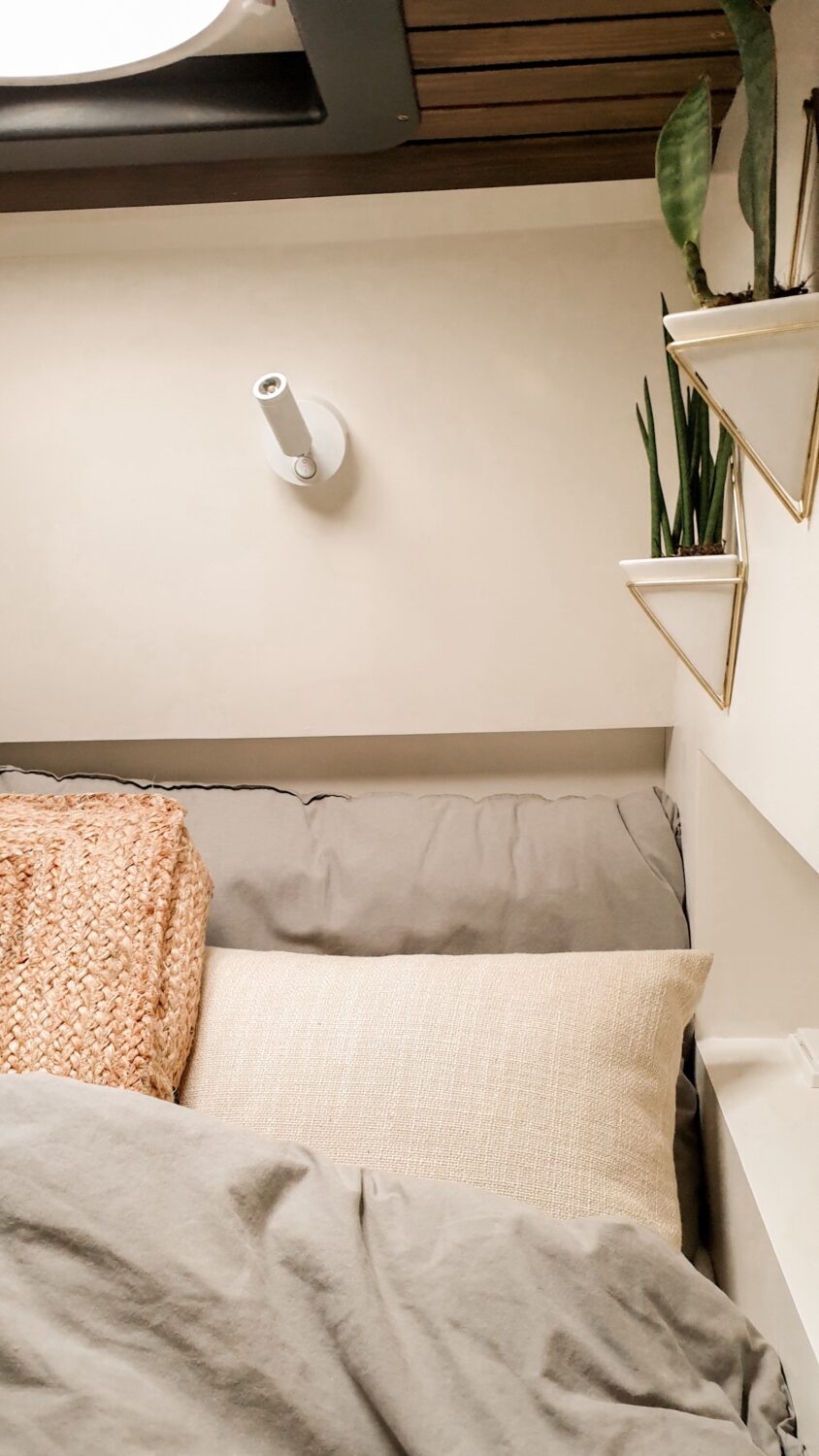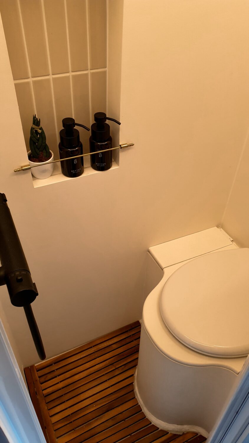 Unser Herbert wurde nach dem Opa von Sabrina benannt und ist das schönste Zuhause, welches wir uns vorstellen können. Wir haben uns ein Jahr Zeit gelassen um ihn nach unseren Vorstellungen in unser Heim auf vier Rädern umzubauen. Da Sabrina unbedingt eine Terrasse wollte und Marius meinte wir haben keinen Platz auf dem Dach, da wir Solarpanels brauchen und unsere Surfboards unterbekommen müssen, ist die Terrasse kurzerhand unter das Bett gewandert, was im Nachhinein die beste Entscheidung war. Somit dient sie als Markise, als Balkon, als Leiter und als Aussichtsplattform wenn man vor einer Klippe parkt. Da wir auf Gas verzichten wollten, haben wir auf ein großes Strom-Setup, mit 800Ah Batteriekapazität, gesetzt und können mit unserem 3000W Wechselrichter sowohl unser Induktionsfeld als auch unseren Haushaltsbackofen betreiben. Mit unserem 150 L Wassertank haben wir jederzeit genügend gefiltertes Wasser um lange autark zu stehen und uns auch mal eine Warme Dusche zu gönnen. Die Nasszelle dient hierbei nicht nur als Dusche/Toilette, sondern durch einen Auslass der Dieselheizung und einem Lüfter im Dach ist sie auch der perfekte Trockner für unsere Wetsuites an Regentagen und Snowboards wenn es mal auf die Piste geht.