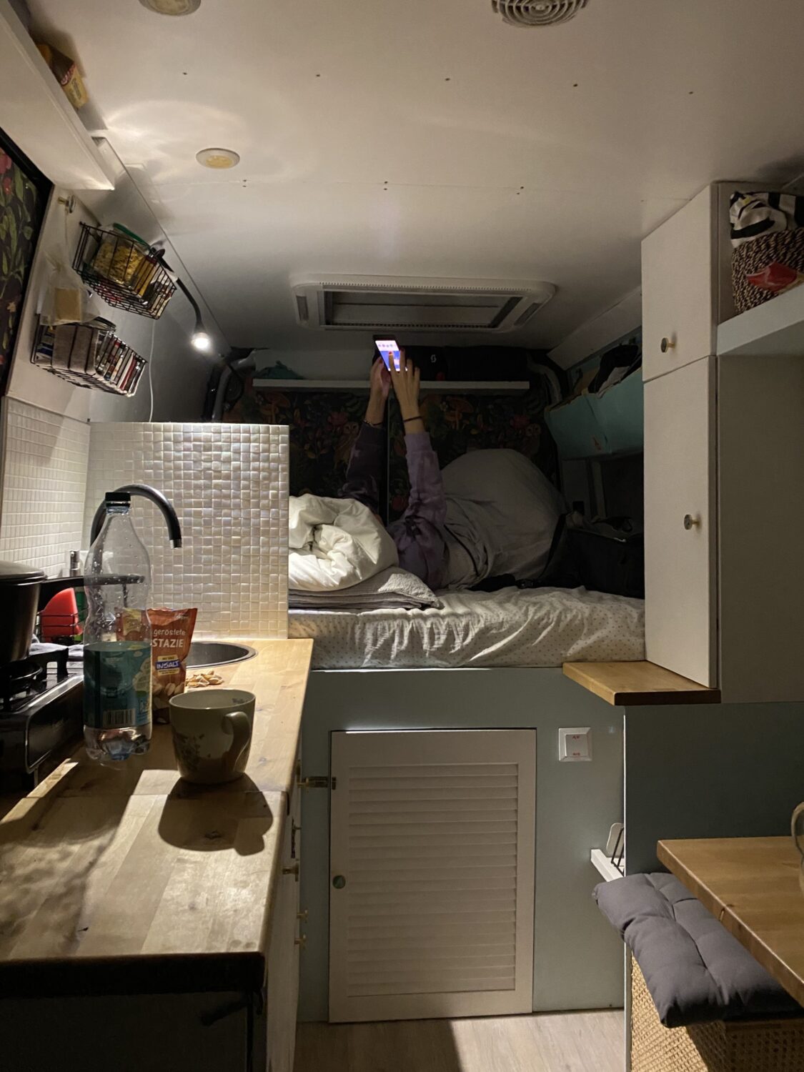 Unser sprintervan ist absolut autark, da wir Campingplätze meiden war das sehr wichtig für uns. Wir haben 80 Liter Frischwassertank und 60 Liter Abwasser, eine 100Ah Lithium Batterie und kochen mit Gas. Besonders glücklich sind wir über warmes Wasser aus dem 6 Liter Boiler. Besonders wichtig war für uns ein möglichst umweltfreundlicher Antrieb. Da sind wir auf CNG gestoßen, also Benziner mit Gasantrieb. Viele Tankstellen bieten inzwischen auch bio Gas an, somit kann man sogar co2 neutral fahren