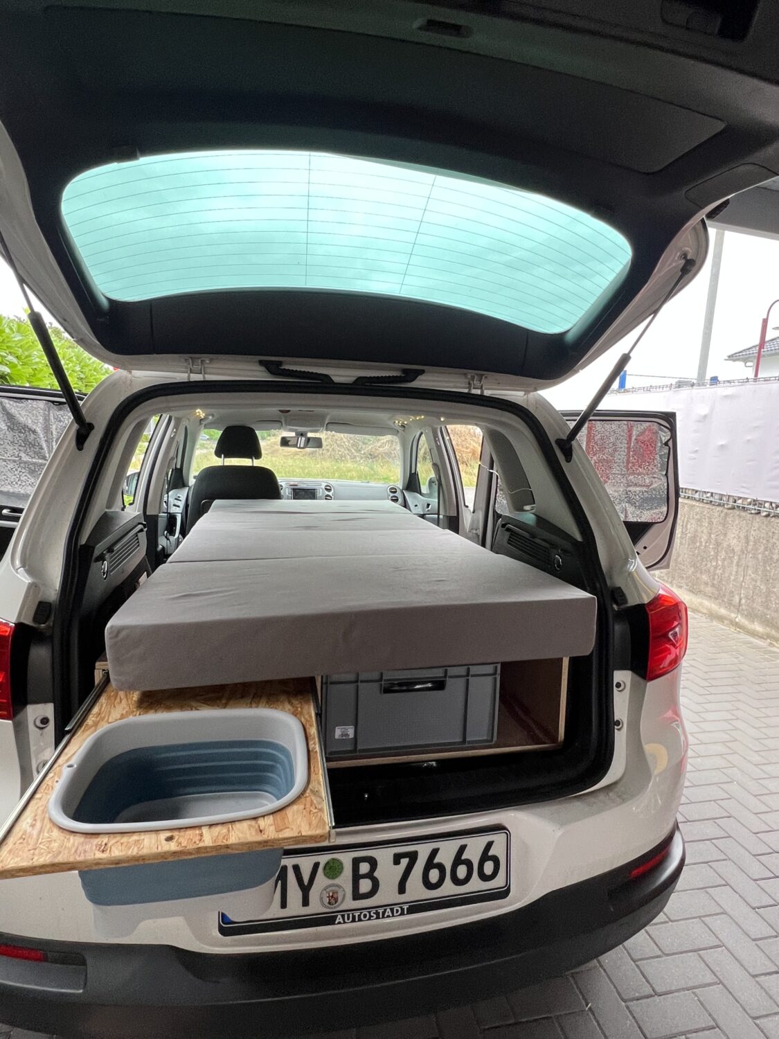 Nach zwei Tagen hab ich die Campingbox fertiggestellt. Die Campingbox lässt sich im Kofferraum verstauen und wird durch das umklappen der Rücksitzbank ausgebreitet. Features sind viel Stauraum trotz Bett und einen Ausziehbaren Tisch mit Spülbecken.