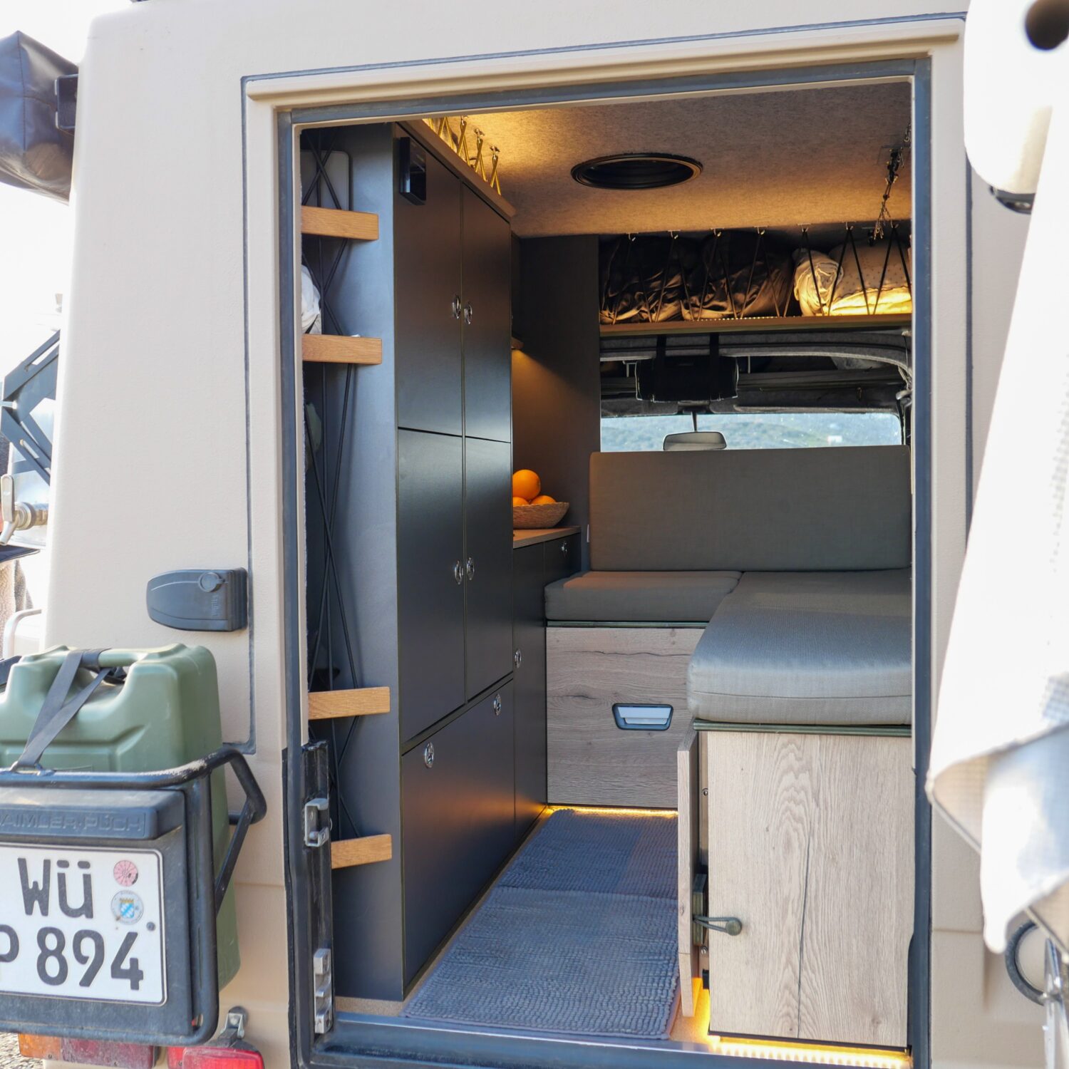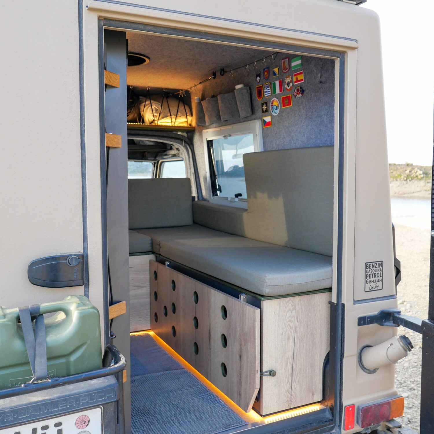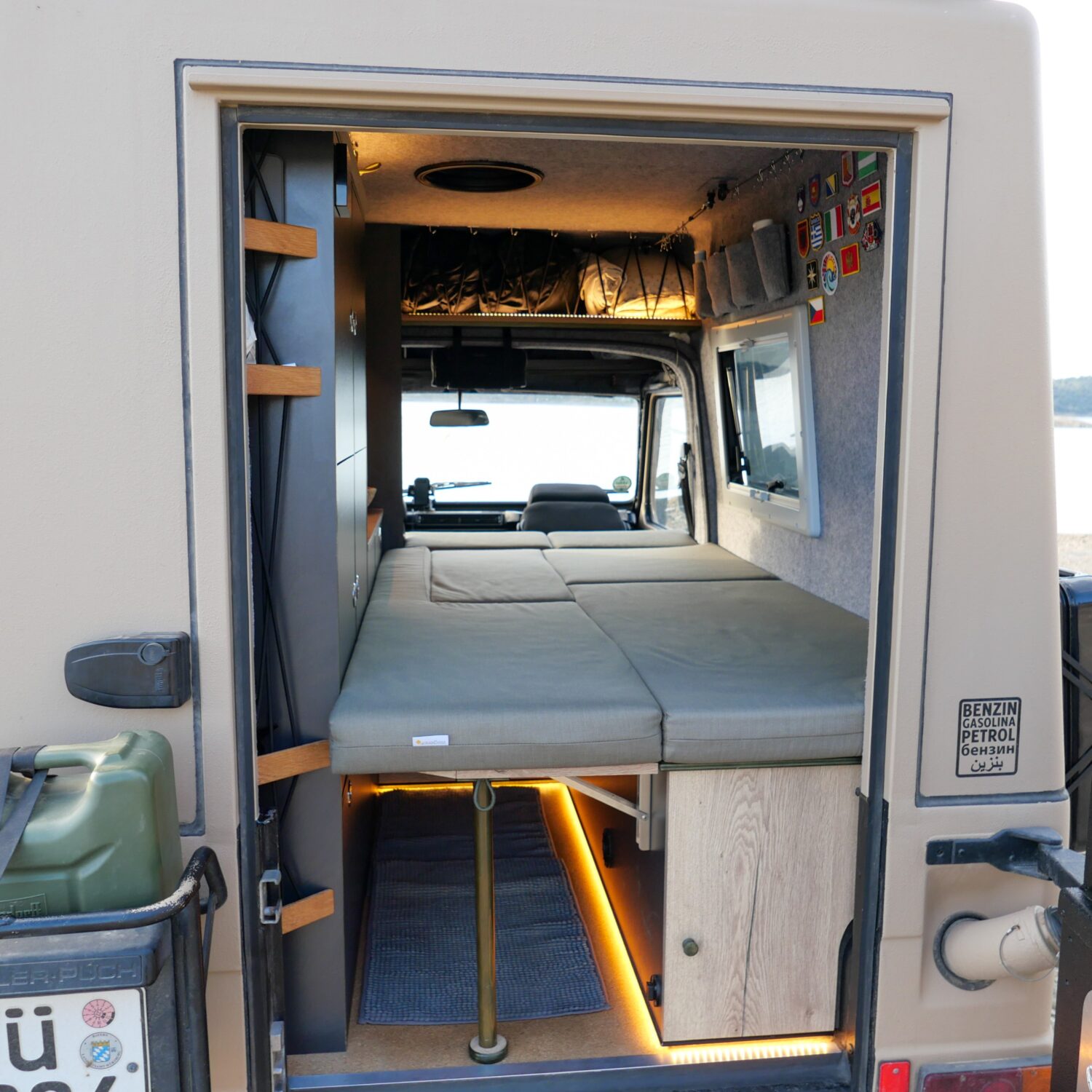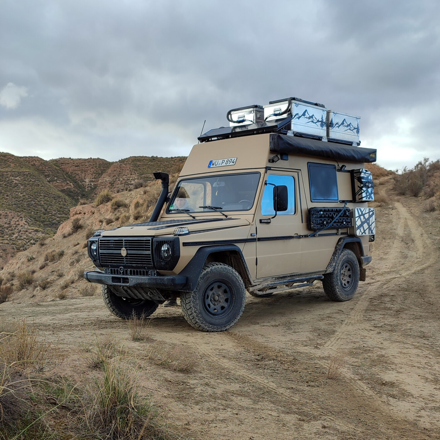 Wir sind Sandra und André, zusammen haben wir in sechs Monaten unseren Puch 230 GE zu einem Abenteuermobil aus- und umgebaut. Unser Puch ist ein ehemaliger Funkwagen des schweizer Militärs. Wir haben ihn so umfangreich umgebaut, dass er nichtmehr als Militärfahrzeug zu erkennen ist. Zusammen mit meinem Onkel habe ich den Innenausbau genau so realisieren können, wie wir uns das vorgestellt und im CAD entworfen haben. Wir haben insgesamt 80 Liter Wasser an Bord und reichlich Stauraum für Lebensmittel, da wir gerne abgelegene Regionen bereisen. Unsre 75ah Lithium Batterie wird durch unsre 190W Solaranlage gespeist.