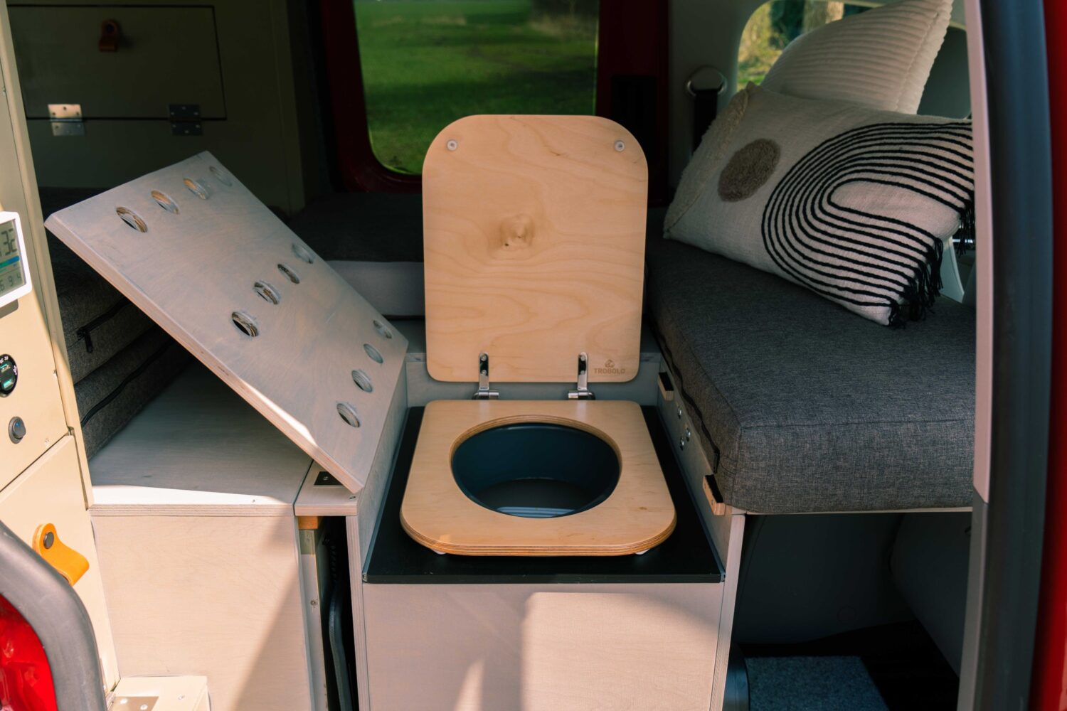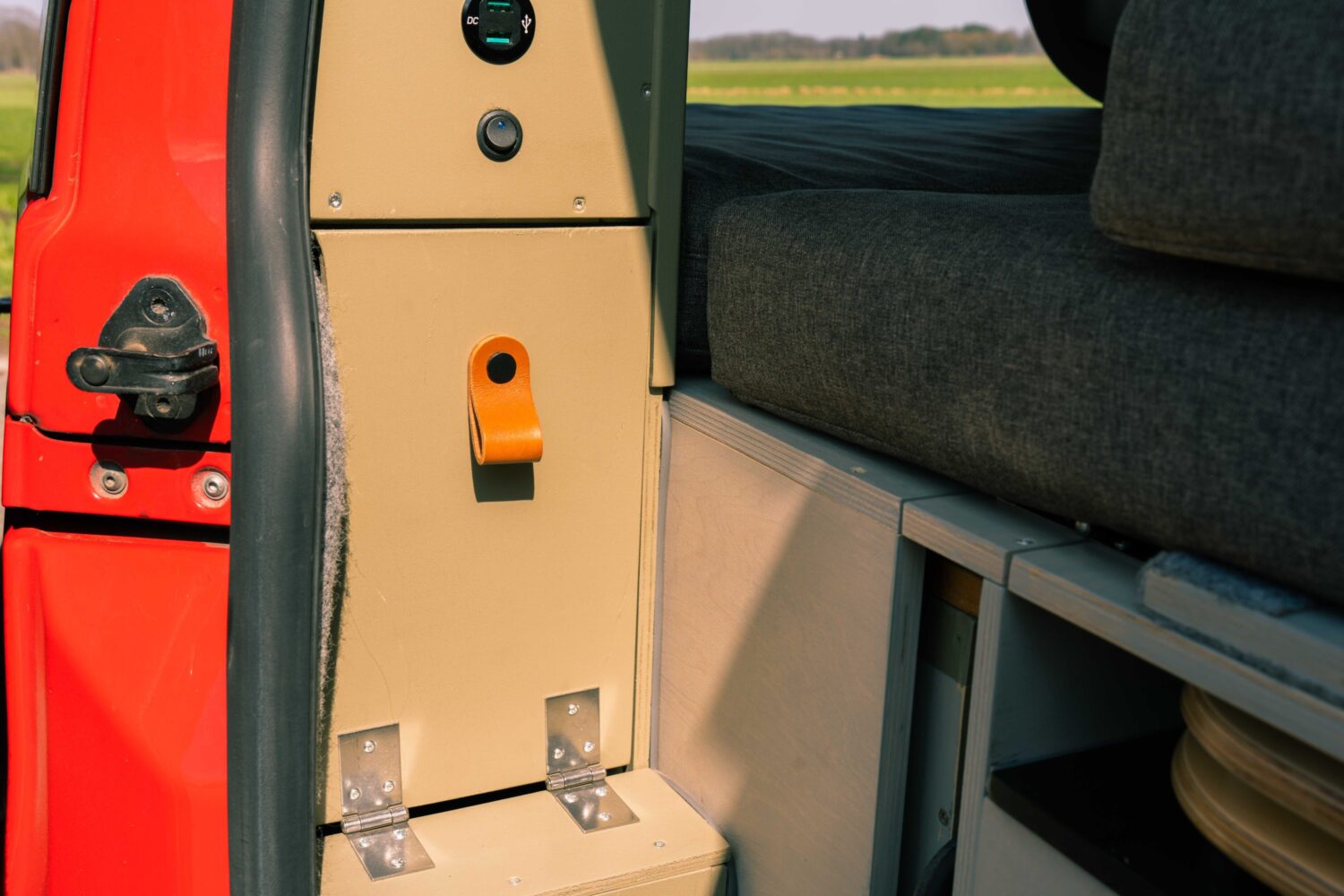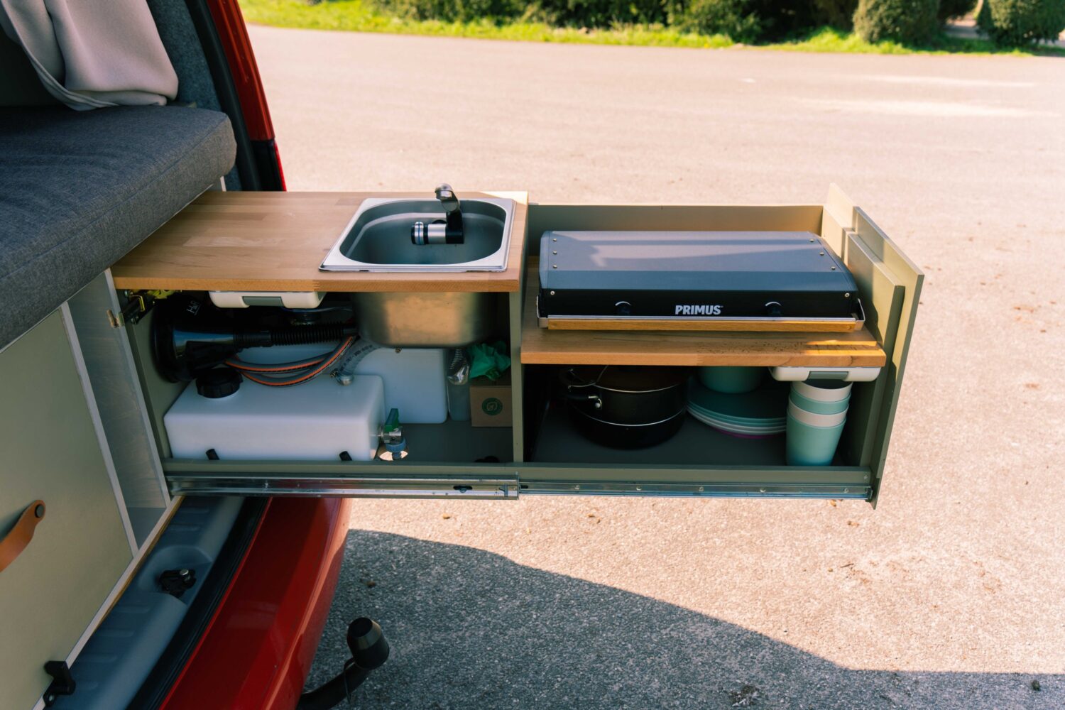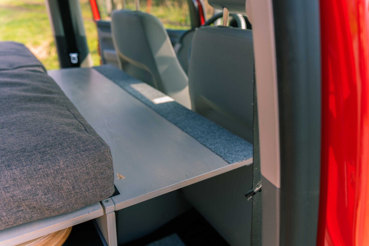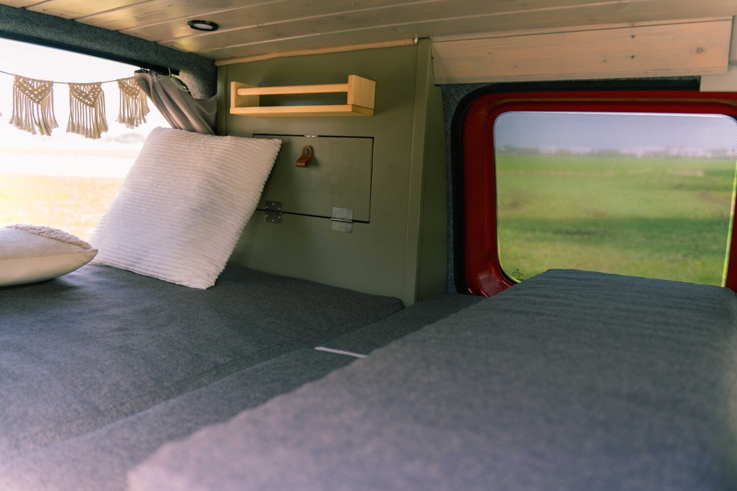 Was hat/kann der Ausbau: -         Bett Konstruktion inkl. Passgenauer Matratze -         Schränke -         Holz Dachhimmel mit 4 Deckenspots -         3 Auszüge -         Tresor / Verschließbare Geheimverstecke -         Trocken- / Trenntoilette o  Trobolo Trenneinsatz o  Behälter von Kildwick -         Strom: 12v& 230v -         Fließend Wasser -         Küchenauszug: o  Ordentlich Platz um für Geschirr / Töpfe etc. o  Kleine Schublade für Besteck o  Platz für einen Campingkocher o  Komplettes Wasser Setup, mit Spüle, Frisch- & Abwassertank -         Kühl- /Aufbewahrungsauszug: o  Dometic CoolFreeze CDF 36 Kompressor-Kühlbox 31l o  Stauraum für alles Was man zum Kochen braucht o  Gewürzregal -         Auszug zur Fahrerseite: o  Dieser Auszug ist perfekt für Eurokisten optimiert -         Dachträger: o  100W Solar Panel o  Dachträger aus Aluprofilen o  Perfekt zum Befestigen von extra Kisten, Stand up Paddleboard, Surfbrett und was das Abenteuerherz noch so wünscht. o  Markise von Ocean Cross 140 x 200cm o  Flaschenöffner :) -         Elektrik: o  Laden über Solar / Solarladeregler o  12v Sicherungskasten o  Spannungsüberwachung und Abschalten aller Verbraucher per Smartphone App o  500 W Ective Wechselrichter 12v auf 230v o  Diverse 12v Steckdosen (USB) o  Lichtschalter o  Lampen in der Decke & in der Heckklappe für Beleuchtung beim kochen o  230v Steckdose -         Gimmicks: o  Heckklappenöffnung von innen o  Gardinen Hinten o  Verschließbares Fach hinter dem Fahrersitz o  Verschließbarer „Tresor- unterm Beifahrersitz o  Ventilator für die heißen Tage -         Außerdem mit dabei: o  Project Camper Magnet Thermomatten (Schwarz/Grau) für Vorne und die Seiten  Es gibt garantiert noch so viele Dinge die wir jetzt hier nicht aufgeführt haben, am besten macht man sich mal einen persönlichen Eindruck vom Auto.