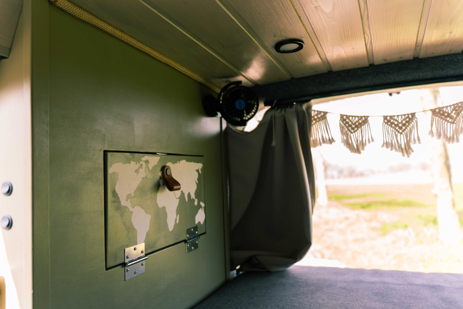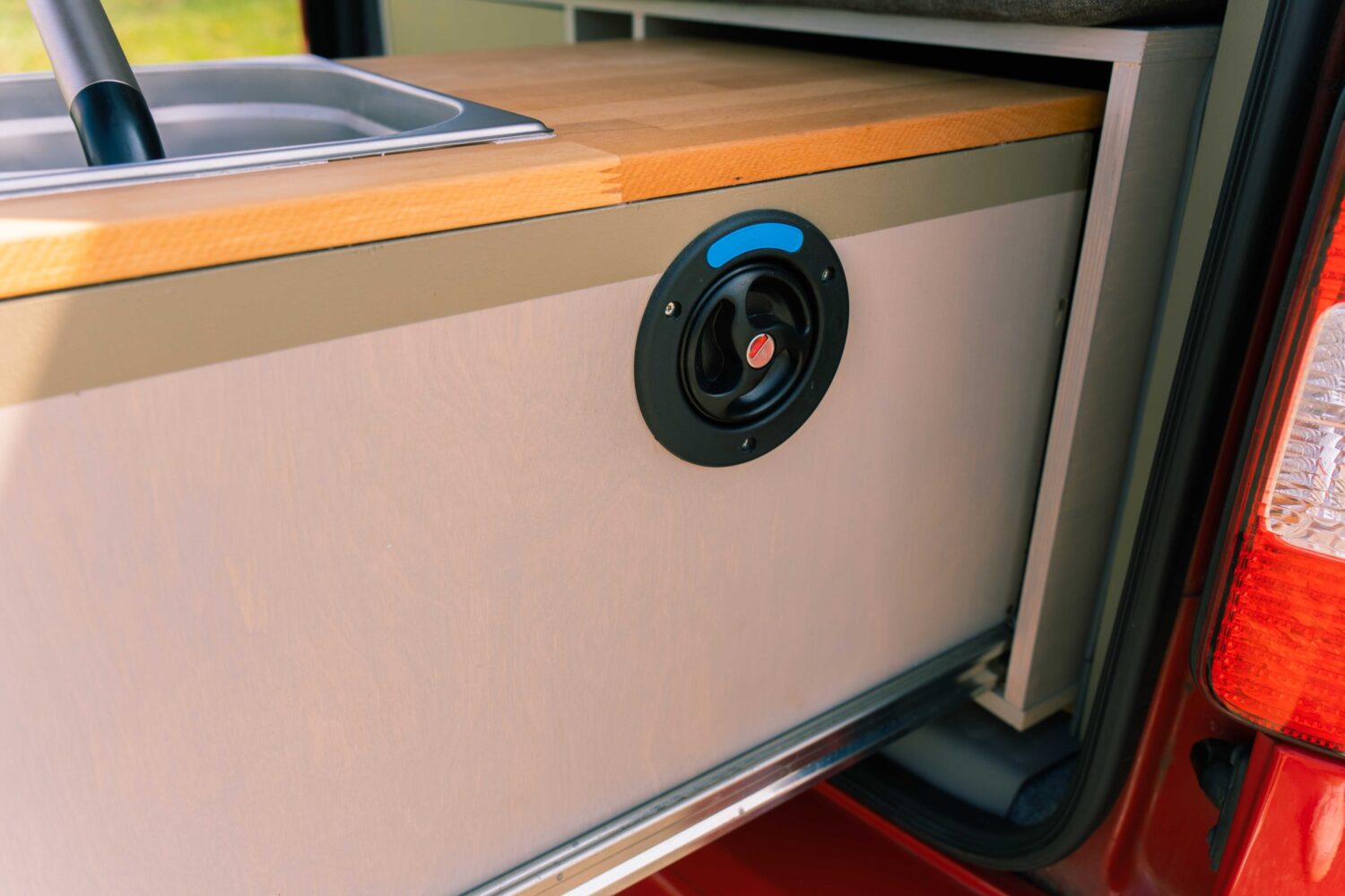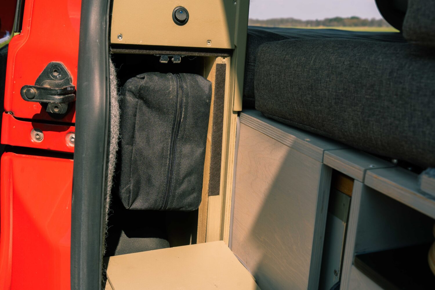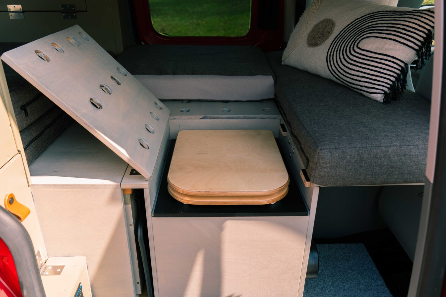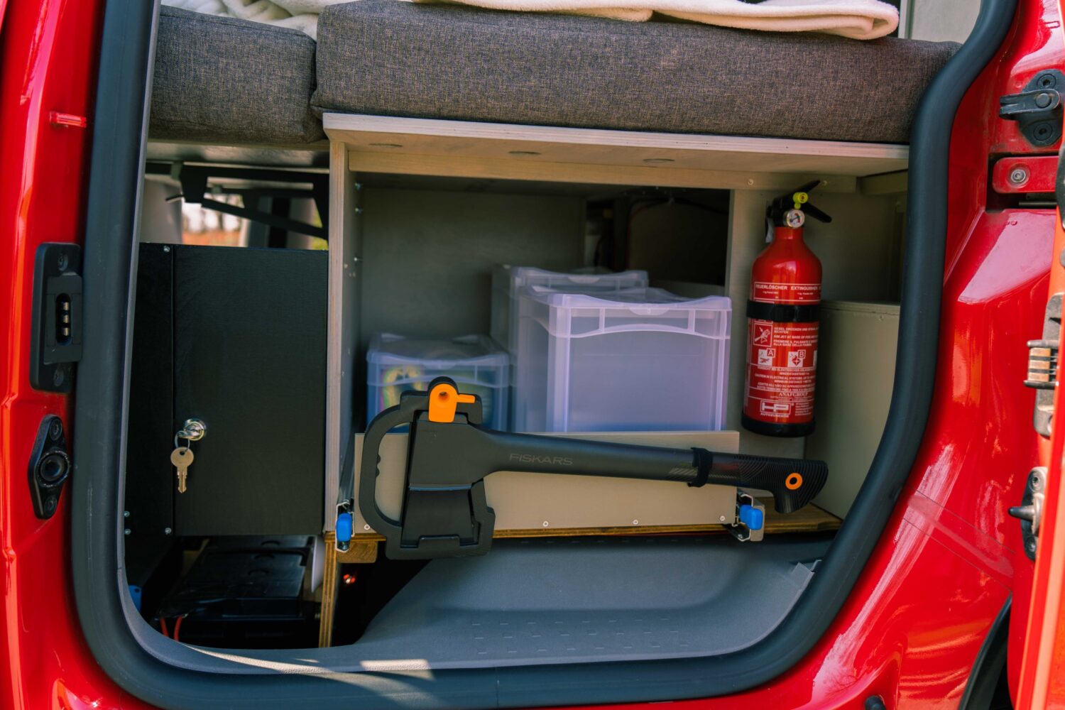 Was hat/kann der Ausbau: -         Bett Konstruktion inkl. Passgenauer Matratze -         Schränke -         Holz Dachhimmel mit 4 Deckenspots -         3 Auszüge -         Tresor / Verschließbare Geheimverstecke -         Trocken- / Trenntoilette o  Trobolo Trenneinsatz o  Behälter von Kildwick -         Strom: 12v& 230v -         Fließend Wasser -         Küchenauszug: o  Ordentlich Platz um für Geschirr / Töpfe etc. o  Kleine Schublade für Besteck o  Platz für einen Campingkocher o  Komplettes Wasser Setup, mit Spüle, Frisch- & Abwassertank -         Kühl- /Aufbewahrungsauszug: o  Dometic CoolFreeze CDF 36 Kompressor-Kühlbox 31l o  Stauraum für alles Was man zum Kochen braucht o  Gewürzregal -         Auszug zur Fahrerseite: o  Dieser Auszug ist perfekt für Eurokisten optimiert -         Dachträger: o  100W Solar Panel o  Dachträger aus Aluprofilen o  Perfekt zum Befestigen von extra Kisten, Stand up Paddleboard, Surfbrett und was das Abenteuerherz noch so wünscht. o  Markise von Ocean Cross 140 x 200cm o  Flaschenöffner :) -         Elektrik: o  Laden über Solar / Solarladeregler o  12v Sicherungskasten o  Spannungsüberwachung und Abschalten aller Verbraucher per Smartphone App o  500 W Ective Wechselrichter 12v auf 230v o  Diverse 12v Steckdosen (USB) o  Lichtschalter o  Lampen in der Decke & in der Heckklappe für Beleuchtung beim kochen o  230v Steckdose -         Gimmicks: o  Heckklappenöffnung von innen o  Gardinen Hinten o  Verschließbares Fach hinter dem Fahrersitz o  Verschließbarer „Tresor- unterm Beifahrersitz o  Ventilator für die heißen Tage -         Außerdem mit dabei: o  Project Camper Magnet Thermomatten (Schwarz/Grau) für Vorne und die Seiten  Es gibt garantiert noch so viele Dinge die wir jetzt hier nicht aufgeführt haben, am besten macht man sich mal einen persönlichen Eindruck vom Auto.
