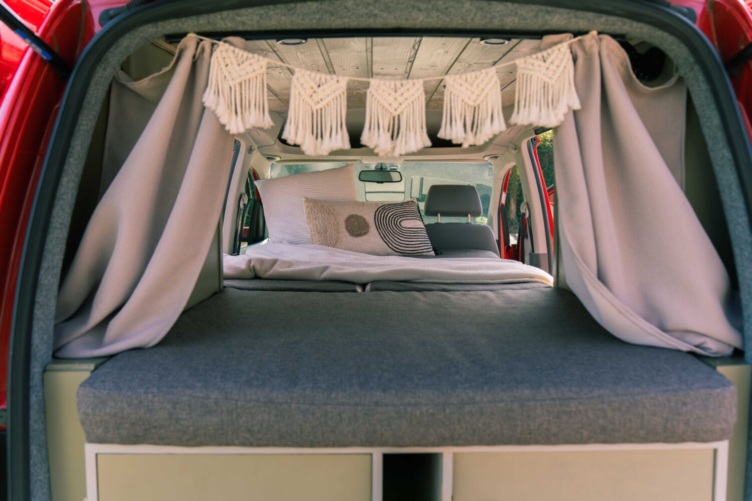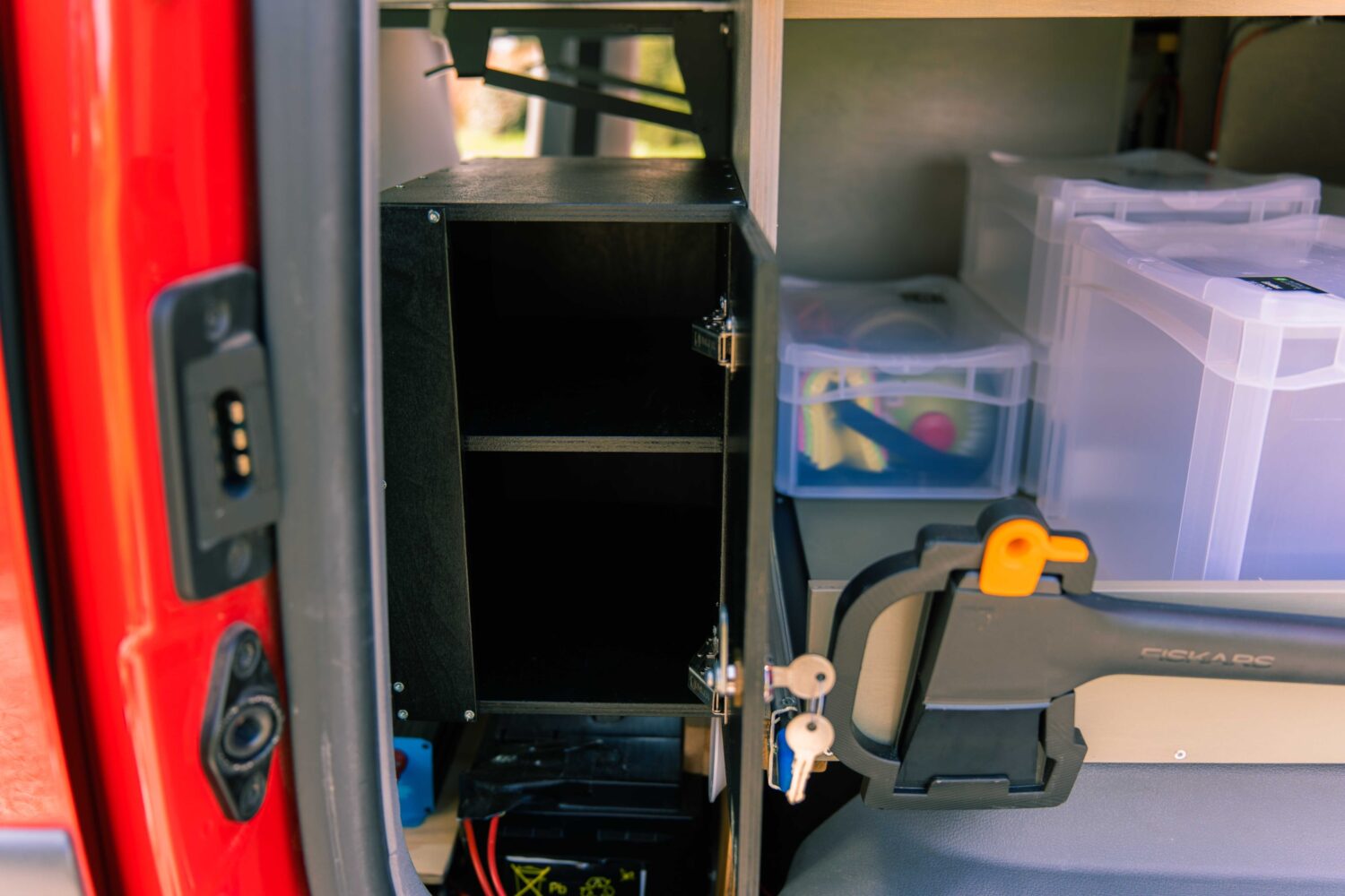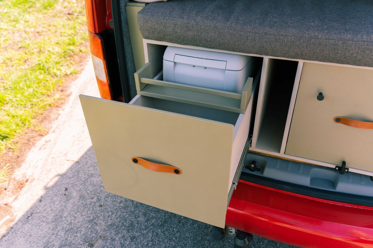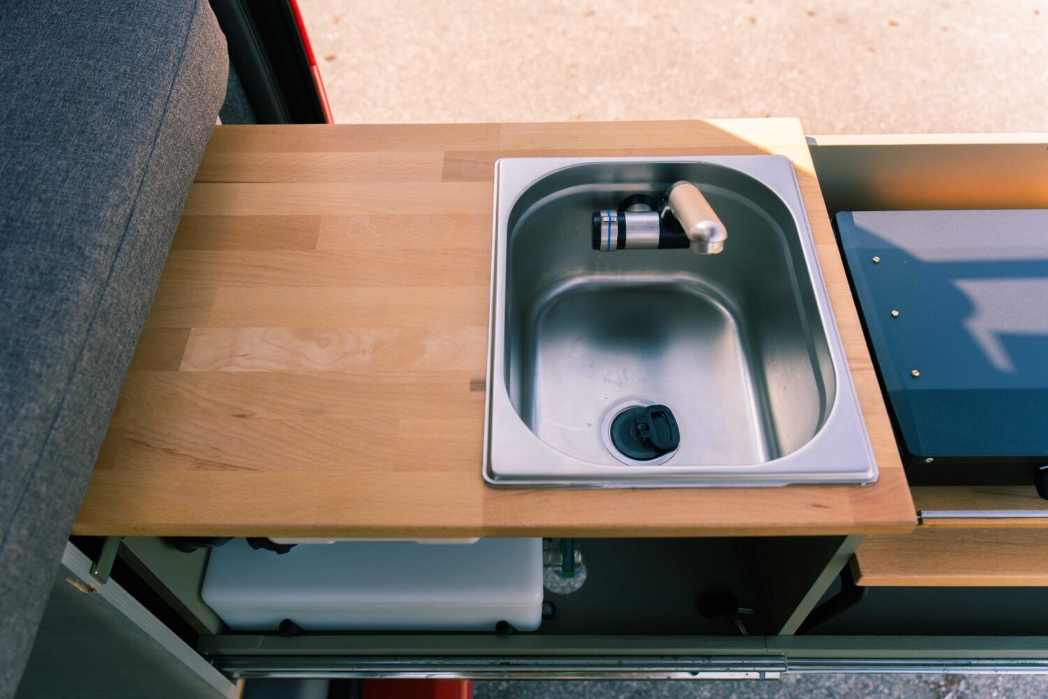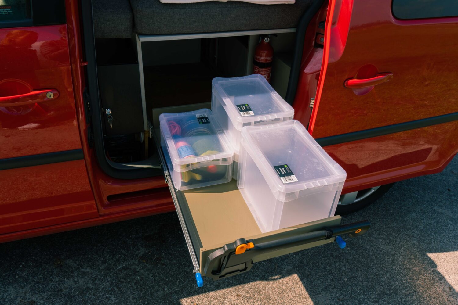 Was hat/kann der Ausbau: -         Bett Konstruktion inkl. Passgenauer Matratze -         Schränke -         Holz Dachhimmel mit 4 Deckenspots -         3 Auszüge -         Tresor / Verschließbare Geheimverstecke -         Trocken- / Trenntoilette o  Trobolo Trenneinsatz o  Behälter von Kildwick -         Strom: 12v& 230v -         Fließend Wasser -         Küchenauszug: o  Ordentlich Platz um für Geschirr / Töpfe etc. o  Kleine Schublade für Besteck o  Platz für einen Campingkocher o  Komplettes Wasser Setup, mit Spüle, Frisch- & Abwassertank -         Kühl- /Aufbewahrungsauszug: o  Dometic CoolFreeze CDF 36 Kompressor-Kühlbox 31l o  Stauraum für alles Was man zum Kochen braucht o  Gewürzregal -         Auszug zur Fahrerseite: o  Dieser Auszug ist perfekt für Eurokisten optimiert -         Dachträger: o  100W Solar Panel o  Dachträger aus Aluprofilen o  Perfekt zum Befestigen von extra Kisten, Stand up Paddleboard, Surfbrett und was das Abenteuerherz noch so wünscht. o  Markise von Ocean Cross 140 x 200cm o  Flaschenöffner :) -         Elektrik: o  Laden über Solar / Solarladeregler o  12v Sicherungskasten o  Spannungsüberwachung und Abschalten aller Verbraucher per Smartphone App o  500 W Ective Wechselrichter 12v auf 230v o  Diverse 12v Steckdosen (USB) o  Lichtschalter o  Lampen in der Decke & in der Heckklappe für Beleuchtung beim kochen o  230v Steckdose -         Gimmicks: o  Heckklappenöffnung von innen o  Gardinen Hinten o  Verschließbares Fach hinter dem Fahrersitz o  Verschließbarer „Tresor- unterm Beifahrersitz o  Ventilator für die heißen Tage -         Außerdem mit dabei: o  Project Camper Magnet Thermomatten (Schwarz/Grau) für Vorne und die Seiten  Es gibt garantiert noch so viele Dinge die wir jetzt hier nicht aufgeführt haben, am besten macht man sich mal einen persönlichen Eindruck vom Auto.
