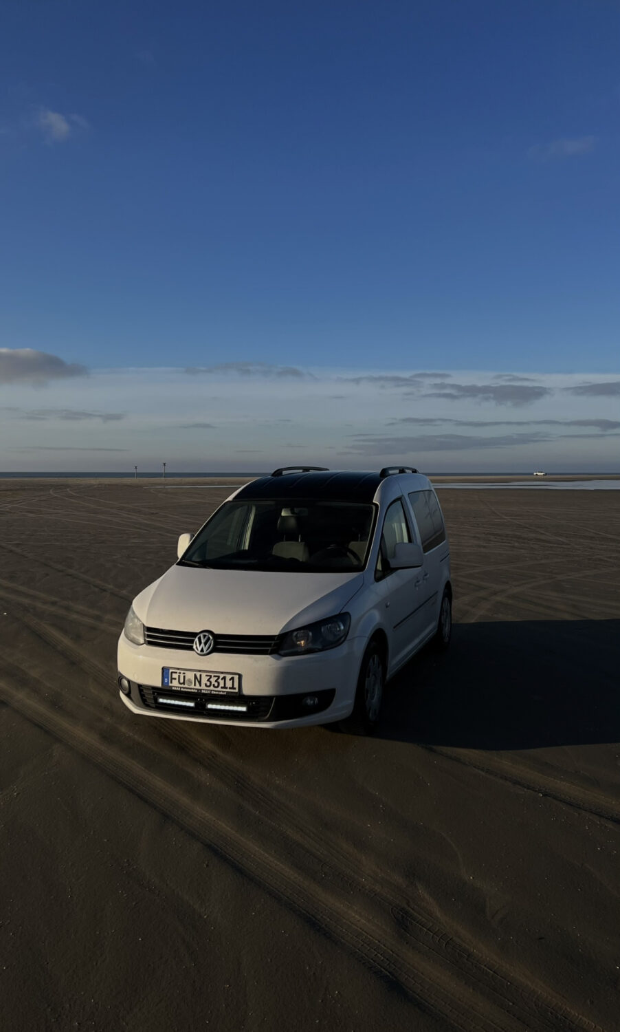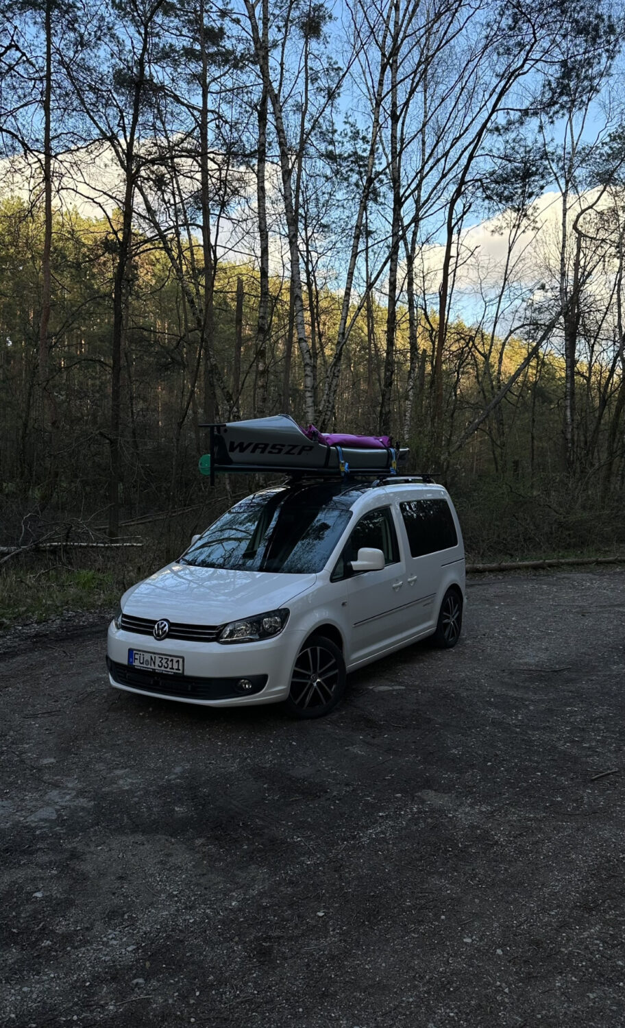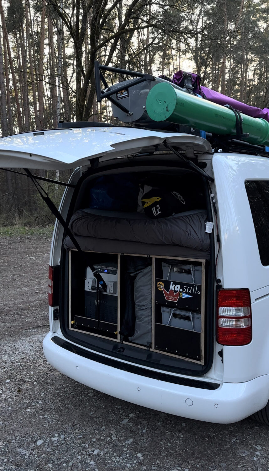 Ich habe mir diesen Caddy gekauft weil ich einen kleinen Camper für meine Segel & Regatta Reisen haben wollte. Da die 5 vollwertigen Sitzplätze an erster stelle für mich standen habe ich mich für einen Heckausbau entschieden der immer im Auto bleiben kann ohne mir Sitzplätze zu klauen. Die Grundbox ist aus Siebdruckplatten und enthält ein Lastenauszug für meine DOMETIC 35 Kühlbox. In der Mitte ist eine Tasche für die Bettdecke, Kissen und Kleidung. Hinter der Tasche sind 3 kleine Campingstühle von Decathlon verstaut. Rechts in der Box befinden sich 2 Auszüge mit 2 Euroboxen. Diese bilden meine Küche mit Küchenutensilien. Hinter den Auszügen befindet sich mein Akkusystem von Anker kombiniert mit einem auf mein Dach geklebter flexiblen Solarplatte von Ecoflow. Mir war es wichtig das das Solar flach auf dem Dach montiert ist, da ich mein Boot auf Dachträgern dabei habe.