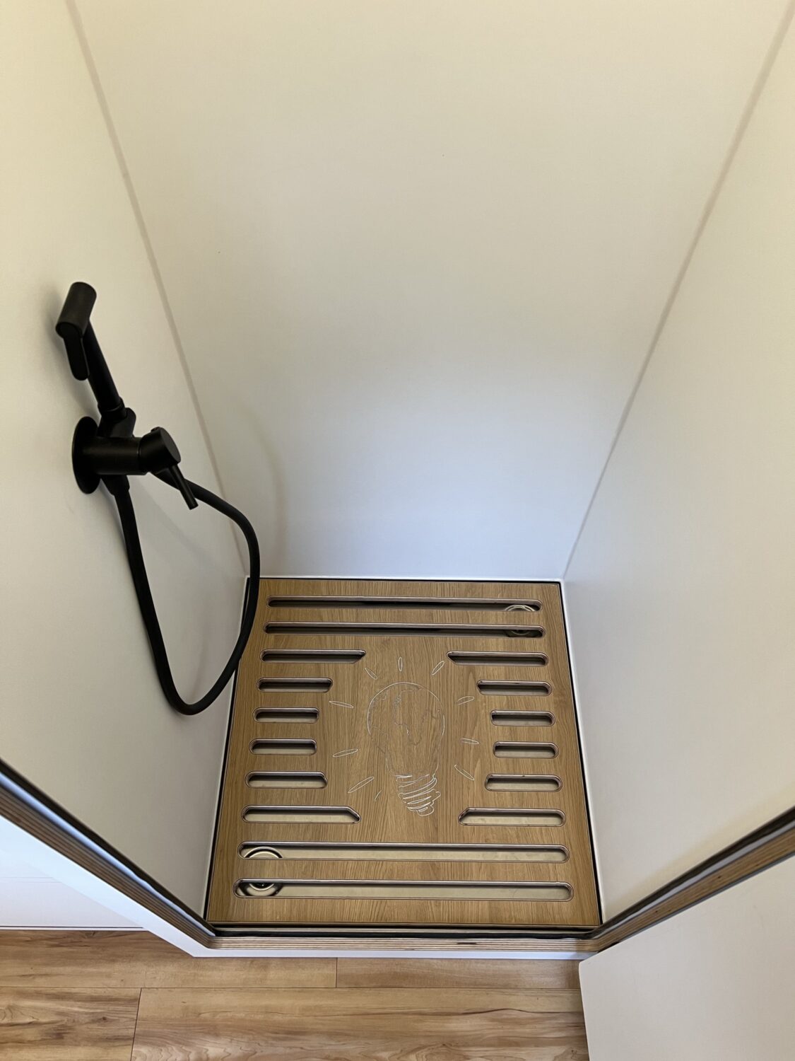Es ist eine Dusche verbaut. Das Abwassersystem läuft gemeinsam mit der Waschbecken über eine Zerhackerpumpe.