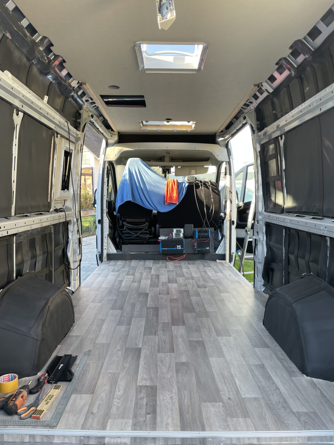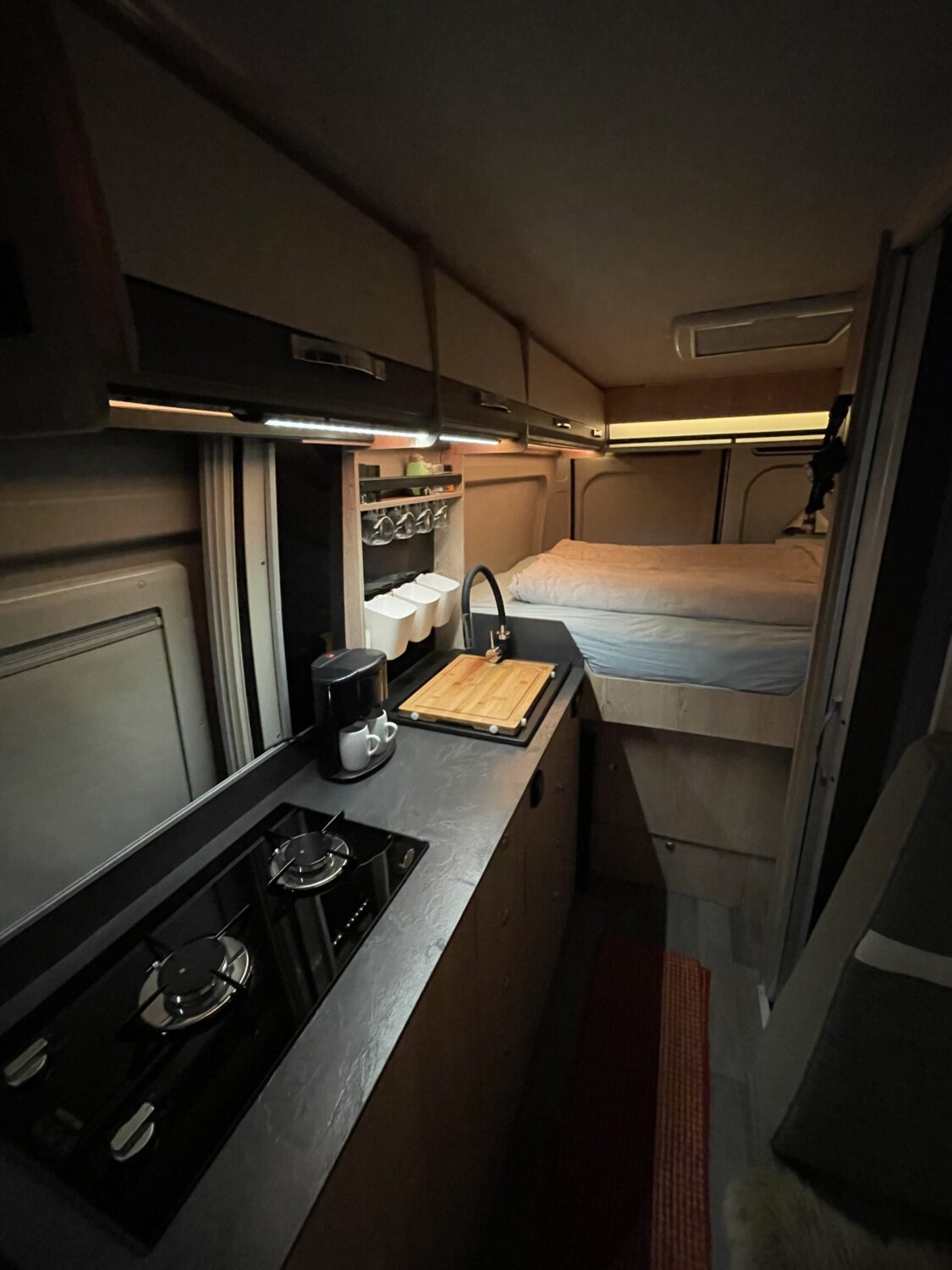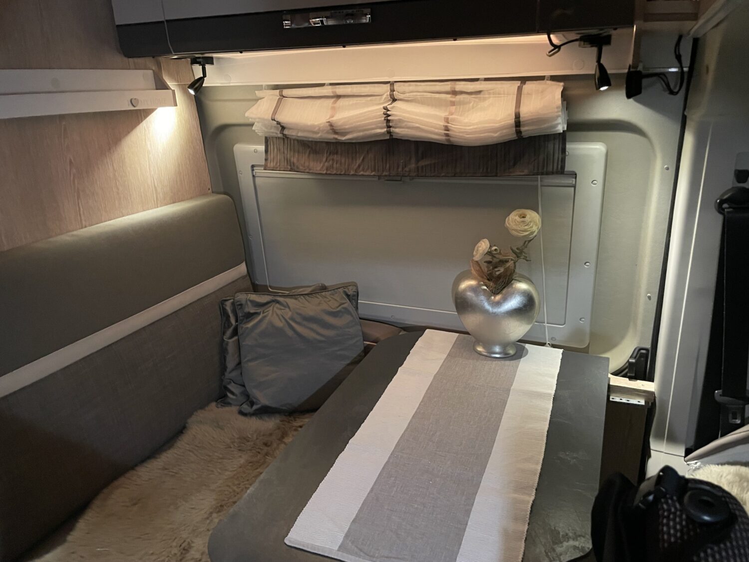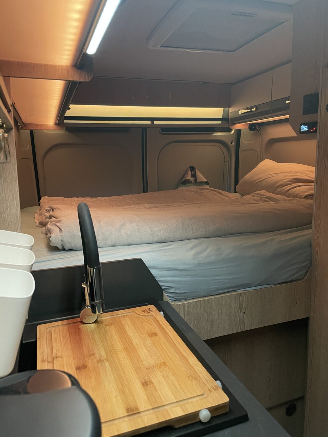Fertig wird man ja eigentlich nie, aber die erste Version hat ca. 4 Monate gedauert. Danach konnte man schon von einem Campervan sprechen. Im Van ist so ziemlich alles verbaut, angefachten beim klassischen Kastenwagenlayout, sind eine Dieselstandheizung, Solarpanel, Gaskochfeld, 100l Frischwasser und 70 Liter Abwasser am Start. Alexa für die Steuerung des Licht und zum Hören der täglichen Nachrichten durfte auch nicht fehlen. Das große Touchpad und die Magnetverdunklung furchten natürlich nicht fehlen. Aber am Besten gefällt mir der 189PS Automatikantrieb.