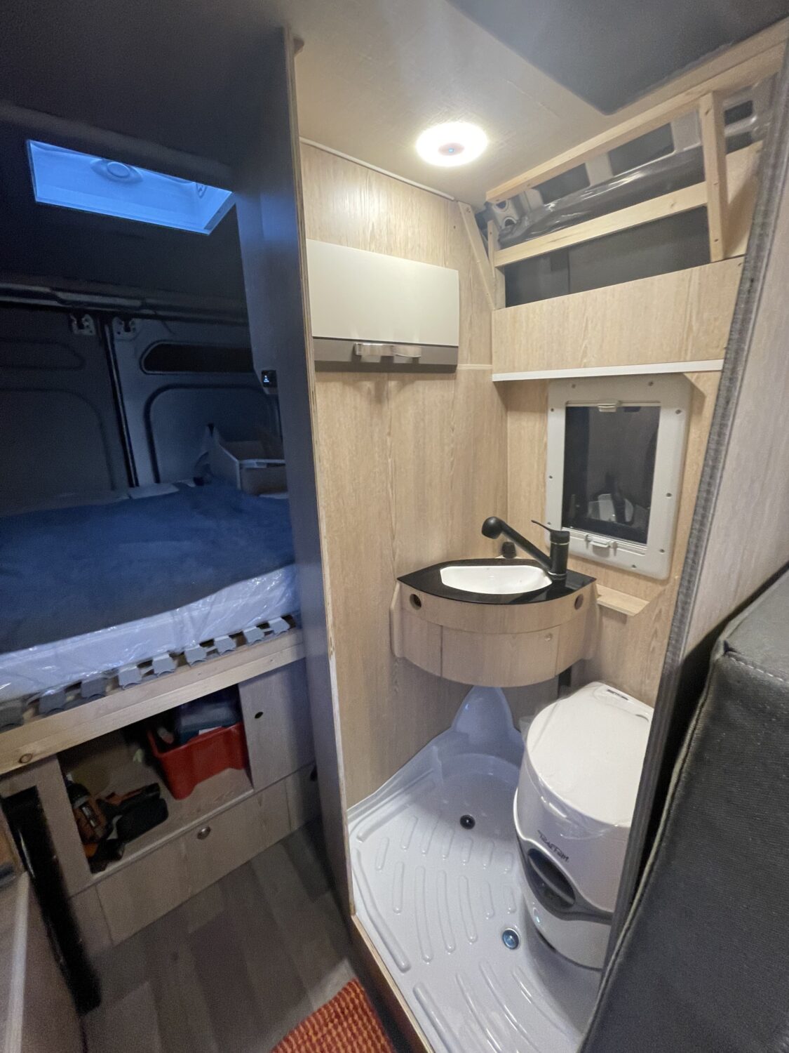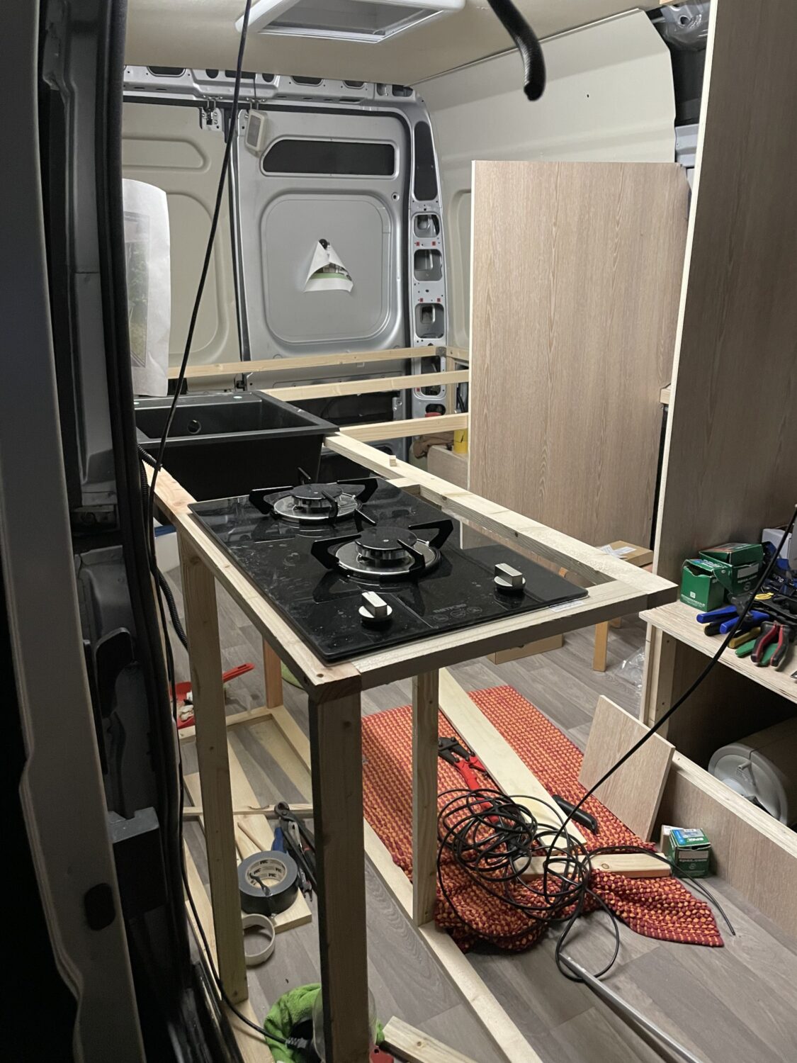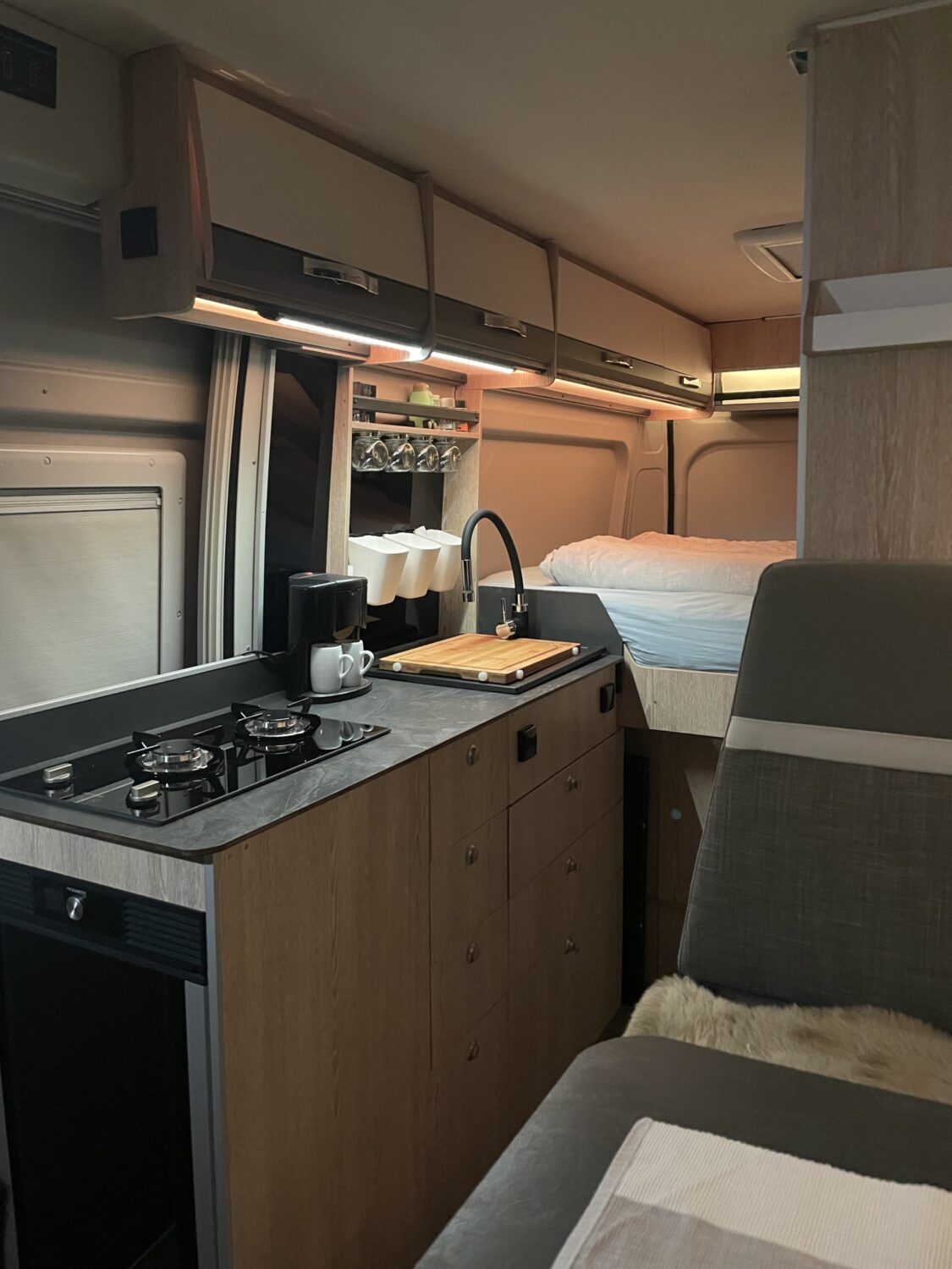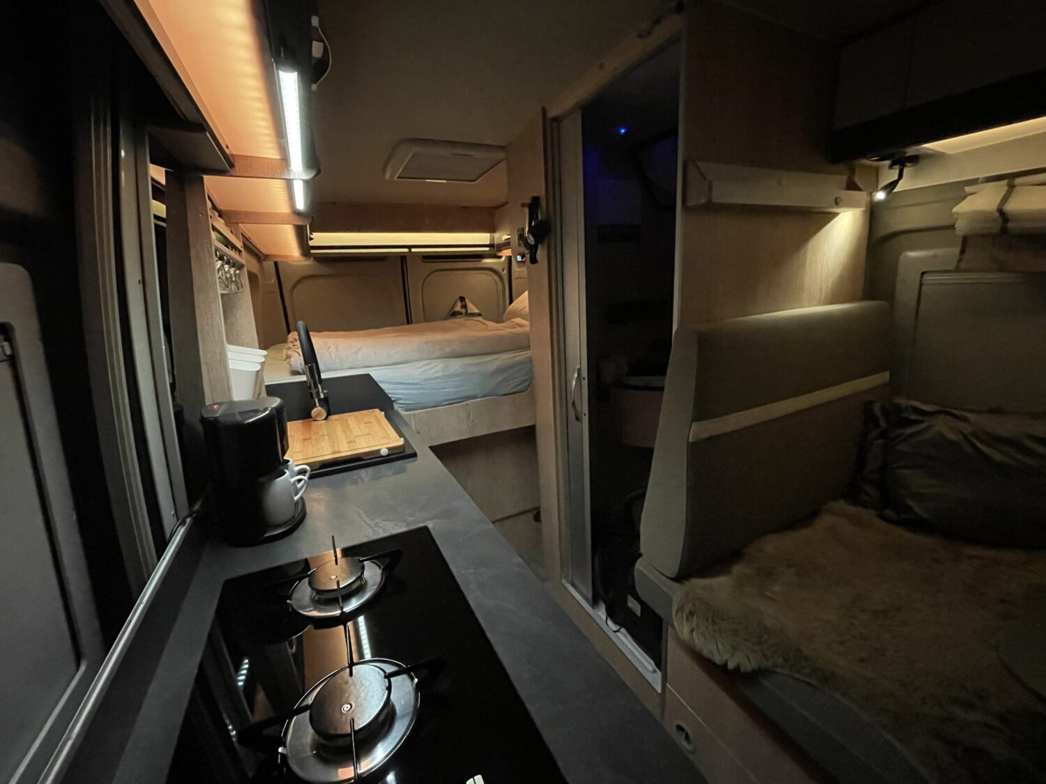 Fertig wird man ja eigentlich nie, aber die erste Version hat ca. 4 Monate gedauert. Danach konnte man schon von einem Campervan sprechen. Im Van ist so ziemlich alles verbaut, angefachten beim klassischen Kastenwagenlayout, sind eine Dieselstandheizung, Solarpanel, Gaskochfeld, 100l Frischwasser und 70 Liter Abwasser am Start. Alexa für die Steuerung des Licht und zum Hören der täglichen Nachrichten durfte auch nicht fehlen. Das große Touchpad und die Magnetverdunklung furchten natürlich nicht fehlen. Aber am Besten gefällt mir der 189PS Automatikantrieb.