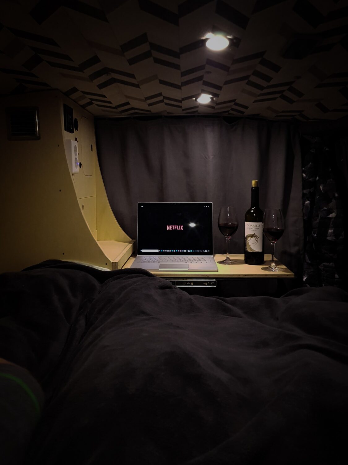 Der grobe Ausbau hat ca. 2 Monate gedauert. Aber wirklich fertig sind wir noch nicht. Wir finden immer wieder was zum basteln. Wir Duschen im Freien aber haben einen Warmwasserboiler verbaut das es auch bei kalten Temperatur angenehm ist zu duschen. Besonders Stolz sind wir auf unsere Schwerlastauzüge. Der seitliche Auszug dient uns unteranderem als Tisch was sehr sehr praktisch ist. Auch bei Regen können wir zu zweit gemütlich innen sitzen und unser Essen genießen. Wir sind super happy mit dem Ergebniss!
