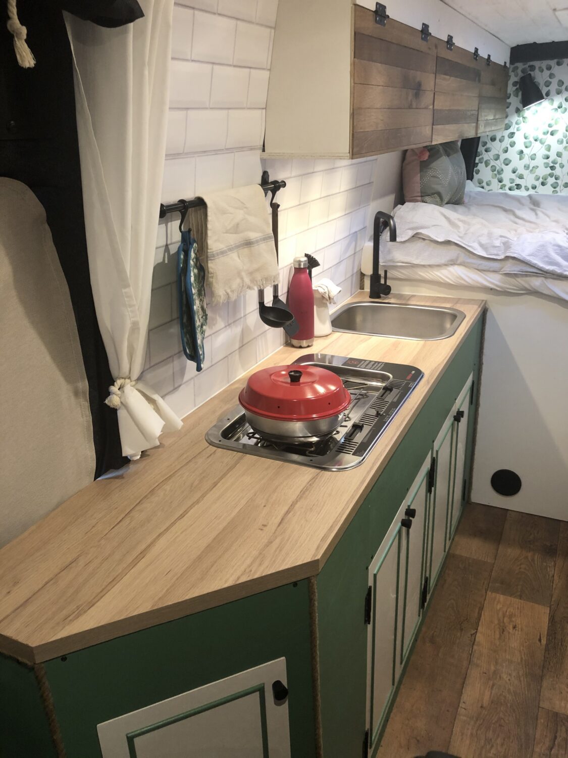 Ausbaudauer 1Jahr neben dem Beruf. Eine großes ca.180cm mal 174cm fest verbautes Bett, kleines aber feines Bad(Dusche mit PottaPorti) Küche mit einem fest verbauten Dometic Spiritus-Kocher. Natürlich Kühlschrank, Solar und Lithium-Ionen-Batterie. Besonders stolz sind wir auf die Dusche und die 4 Sitzplätze :)