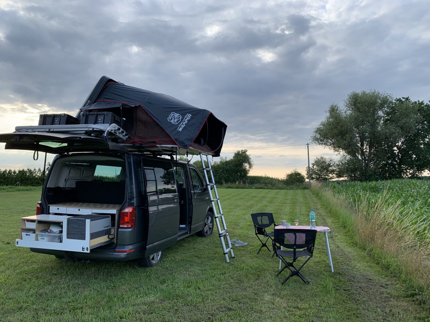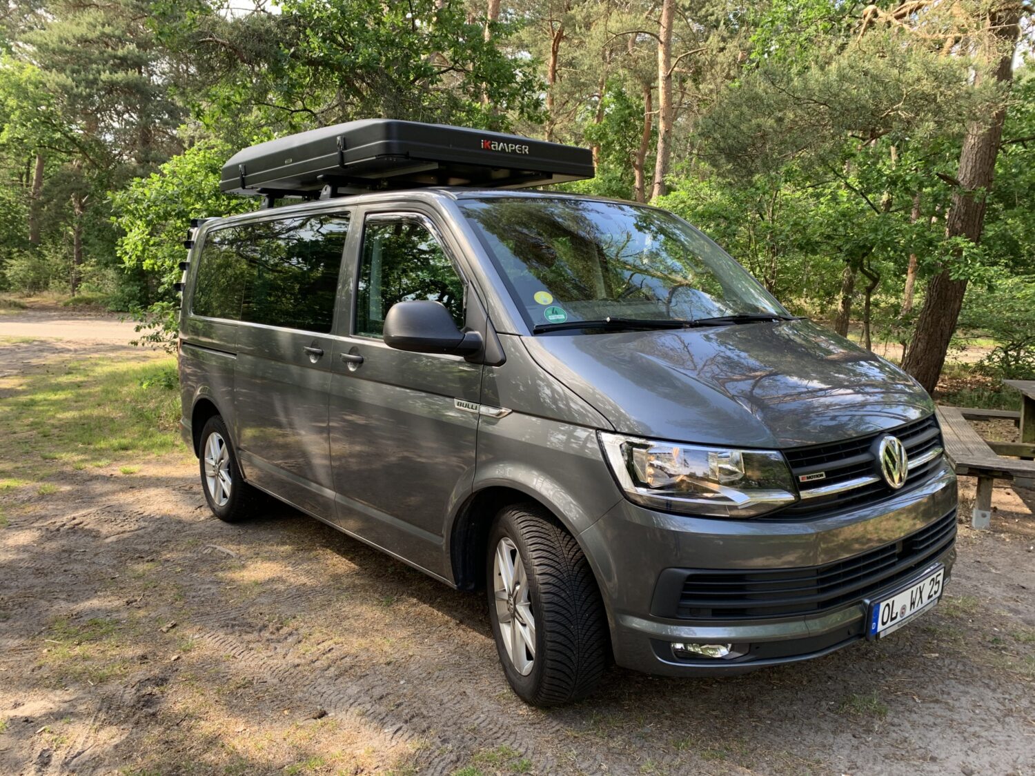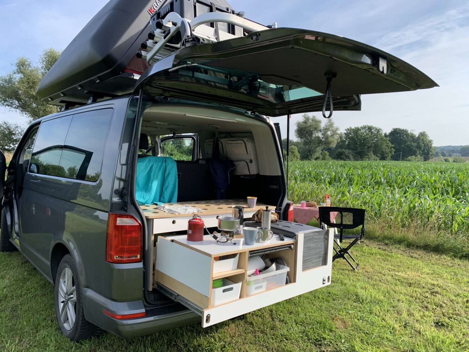 Wir fahren einen Multivan, der im Alltag auch mal mit allen Sitzen seinen Dienst tun muss. Für die kleine Freiheit gibt es eine selbst gebaute Heckküche mit Kompressorbox, Wasser und Kocher. Für die große Freiheit gibt es das iKamper Dachzelt. Es ist unser 6. Bulli und für uns einfach perfekt!