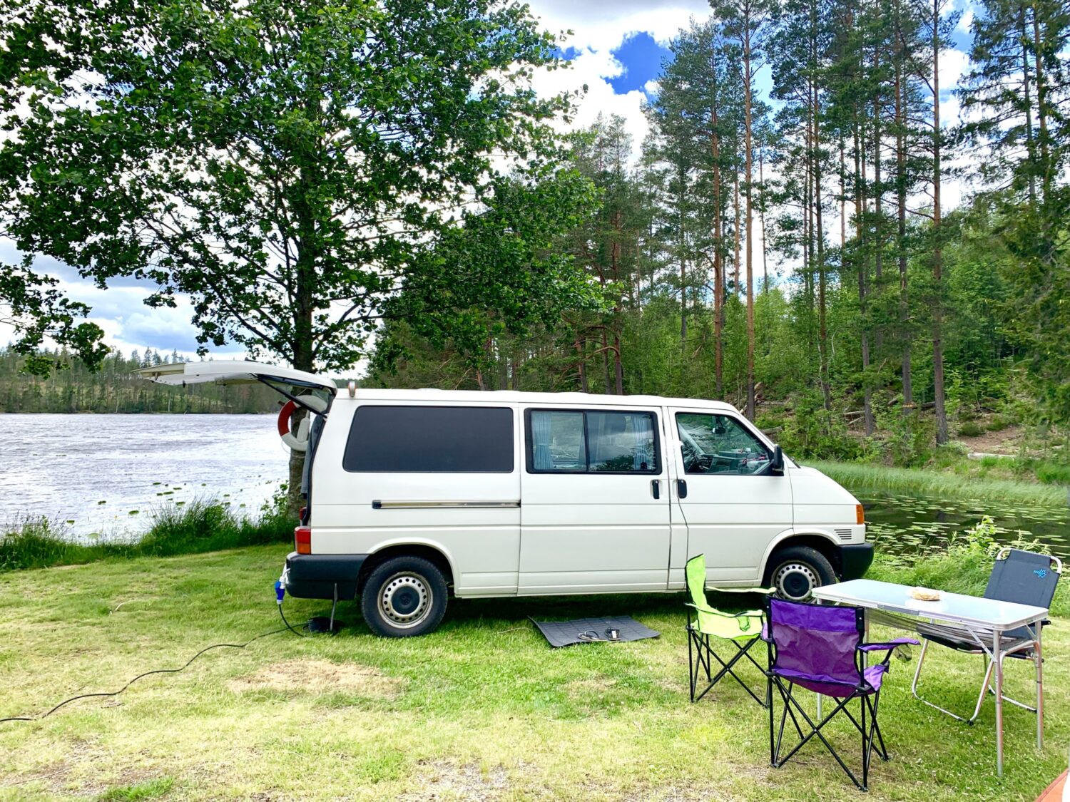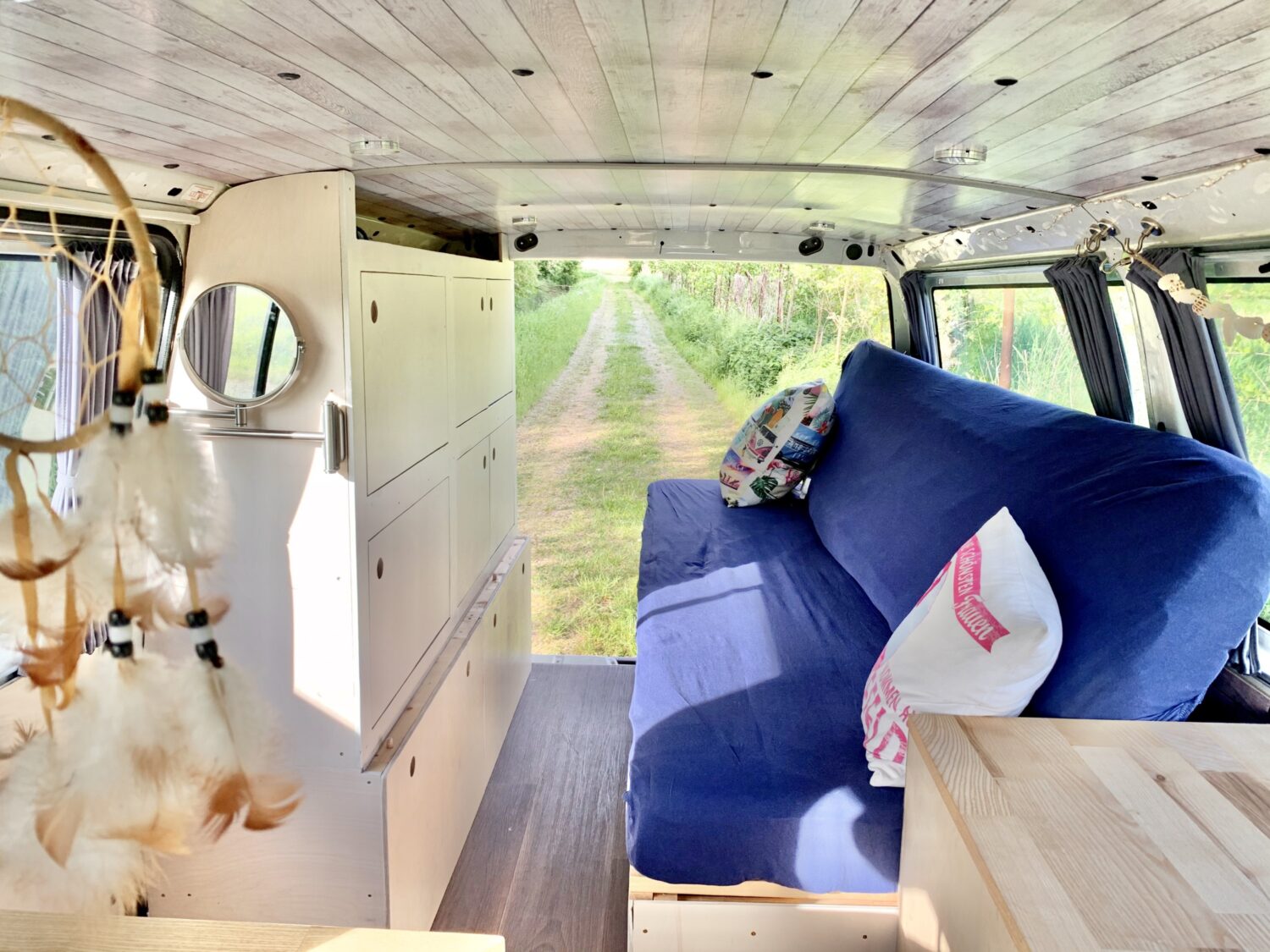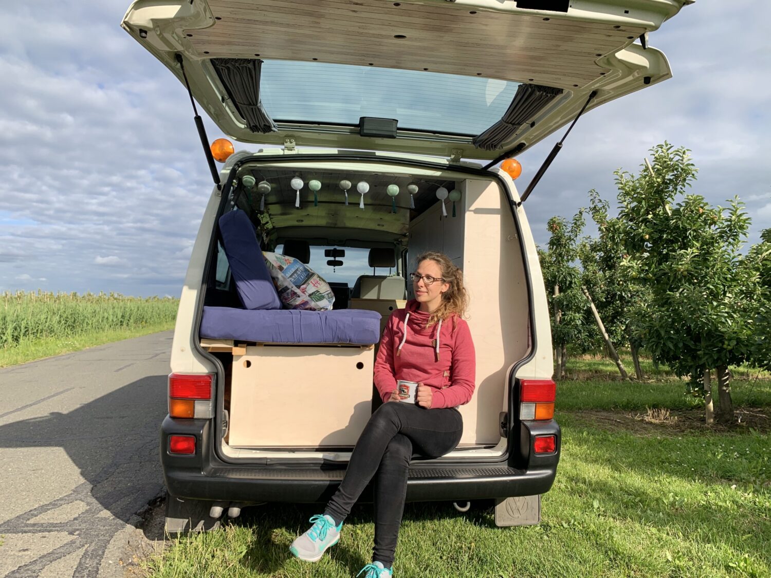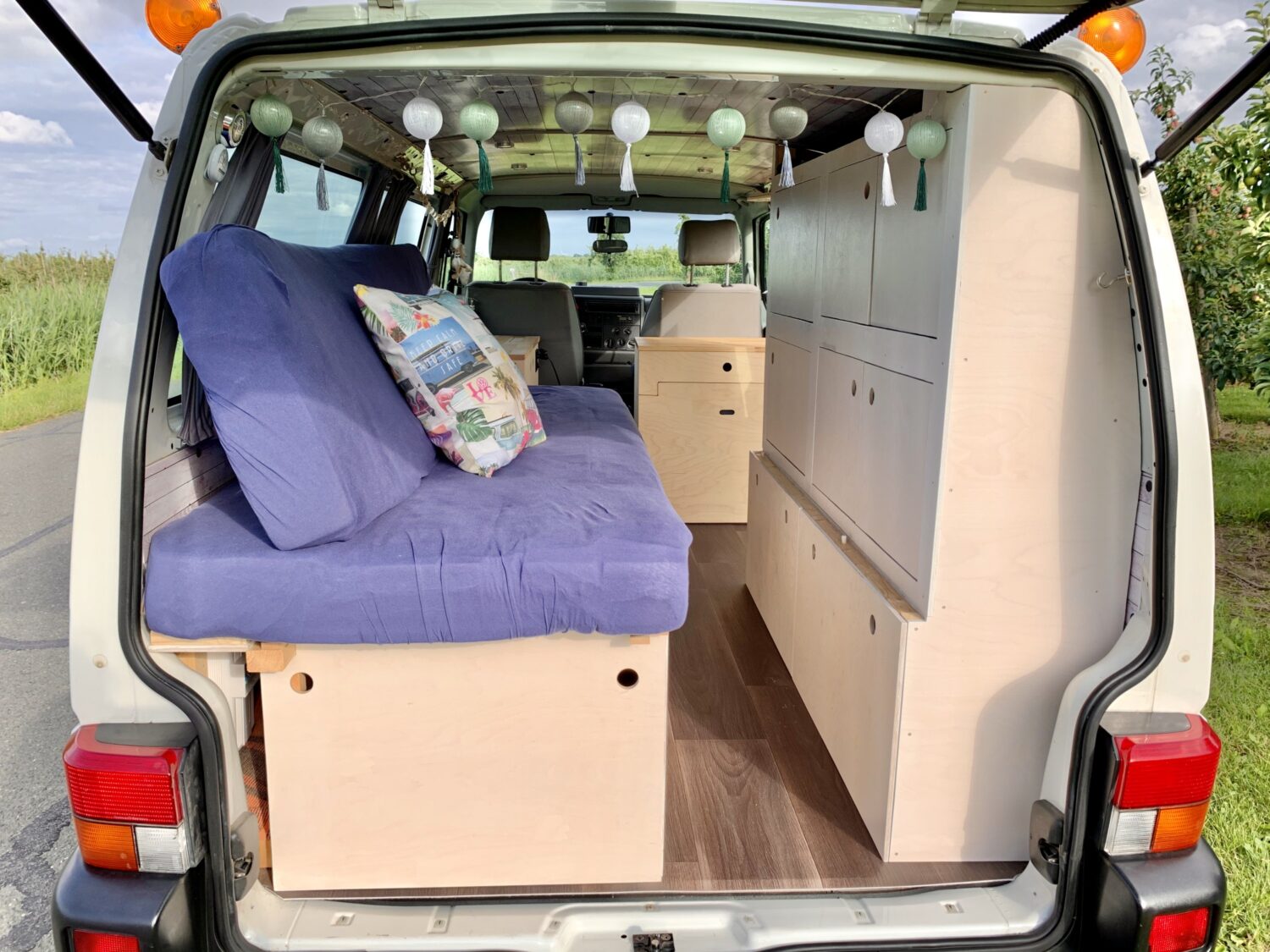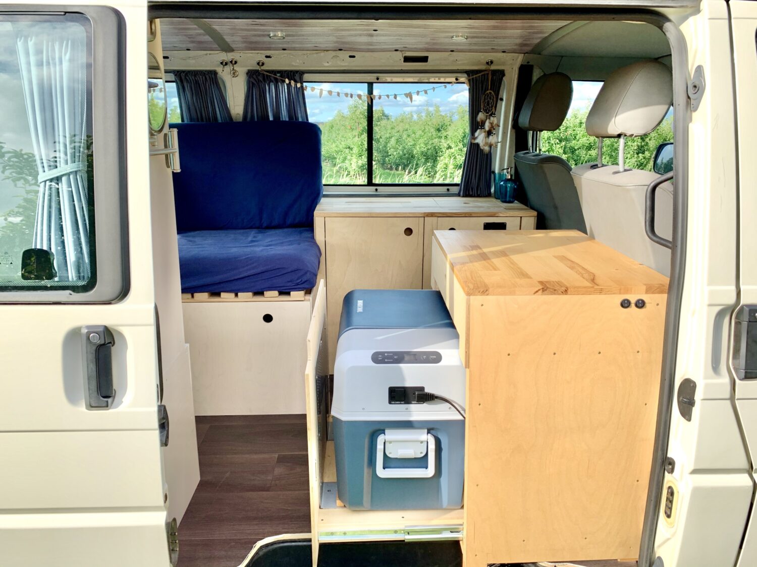 Bei Kuddels Ausbau war mir wichtig, dass ich viel Stauraum habe, aber gleichzeitig den Bus nicht „zu baue-. Außerdem kann ich in der Mitte einmal komplett von vorne nach hinten durchgehen. Dadurch kann ich sowohl bei der Schiebetür als auch am Heck ein- und aussteigen. Und bei Regen muss ich nicht mal den Bus verlassen, um trocken vom Fahrersitz ins Bett zu kommen ;) Ich habe es nicht auf den Cent genau ausgerechnet, aber der Ausbau hat rund 4.000€ gekostet. Was ich vermisse ist ein Aufstelldach, das gönne ich mir vielleicht noch mal.