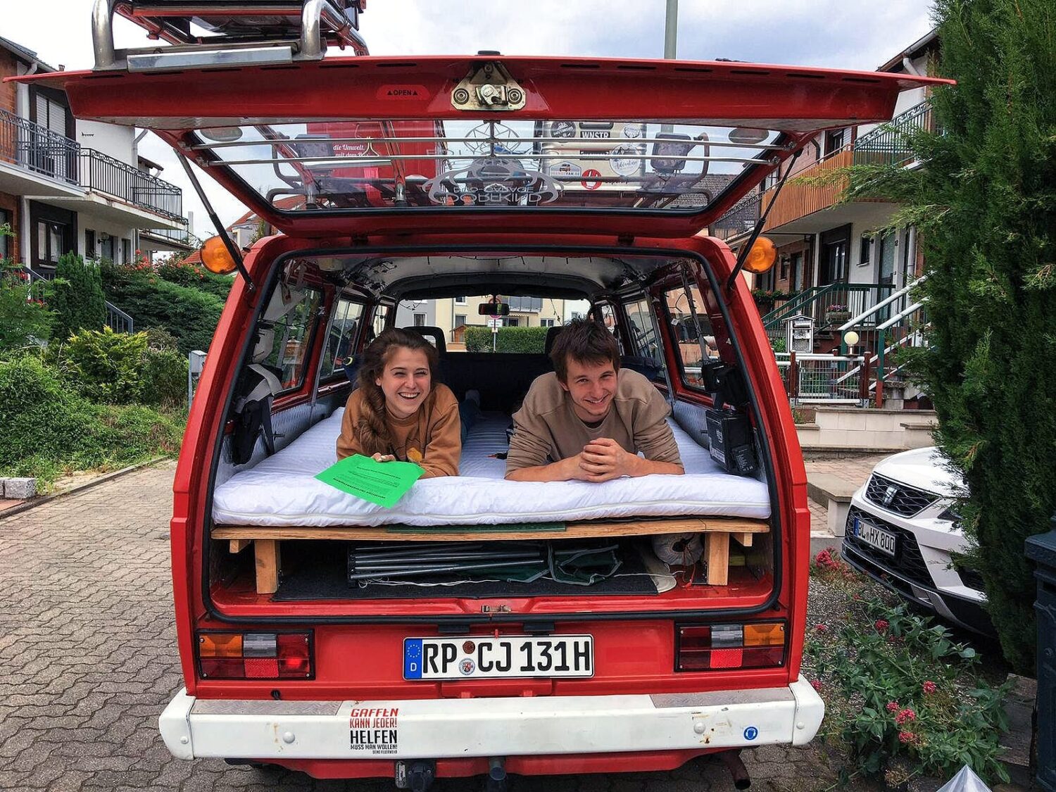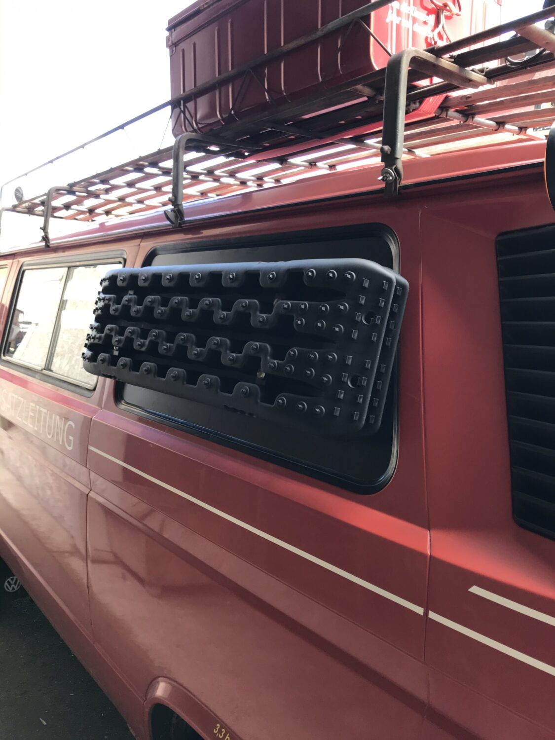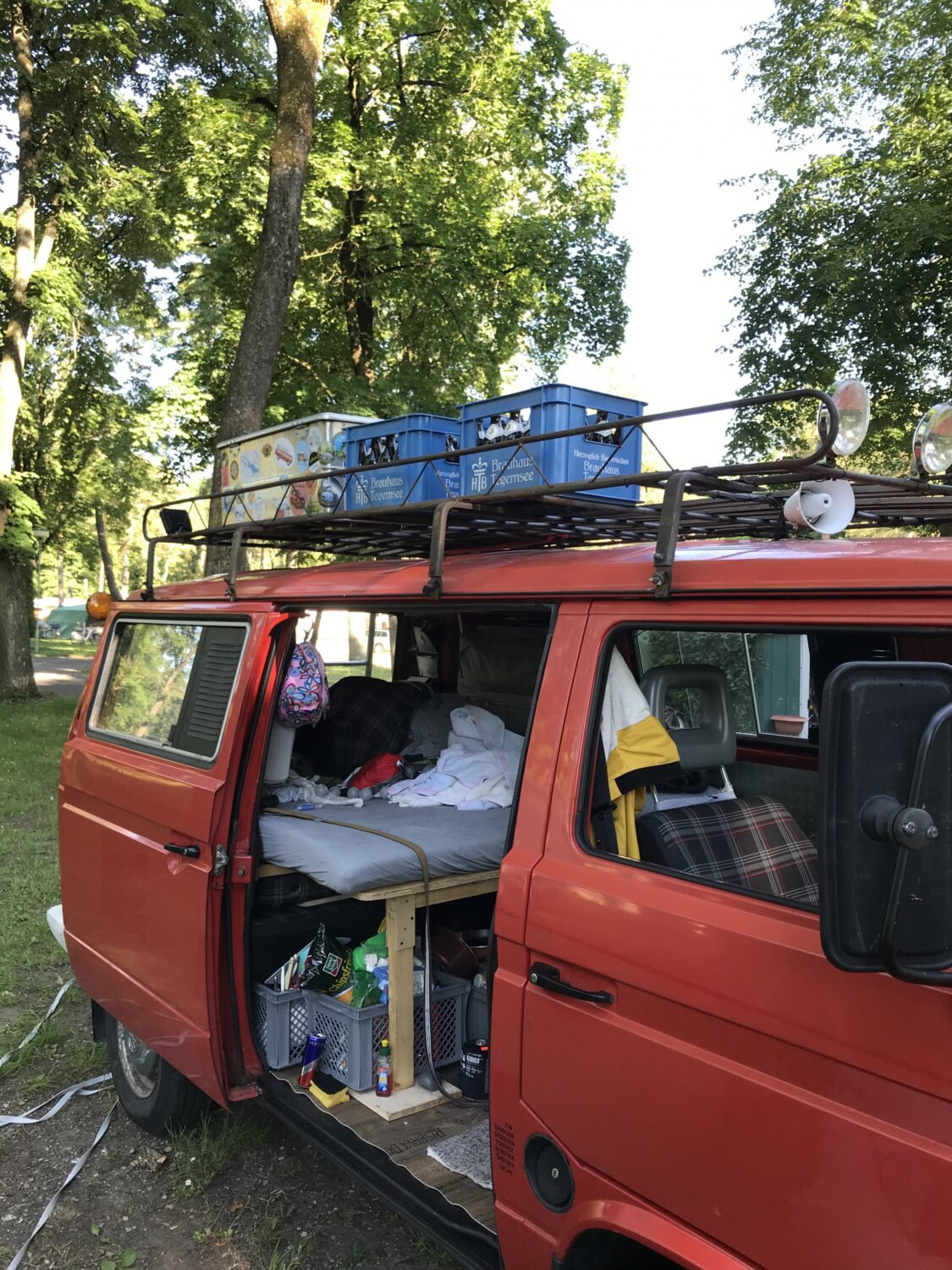 Wir haben unseren Ausbau sehr low gehalten, das bedeutet alles sehr Modular und einfach. So können wir im Alltag normal mit 8 sitzen rum fahren, und wenn wir Bock auf Urlaub haben die Kühlbox und die Euroboxen rein, Bett ausklappen und ab die Post.