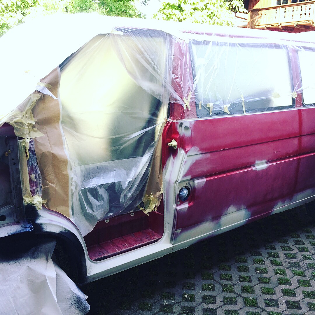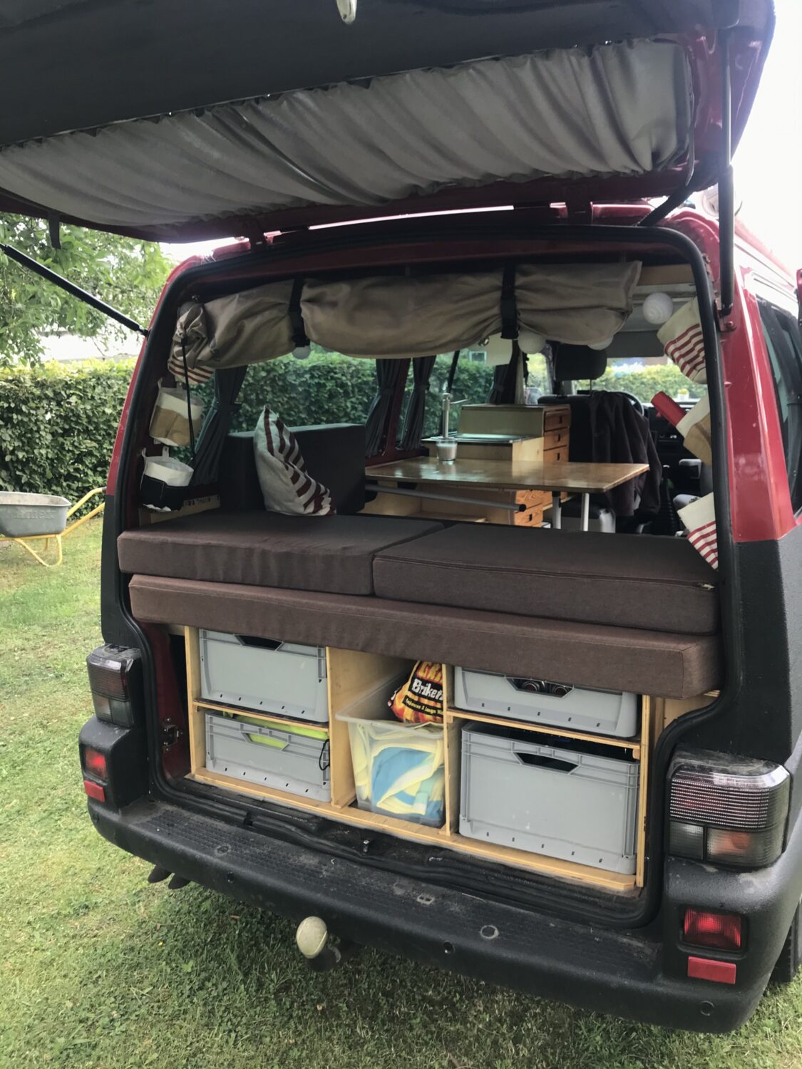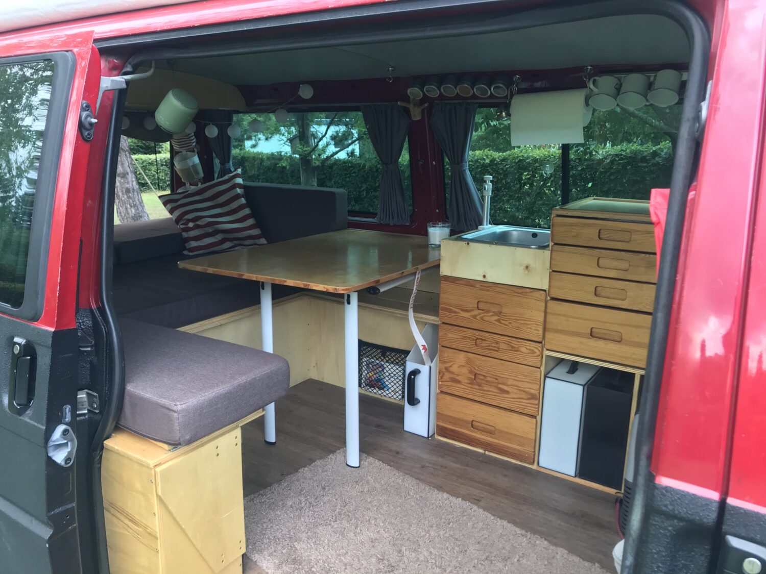 Mein damaliger Partner und ich haben den Transporter optisch ziemlich runtergerockt als ehemaliges Handwerkerfahrzeug mit relativ wenigen Kilometern gekauft und ihn gemeinsam mit meinem Vater (er hat die Holzarbeiten gemacht) ausgebaut und hergerichtet. Besonders gut gefällt mir die Aufteilung des Wohnraums ( langer Radstand macht’s möglich) mit vielen Staumöglichkeiten und die nachhaltige Nutzung alter Möbel- wie zb. mein Wickeltisch - der nun unsere Küche ist.