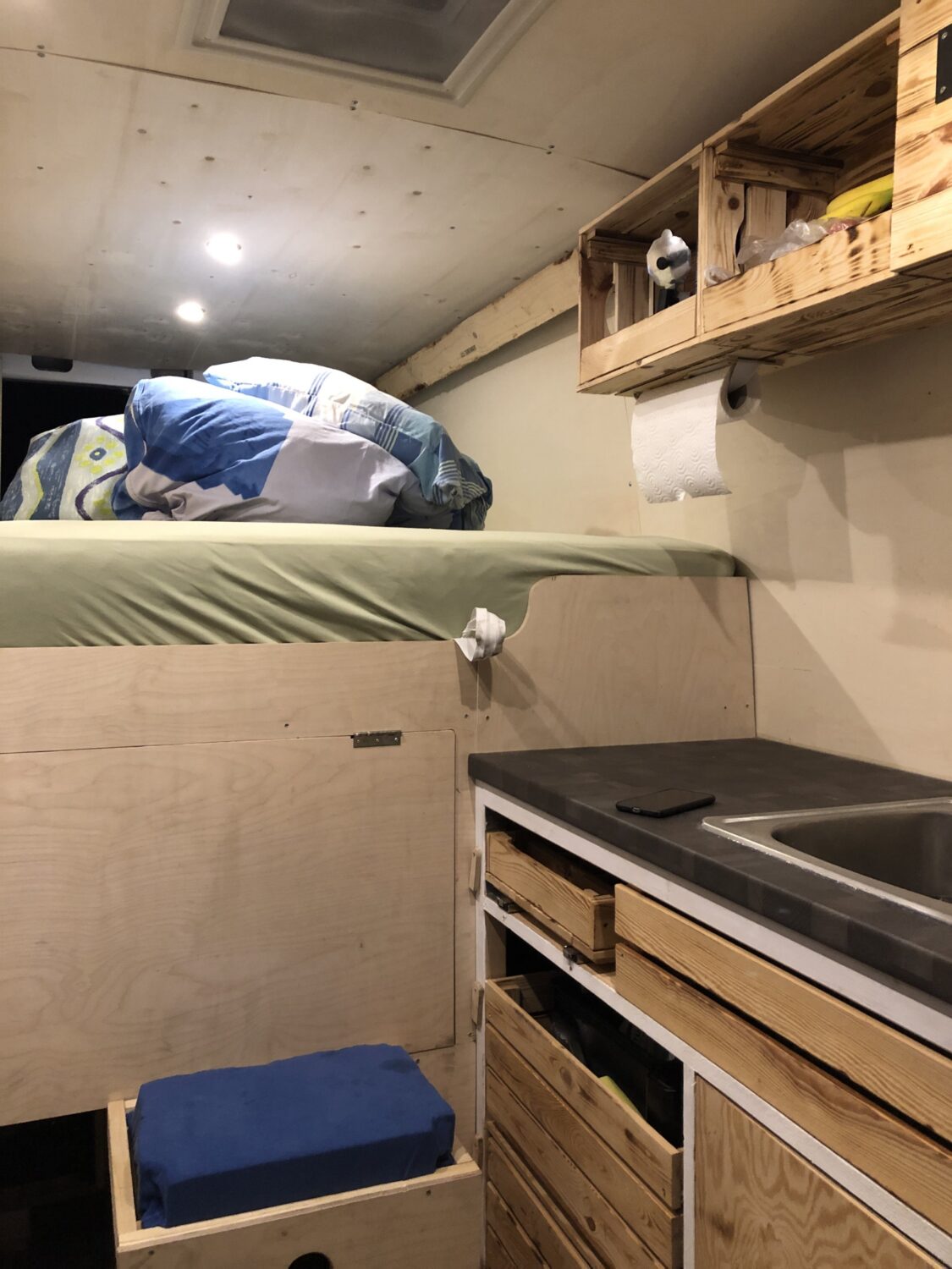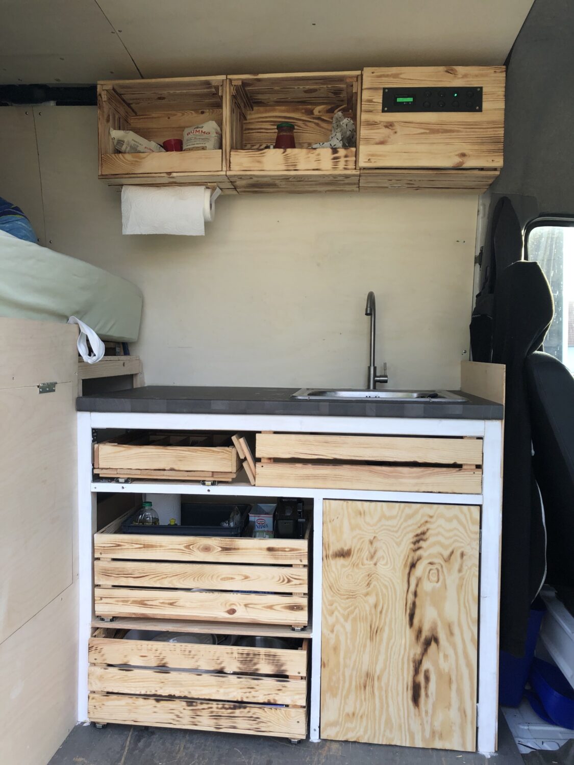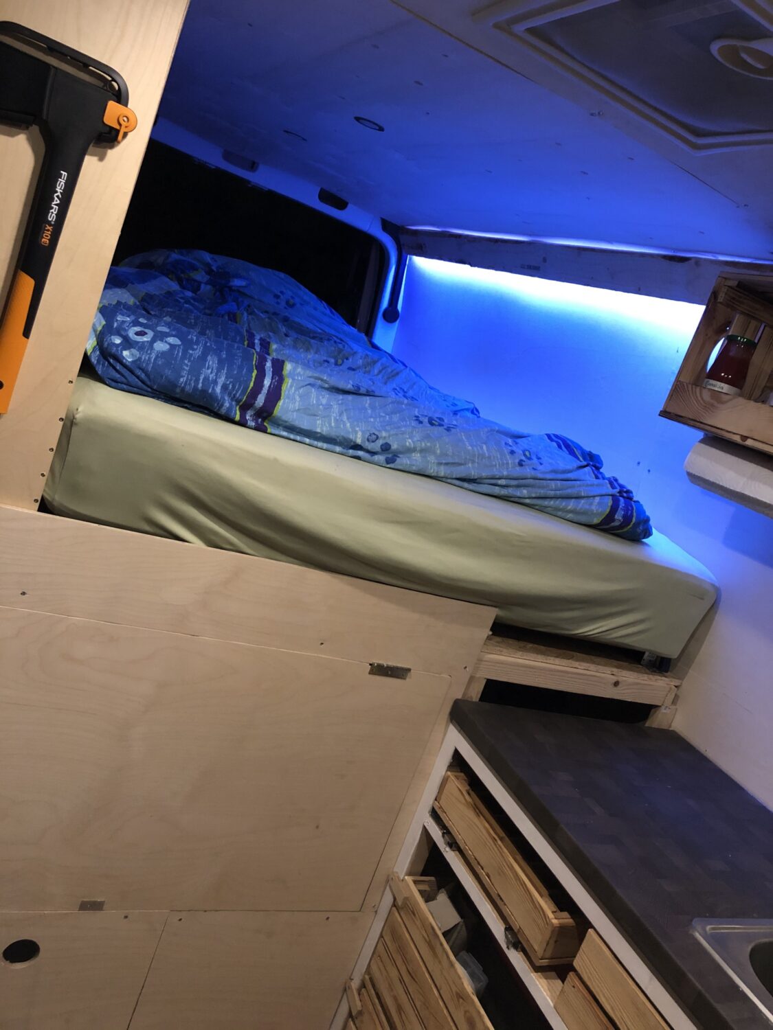 Ca. 200h relativ spontaner Ausbau und nach und nach ein paar Sachen ergänzt und abgeändert. Wichtig war die Schublade für die MTBs und ein Bett was immer ready ist.