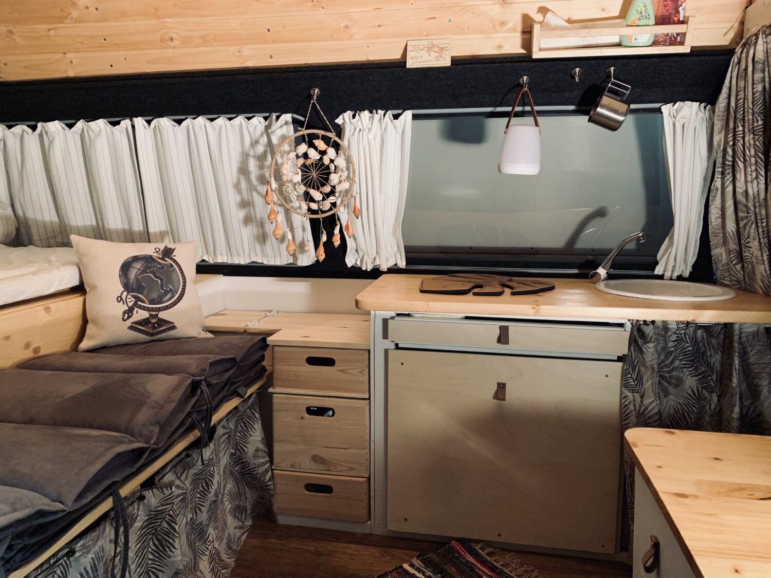 Wir haben lange nach unserem Calimero gesucht und dann ging plötzlich alles ganz schnell. Wir hatten Sommer und wollten nur noch los. Deswegen haben wir wirklich Gas gegeben und der Ausbau hat erstmal nur sechs Wochen gedauert. Mittlerweile ist aber viel mehr Zeit hinein geflossen. Ob für Umbauten, kleine Veränderungen oder Instandhaltung des Wagens. Insgesamt haben wir ca. 8000€ ausgegeben, da wir beim Kauf wirklich einen guten Preis bekommen haben. ( 4000€ Bus + 4000€ Ausbau) In unserem Bus wurde alles selbst gemacht. Von der Innenverkleidung bis zur Elektrik. Darauf sind wir wirklich stolz. Und noch besser ist, das alles noch immer funktioniert Ã°à ¸ÃÂ⦠Besonders geil ist aber unser King Size Bett, das ausgeklappt eine Größe von 155cmx200cm hat. ( wenn ich die Füße auf die Küchenzeile lege sogar noch mehr Ã°à ¸ÃÂâ¦)