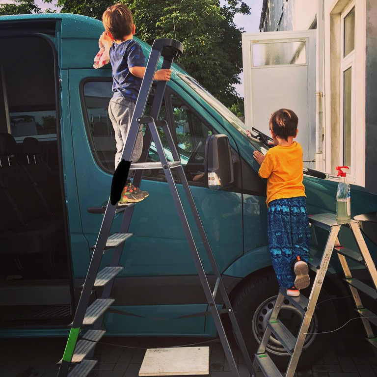 Wir sind noch ziemlich am Anfang. Besonders wird das zusätzliche Aufstelldach für unsere Zwillinge. Außerdem hat unser Kalli eine super coole Farbe, irgendwas zwischen grün und blau.