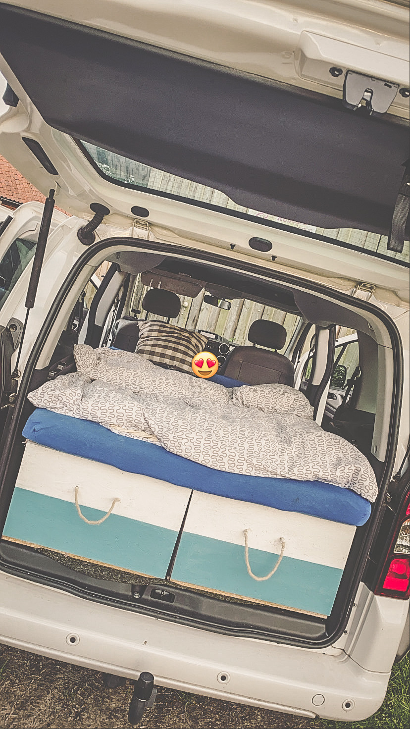 Der Ausbau ist so gestaltet das wir die Rücksitzbank weiter nutzen können und die Grundkonstruktion dient ebenso als Kühlschrank ohne Strom.