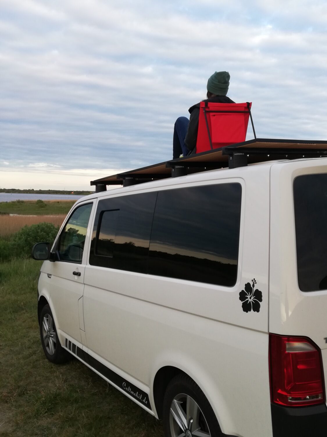 Der Bulli wurde von Cultmobil im Beachlook ausgebaut, da ich das Meer, den Strand, die Wellen und das Kiten liebe. Das Highlight ist aber meine eigene gebaute Dachterrasse.. . Ich wohne nur in einer kleinen Wohnung und mich hat das tierisch genervt, gerade zu Corona Zeiten fehlte mir das sehr. Und da habe ich zusammen mit meinem Kumpel die Dachterrasse gebaut und die ist mega geil! Einfach traumhaft einfach aufs Dach zu klettern und die Welt von oben zu sehen.