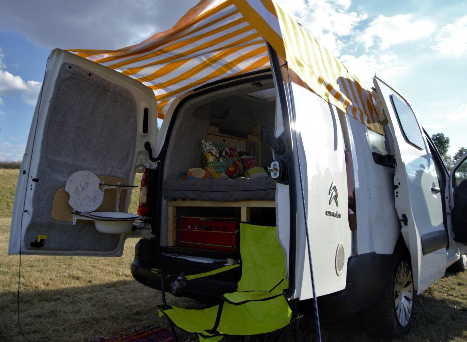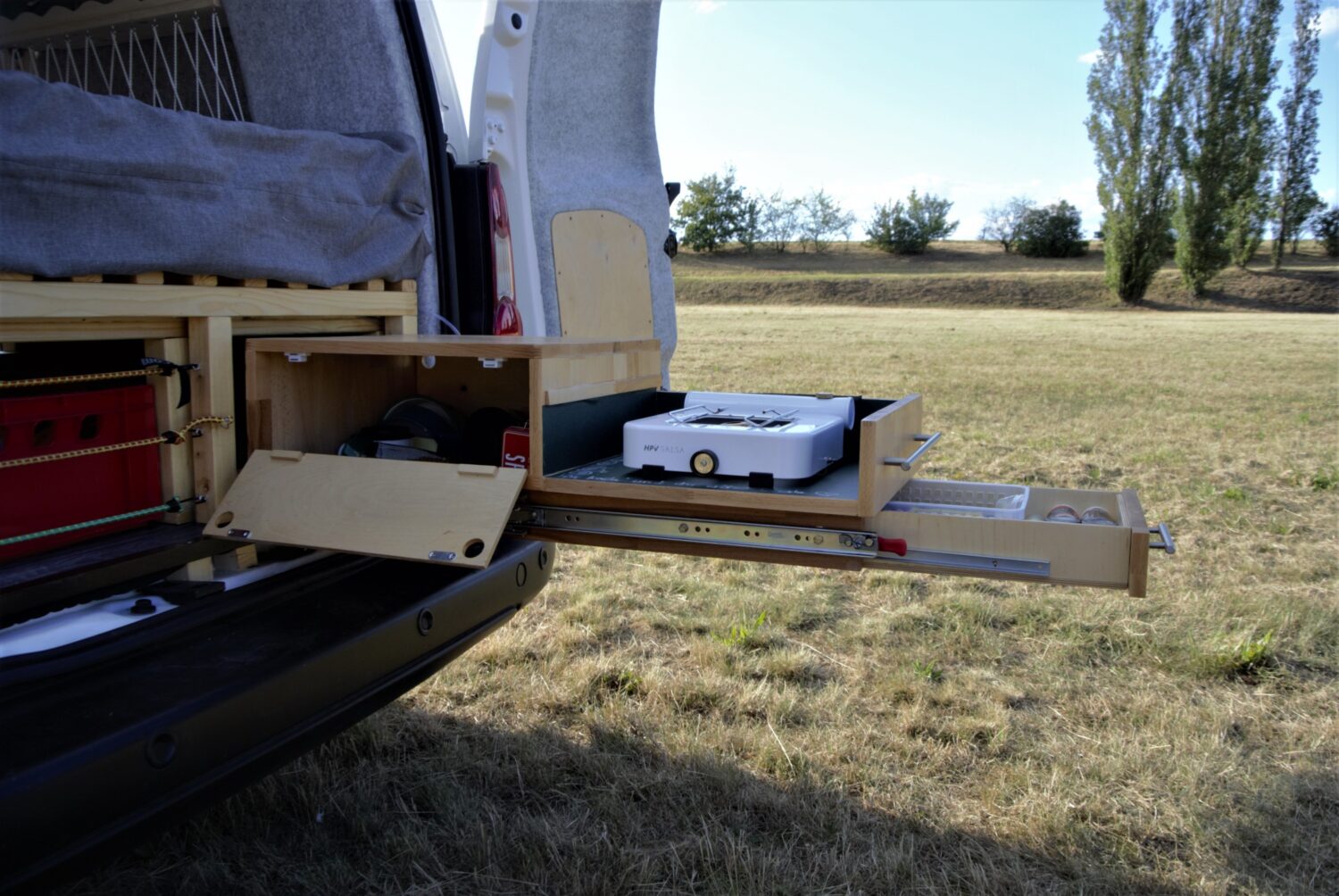 Der Ausbau hat mich lange schon beschäftig, bevor ich überhaupt ein Auto hatte - ich wollte Gemütlichkeit und Funktionalität ohne viel Schnickschnack haben. Da Karl am Heck nur 1,20 m breit ist, habe ich die Regale an die Seiten verlegt und das Bett variabel verschiebbar in die komplette Mitte der Ladefläche gesetzt. Die Fenster sind selbst eingebaut und das Dachfenster gibt nachts zum Einschlafen wunderbar den Blick auf die Sterne frei. Besonders stolz bin ich auf die ausziehbare Heckküche mit den vielen Staufächern und die selbstgenähten Vorhänge, Polsterbezüge und Organizer. Beim Umbau war es mir auch sehr wichtig, nicht alles neu zu kaufen, sondern viel Gebrauchtes zu verwenden. So sind viele verbaute Holzbretter Reste aus der Werkstatt meines Vaters bzw. Großvaters, die Vorhänge sowie Kissen aus meiner früheren Wohnung und fast alle Ausstattungsgegenstände wie Campingstühle oder Kaffeemaschine aus zweiter Hand. Vom Kauf bis zur Wohnmobil- TÜV- Abnahme hat es insgesamt 4 Monate gedauert. Ich weiß jetzt zwar immer noch nicht, wie man eine Stichsäge bedient, habe aber stattdessen gelernt, dass man Dinge einfach angehen und machen sollte. Die Sorgen dürfen sich erstmal andere Leute machen.