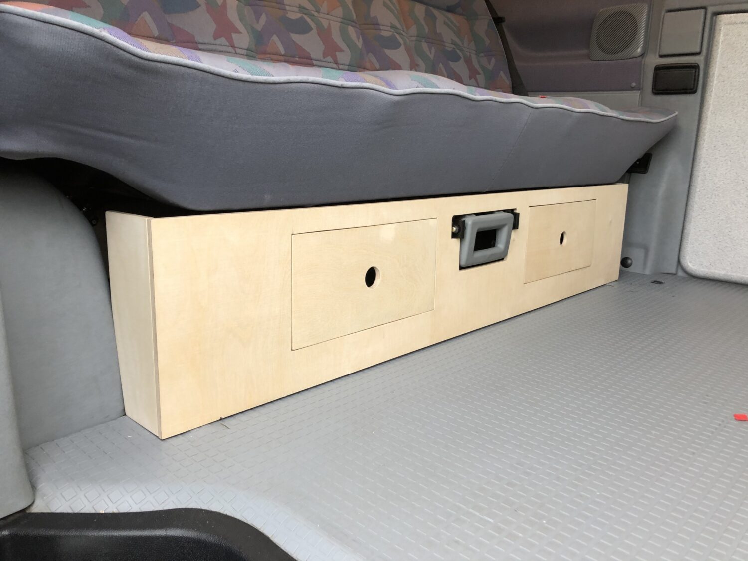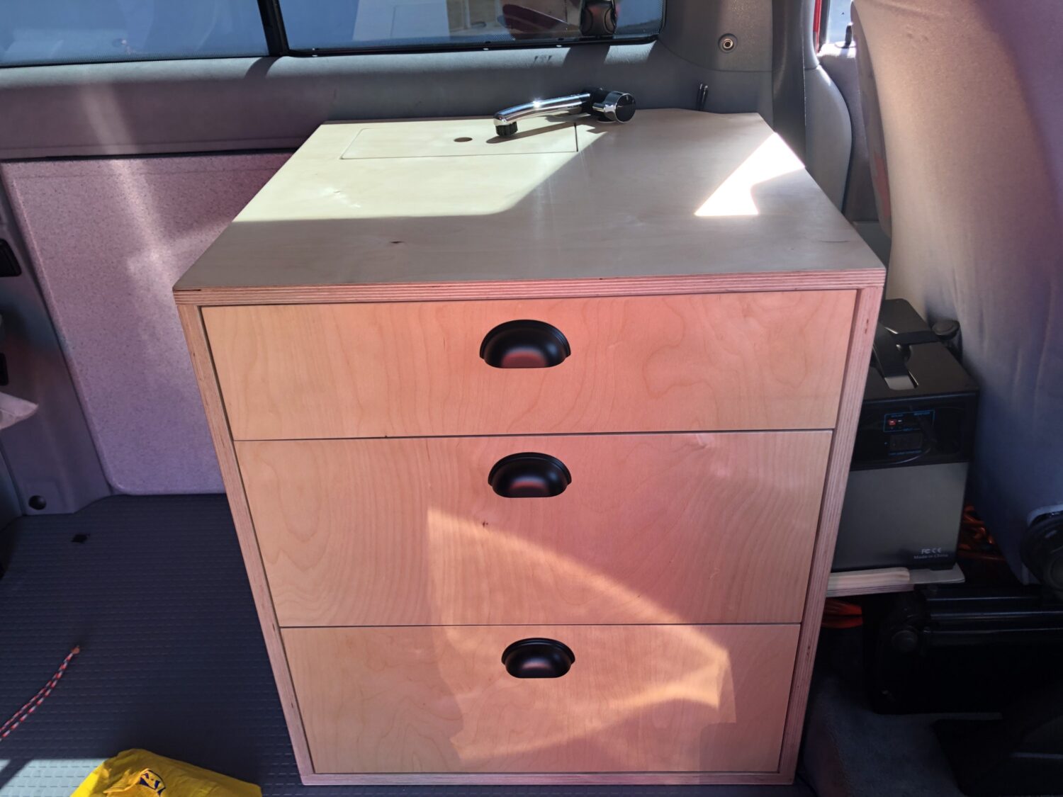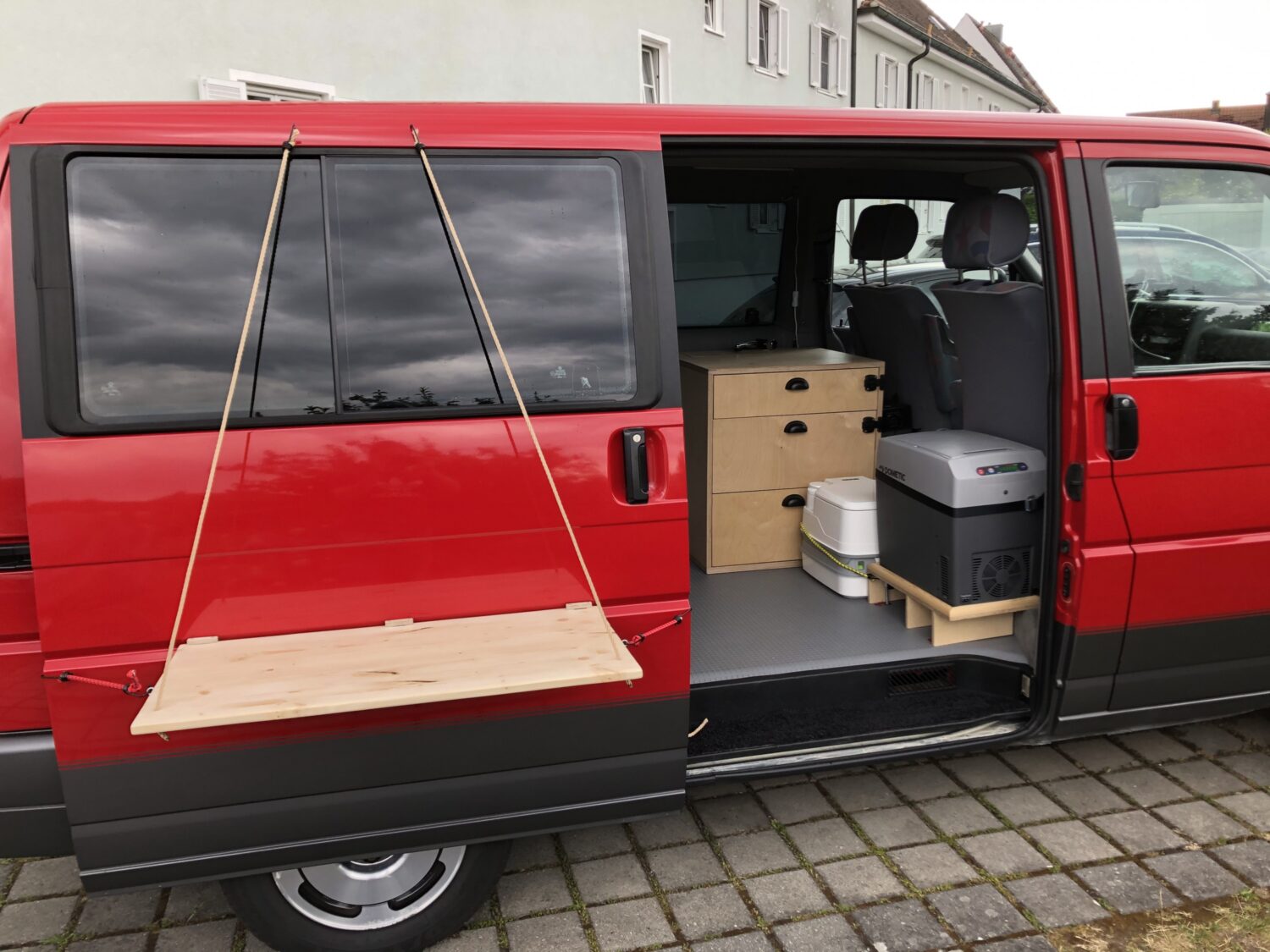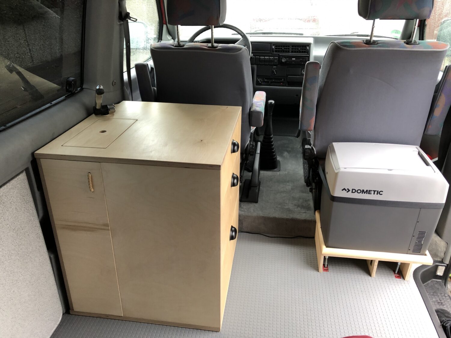 Wir haben unseren Ausbau ziemlich dezent gehalten. Da wir einen Multivan haben und die Rückbank als Bett behalten wollten über die komplette breite haben wir nur eine kleinen Küchenblock mit 3 Schubläden und einer kleinen Spüle mit jeweils 10 Liter Frisch- und Grauwasser. Ausserdem haben wir noch eine 20 Liter Kühlbox und unter der Rücksitzbank haben wir unseren "Kleiderschrank"