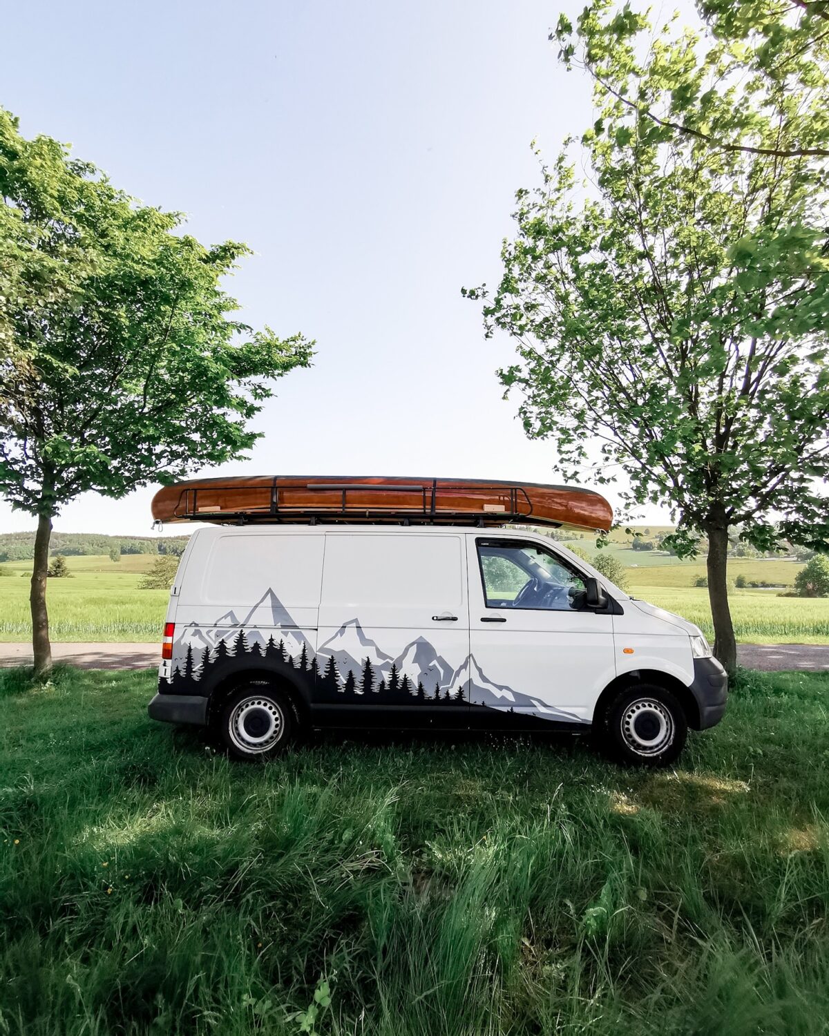Wir haben 2 Wochen geplant und 3D Zeichnungen angefertigt. Danach in 3 Wochen den kompletten Umbau durchgezogen. Nach und nach haben wir aber immer wieder ein bisschen was verändert oder angepasst. Der Umbau hat uns bis jetzt ca. 3500€ (mit Standheizung und Dachgepäckträger) gekostet. Wir haben bis jetzt aber noch keinen extra Stromanschluss im Van und kommen seit 2 Jahren auch ganz gut damit klar. Wollen aber bald noch Solarzellen aufs Dach machen. Besonders schön finden wir unsere selbstgemachte Beklebung,hier haben wir uns von Freundship inspirieren lassen (Danke hierfür :) )