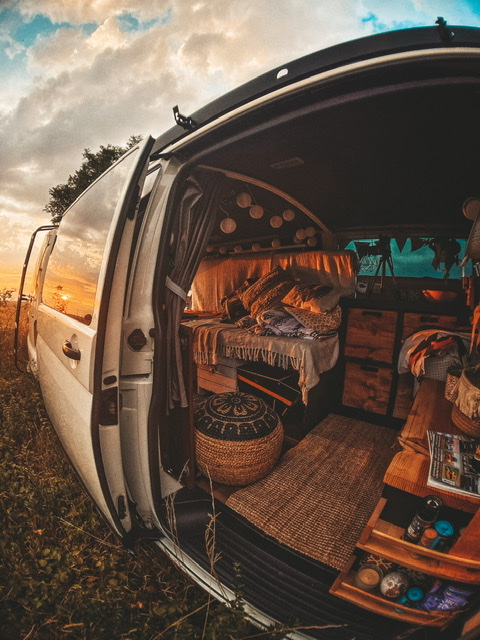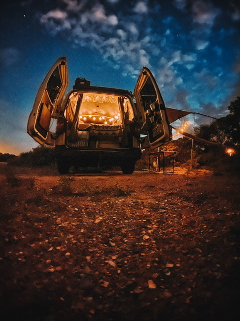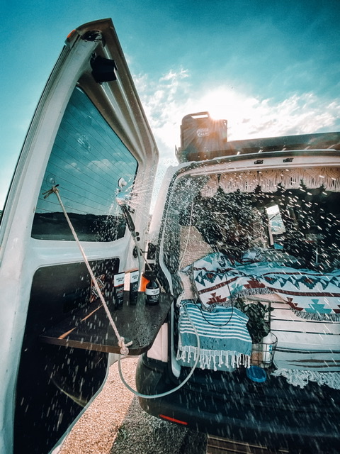 Mit ein paar Handgriffen vom Campervan zum Transporter und zurück. Der Ausbau ist so konzipiert das der Van im Handumdrehen wieder zum Transporter gewandelt werden kann (da der Platz gelegentlich für Messen und Märkte benötigt wird) Als erstes kam das Klappbett nach eigenem Entwurf. Multiplex Platten die mit Bettbeschlägen zusammen halten. Bei Bedarf kann es über ein Scharnier vom Sofa zum Bett geklappt werden. Gestützt von ausziehbaren Obstkisten unter der Konstruktion. Die Innenverkleidung wurde digital nachgebaut und aus 4mm Multiplex auf der CNC Fräse ausgefräst. Lasiert in einem gemütlichen dunklen Braunton. Als Küchen und Kleiderschrank sowie Stauraum dienen 2 Kallax Regale (2x2 und 1x2) mit Holzkisten Schubladen. Der Clou ist das Faltregal in einer Schublade welche an der Decke eingegangen werden kann. Als Wasch/Spülbecken dient eine Emille Schüssel, der Wasserhahn ist eine Tauchpumpe eigentlich aus dem Angelbedarf. Im hinteren Breich dient ein 25l Kanister mit tauchpumpe als Dusche. Im letzten Jahr kam ein Dachträger von ND Rack aufs Dach welcher schnell mit Douglasienbrettern zur Dachterrasse umfunktioniert wurde. Erreichbar über die Leiter an der Flügeltür. Neueste Modifikationen ist die Verkleidung unter dem Seitentisch was über eine Führungsschiene heraus genommen werden kann und als Campingtisch dient. Zukünftige Pläne: Elektrik/Solar Anlage für Autarkes Campen