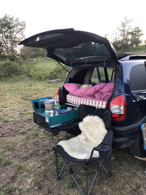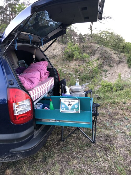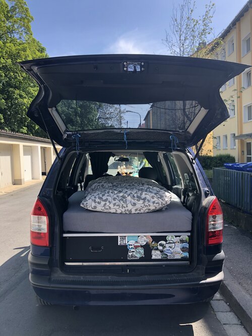 Den zweiten Ausbau habe ich von einem Freund übernommen, der war in 30 Minuten von einem Zafira in den anderen transplantiert. Besonders stolz bin ich auf meine Dachterrasse und meine brandneue supergeile ausziehbare Heckküche! Es gibt sogar eine Zweitbatterie, die meine LED Bar versorgt und mir Strom an usb Dosen neben dem Bett liefert 👍
