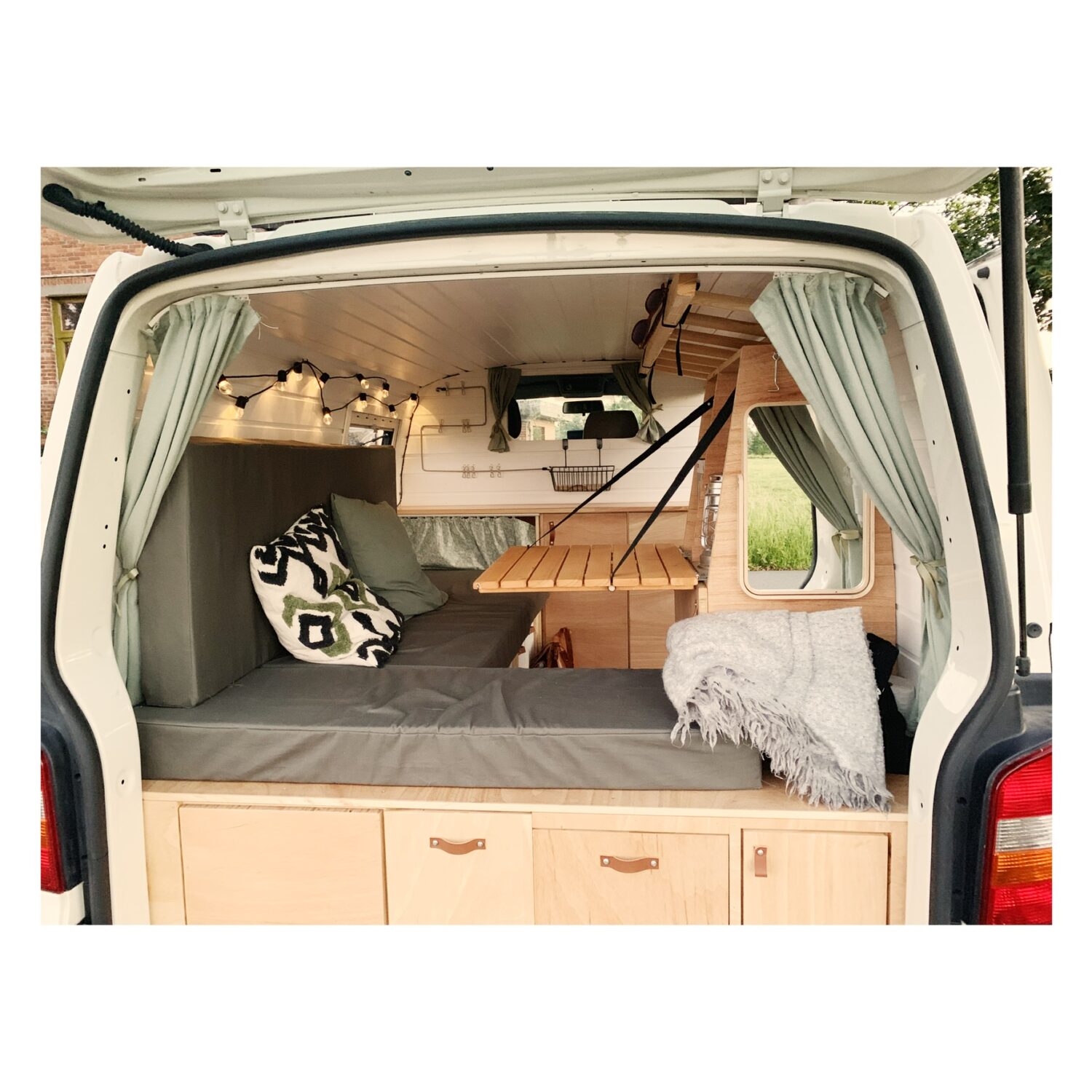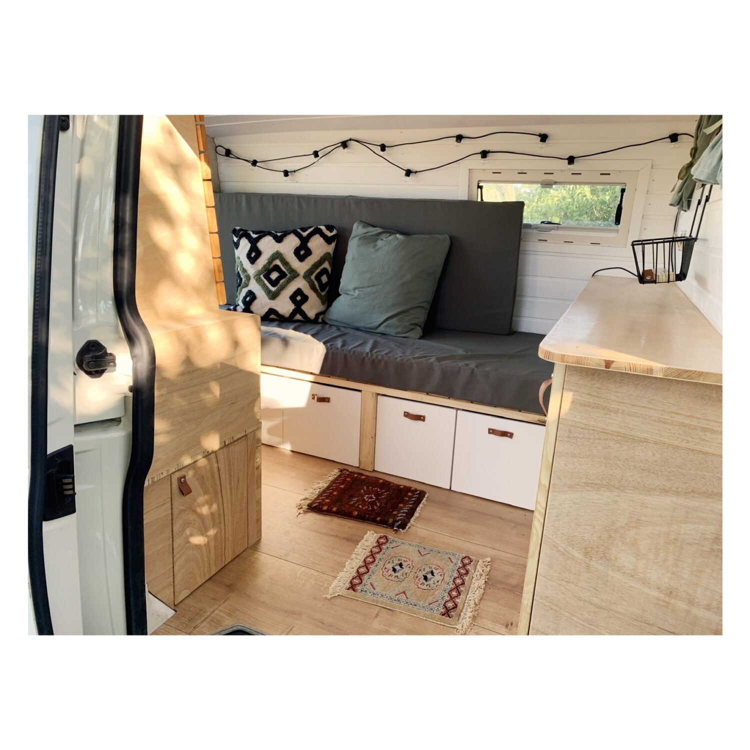 Ich glaube mit dem Ausbau ist man nie ganz fertig, aber wir haben ca. 3 Monate gebraucht. Am längsten hat die Holzvertäfelung im Innenraum gedauert, die schon liebevoll mit einer Sauna verglichen wurde. Es wirkt wie unser kleines schwedisches Häuschen. Das Highlight ist auf jeden Fall die Dachterasse und die Leiter die uns dort hoch führt oder unsere Klamotten trocknet nach dem Baden.