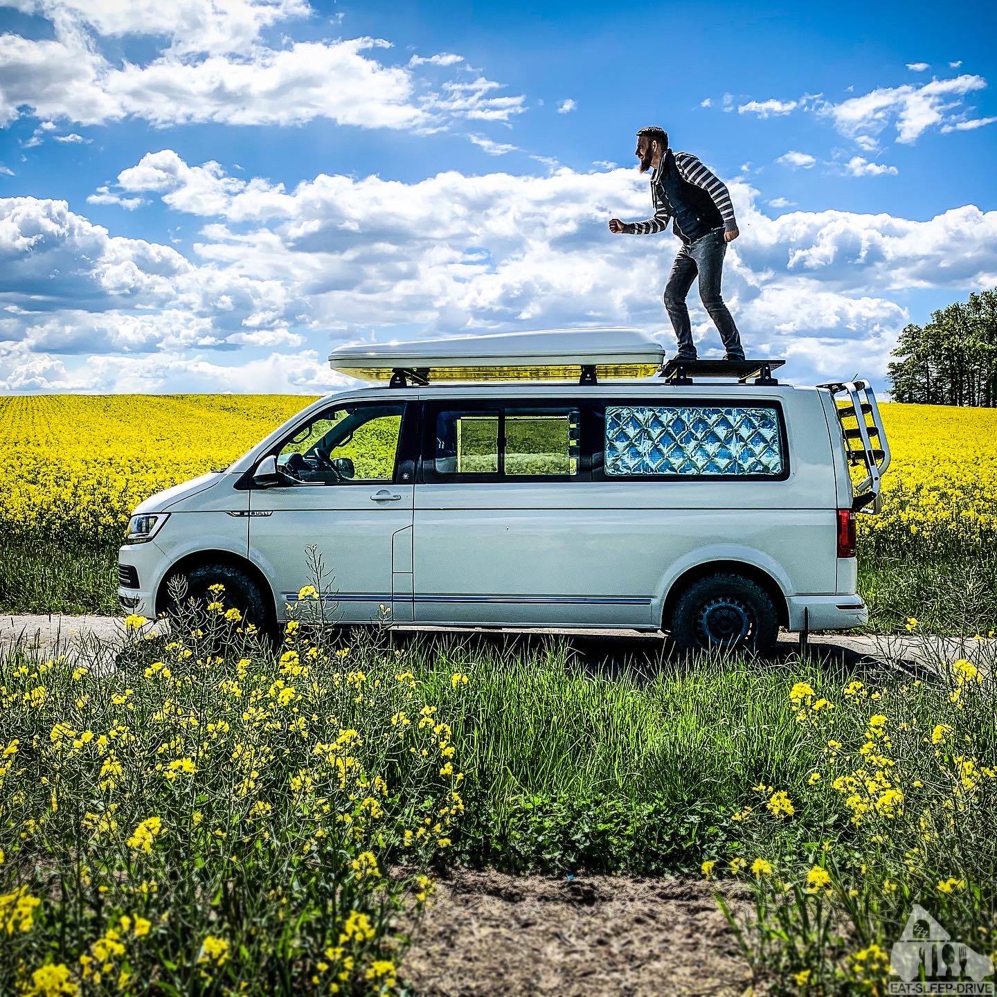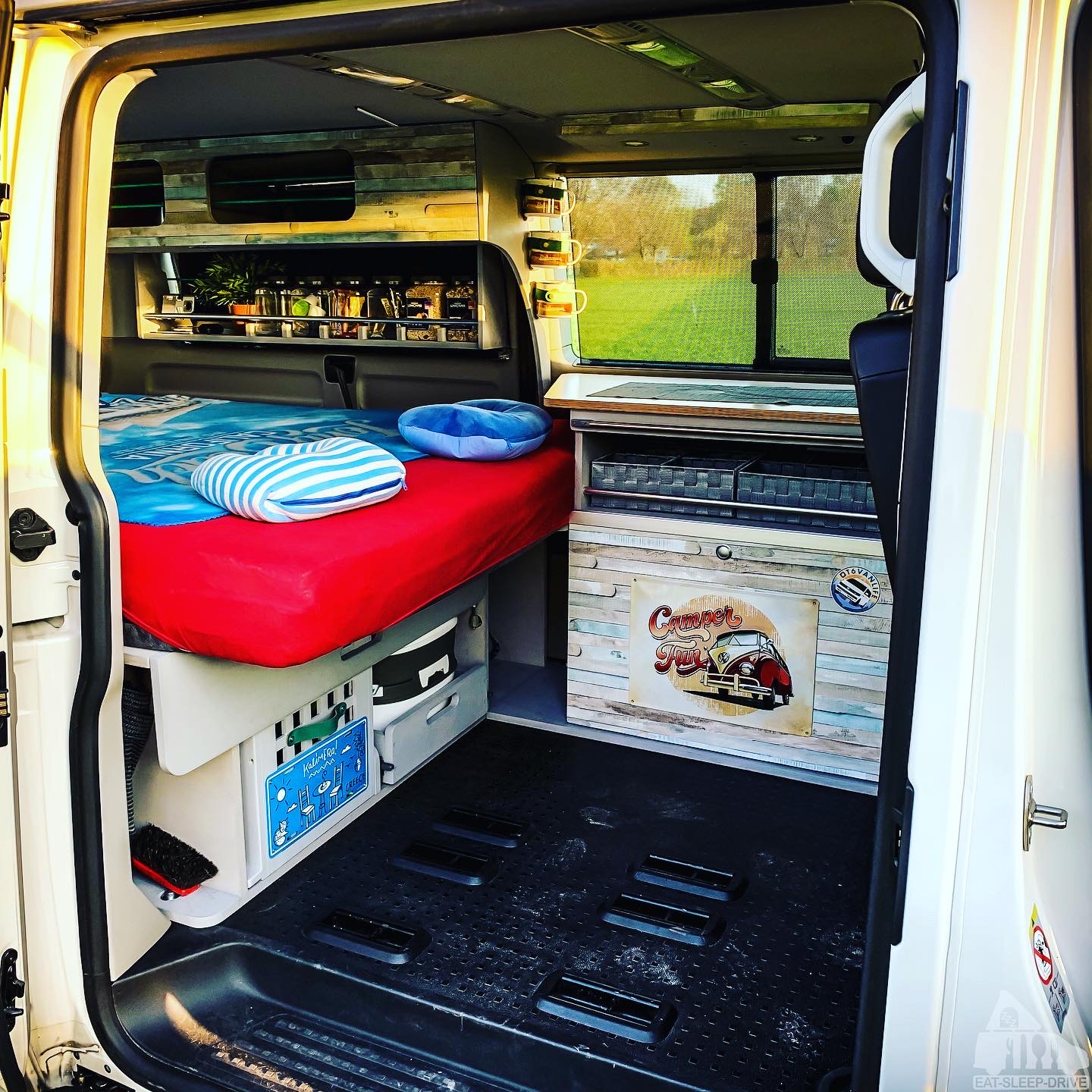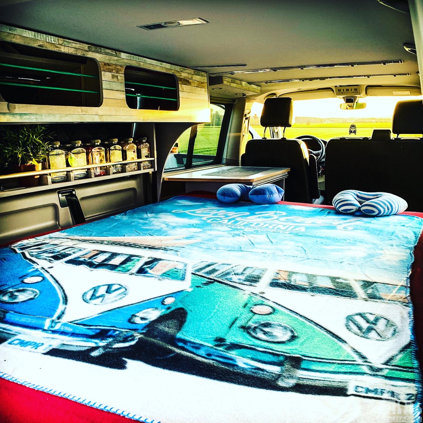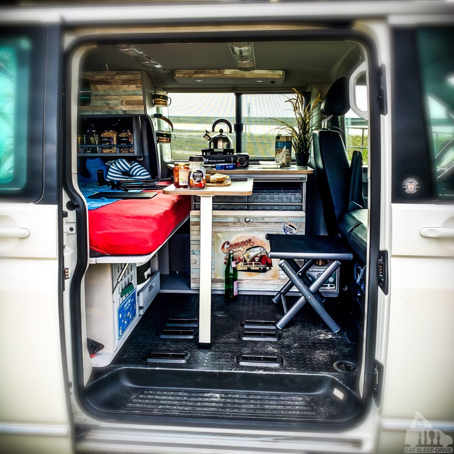 Der Ausbau ist komplett aus Holz (Multiplex) und wurde von mir über die letzten Jahre verteilt in mehreren Schritten durchgeführt. Platz bietet der Eisbär für 4 Personen. Grundidee war bei meinem Ausbau, dass alles wieder in einen normalen Van zurück gerüstet werden kann, ohne Spuren zu hinterlassen, wie etwa Bohrlöcher in Verkleidungen etc. Ich habe dabei nur im Bus vorhandene Befestigungsmöglichkeiten benutzt.