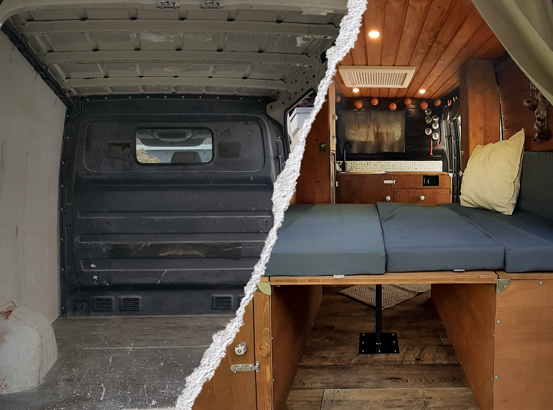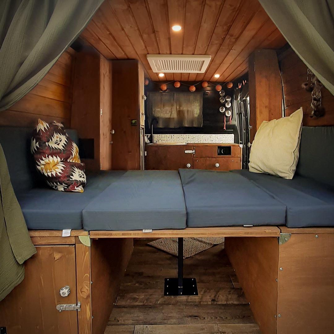 Gekauft haben wir Wotan im Mai 2019 mit knapp über 100.000 Kilometern. Der Vorbesitzer war ein Stukateurbetrieb und dementsprechend verstaubt und dreckig sah es auch im Innenraum aus. Nach dem gründlichen "entstauben" & putzen musste noch die Folie runter. Mit dem eigentlichen Umbau konnten wir dann im August 2019 starten. Zuerst kam ein Dachfenster rein, da und es wurde mit Armaflex gedämmt . Bei unserer Stromversorgung sind wir vollkommen autark. Wir haben zwei 130 Watt Solarmodule auf dem Dach installiert, die über einen Laderegler unsere 230 Ah AGM Solarbatterie aufladen. Im gesamten Bus haben wir nur 12 Volt verbaut. Das reicht uns völlig um Licht, Kühlschrank, Wasserversorgung etc. zu betreiben. Nachdem die ganze Elektronik verlegt war, konnten wir die Wände & Decke mit Profilholz verkleiden. Danach ging es endlich an den Innenausbau. Wir haben mehrere Schränke, Küche, Außendusche und eine Sitzbank / Tisch Kombi, die wir zum Bett umbauen können. Bilder vom Ausbau & unseren Reisen findet ihr auf instagram.com/wotan_auf_reisen
