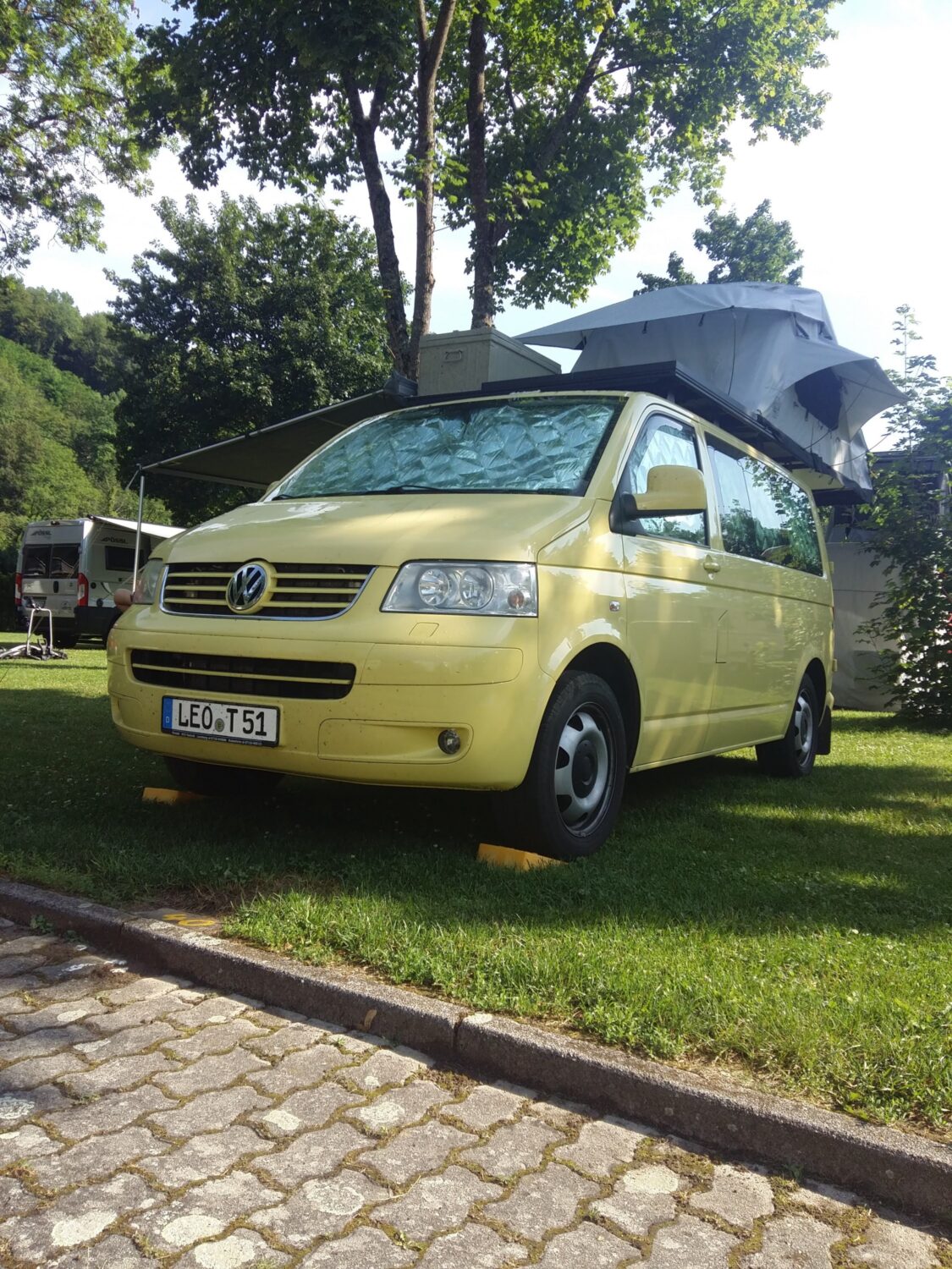 Wir haben uns eine Heckküche gebaut. Hier findet das Geschirr und einiges Anderes Platz, neben einer Dometic CDF 36 Kompressorkühlbox, einem Butangaskocher und einem 13l Frischwassertank mit 12V Tauchpumpe und Wasserhahn. Mit den umgeklappten Sitzbänken und einer faltbaren Matratze entsteht unser Bett mit 2,00x1,40 m. Dieses Jahr wurde der DIY - Dachträger realisiert. Vom Metallbauer extra angefertigte Winkel für die Verbindung zum Dach, dazu schwarz eloxierte Bosch-Nut-Profile mit einer Größe von 2,5 x 1,55 m. Darauf finden links über dem Fahrerplatz zwei Solarmodule Platz mit 210 wp. Diese Speisen unter dem Fahrersitz eine 100 Ah AGM-Batterie über unseren Laderegler. Dieser hält über eine Ladeleitung auch die Starterbatterie immer auf Funktion. Unter dem Beifahrersitz liegt der Verteiler für die Abnehmer. In der Verkleidung des Beifahrersitzes haben zusätzliche Steckdosen für 12V und USB ihren Platz gefunden. Über dem Beifahrerplatz befindet sich eine kleine alte US-Militär-Kleiderkiste. Die ist schön leicht. Die haben wir der Optik wegen noch mit Raptorlack aufgehübscht. Mittlerweile ziert die Front ein Mückencamouflage. :D Die hintere Hälfte hat nun noch ein Dachzelt von Campwerk erhalten. So montiert, dass es sich nach hinten ausklappen lässt. Damit haben wir (wir haben Flügeltüren) auch einen Wetterschutz über unserer Heckküche. Wir fahren unseren Tweety seit 2015 - und haben, manchmal mit Unterstützung von Freunden alles selbst gemacht. Ein kleiner DIY Bulli, der sich außerhalb der Urlaube auch als Familie Auto nutzen lässt. Weiterhin sind durch kleines Umbauen 4 Sitzplätze verfügbar und auch unsere Wuffine findet noch Platz.