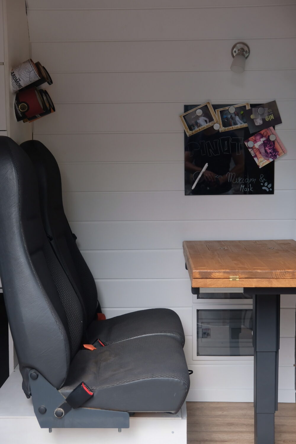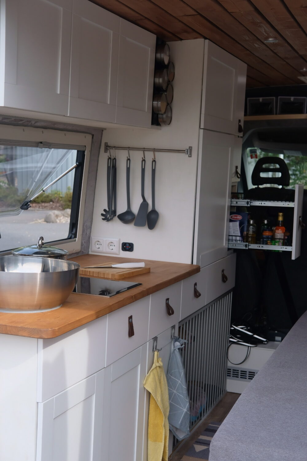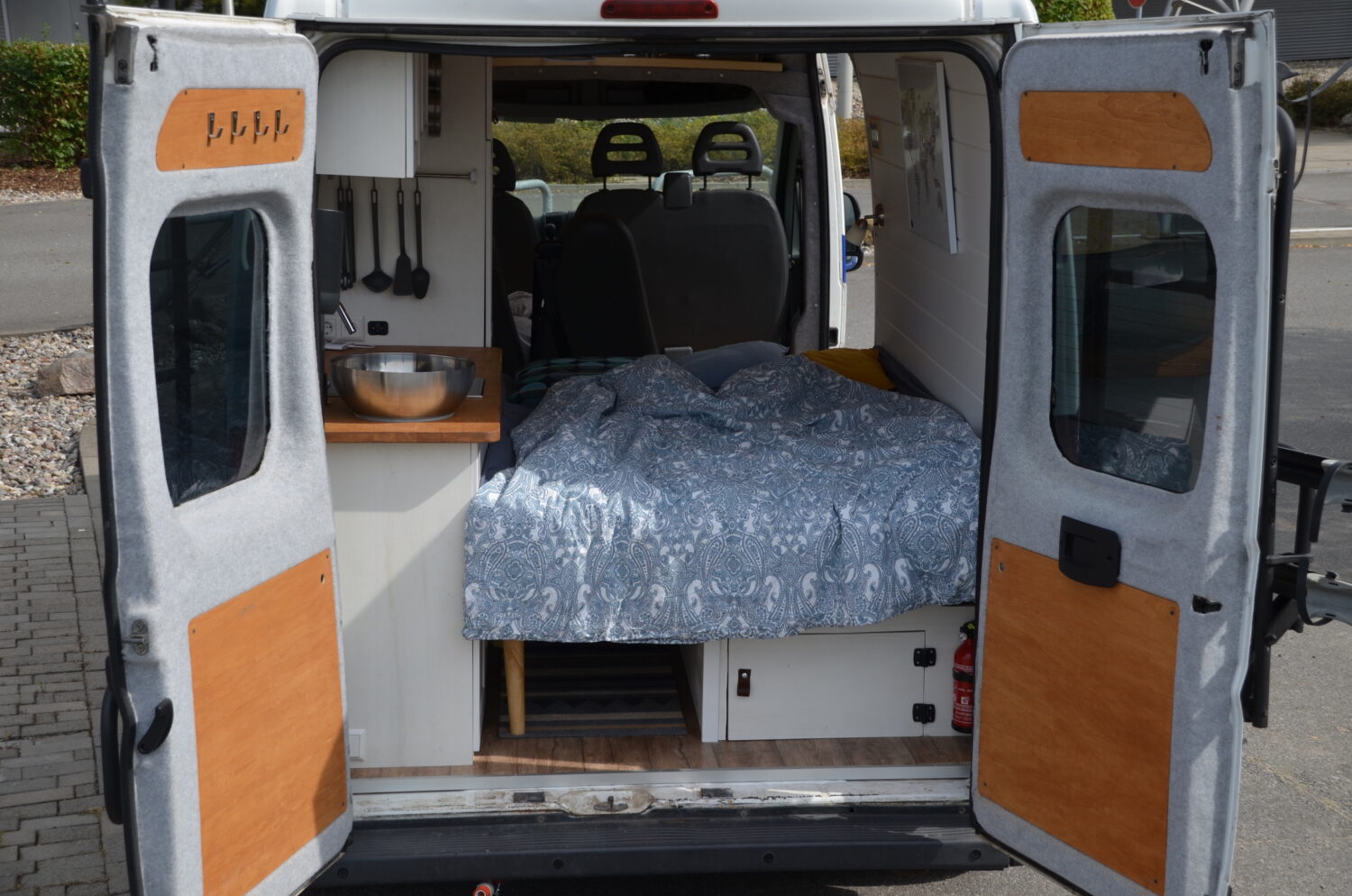 Moin, Wir haben die Corona-Phase genutzt um unseren Pinot ganz nach unseren Wünschen und Bedürfnissen zu gestalten und komplett selbst auszubauen. Pinot hat den ersten großen Praxistest in den letzten fünf Wochen mit Bravur gemeistert und dank eines großen Kühlschranks mit Eisfach für die Eiswürfel sowie dem Induktionskochfeld hat es uns an nichts gefehlt. Durch einen großen Wassertank und die Solarzelle mit den beiden Versorgerbatterien kann man problemlos einige Tage autark stehen. Wichtig war es uns den Camper so zu gestalten, dass auch bei schlechtem Wetter viel Platz im Innenraum vorhanden ist. Deshalb haben wir uns für eine Klappcouch entschieden die sowohl zum gemütlichen Sitzen einlädt, als auch mit einer Größe von 130x190 ein super bequemes Bett bietet. Auch die Sitzgruppe mit dem großen Esstisch lässt sich zu einem dritten Schlafplatz mit wenigen Handgriffen umbauen. Da wir immer mit unserer Hundedame Leia unterwegs sind hat sie auch einen eigenen Schlafplatz in Form einer kleinen Hundebox (100x45) bekommen, um sowohl während der Fahrt als auch in der Nacht einen sicheren und gemütlichen Platz zu haben.