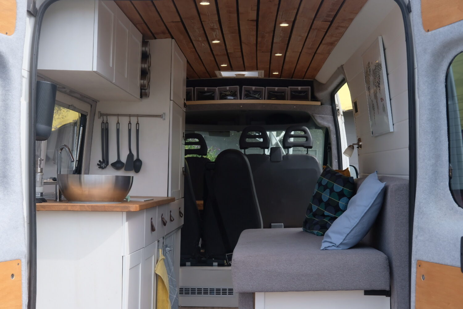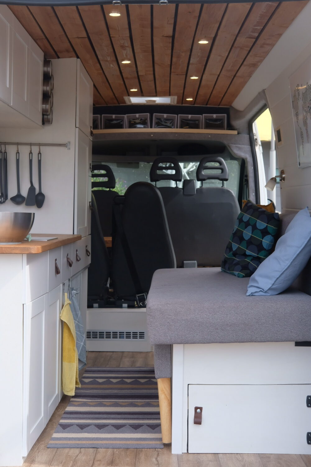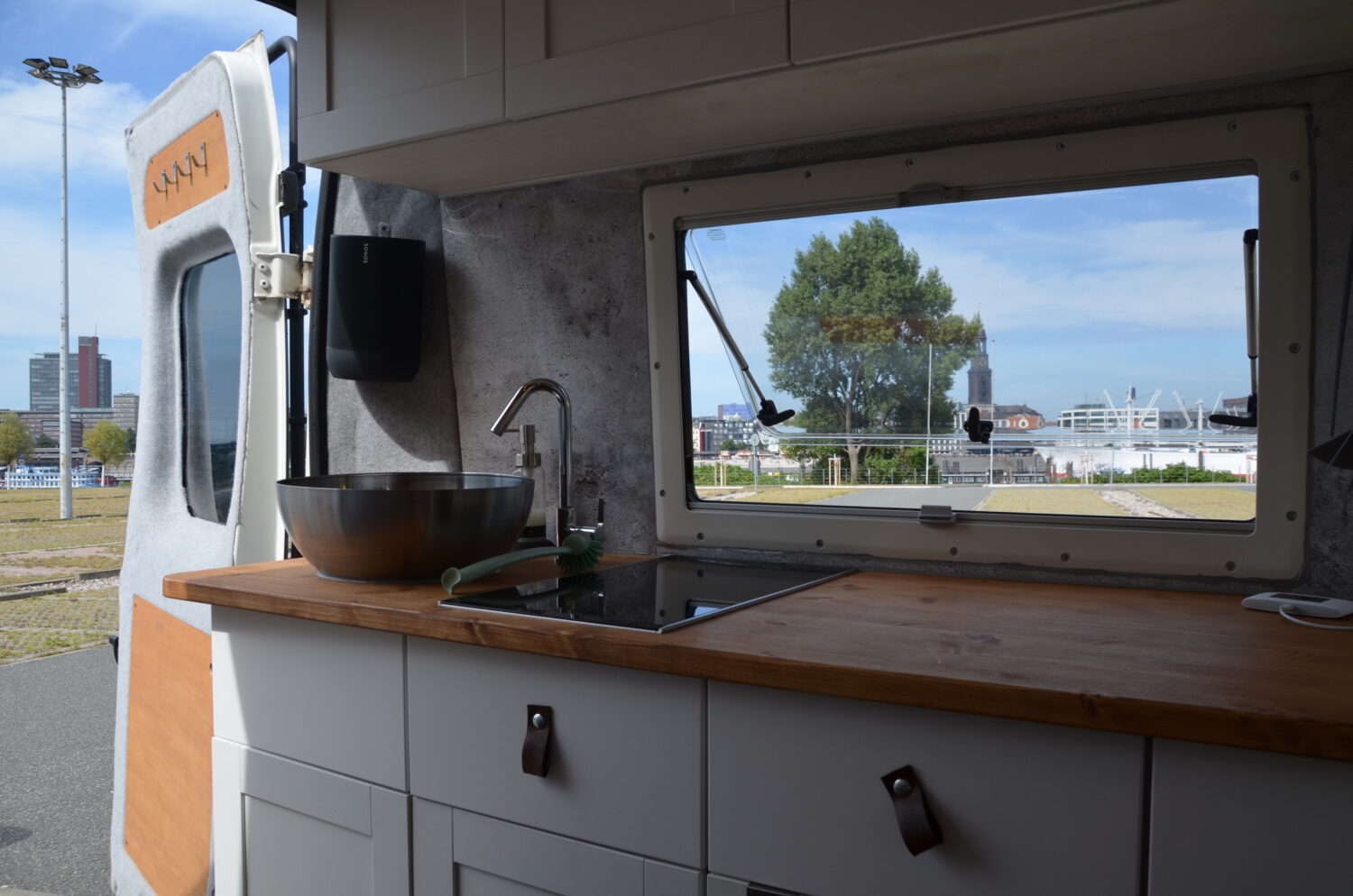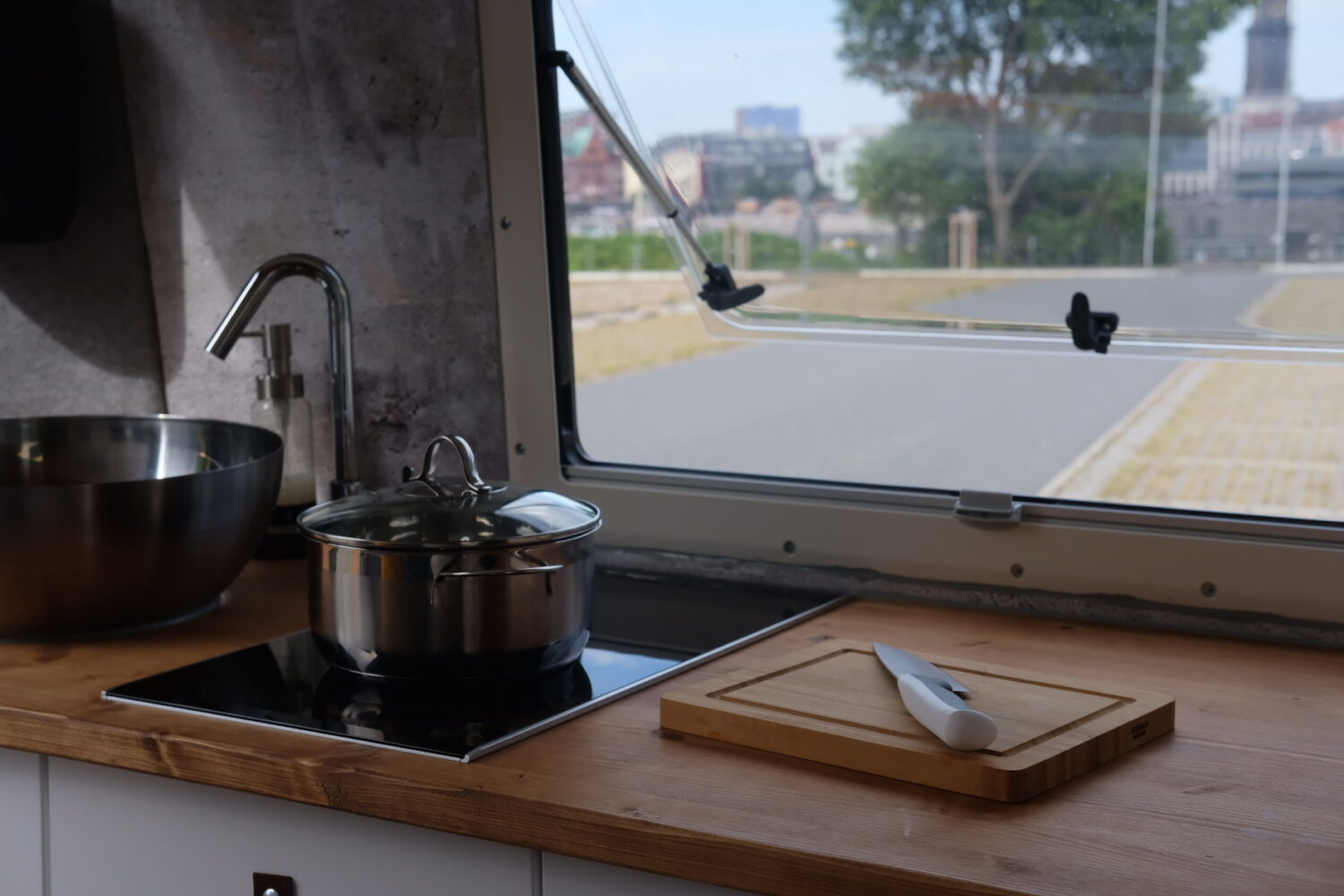Moin, Wir haben die Corona-Phase genutzt um unseren Pinot ganz nach unseren Wünschen und Bedürfnissen zu gestalten und komplett selbst auszubauen. Pinot hat den ersten großen Praxistest in den letzten fünf Wochen mit Bravur gemeistert und dank eines großen Kühlschranks mit Eisfach für die Eiswürfel sowie dem Induktionskochfeld hat es uns an nichts gefehlt. Durch einen großen Wassertank und die Solarzelle mit den beiden Versorgerbatterien kann man problemlos einige Tage autark stehen. Wichtig war es uns den Camper so zu gestalten, dass auch bei schlechtem Wetter viel Platz im Innenraum vorhanden ist. Deshalb haben wir uns für eine Klappcouch entschieden die sowohl zum gemütlichen Sitzen einlädt, als auch mit einer Größe von 130x190 ein super bequemes Bett bietet. Auch die Sitzgruppe mit dem großen Esstisch lässt sich zu einem dritten Schlafplatz mit wenigen Handgriffen umbauen. Da wir immer mit unserer Hundedame Leia unterwegs sind hat sie auch einen eigenen Schlafplatz in Form einer kleinen Hundebox (100x45) bekommen, um sowohl während der Fahrt als auch in der Nacht einen sicheren und gemütlichen Platz zu haben.