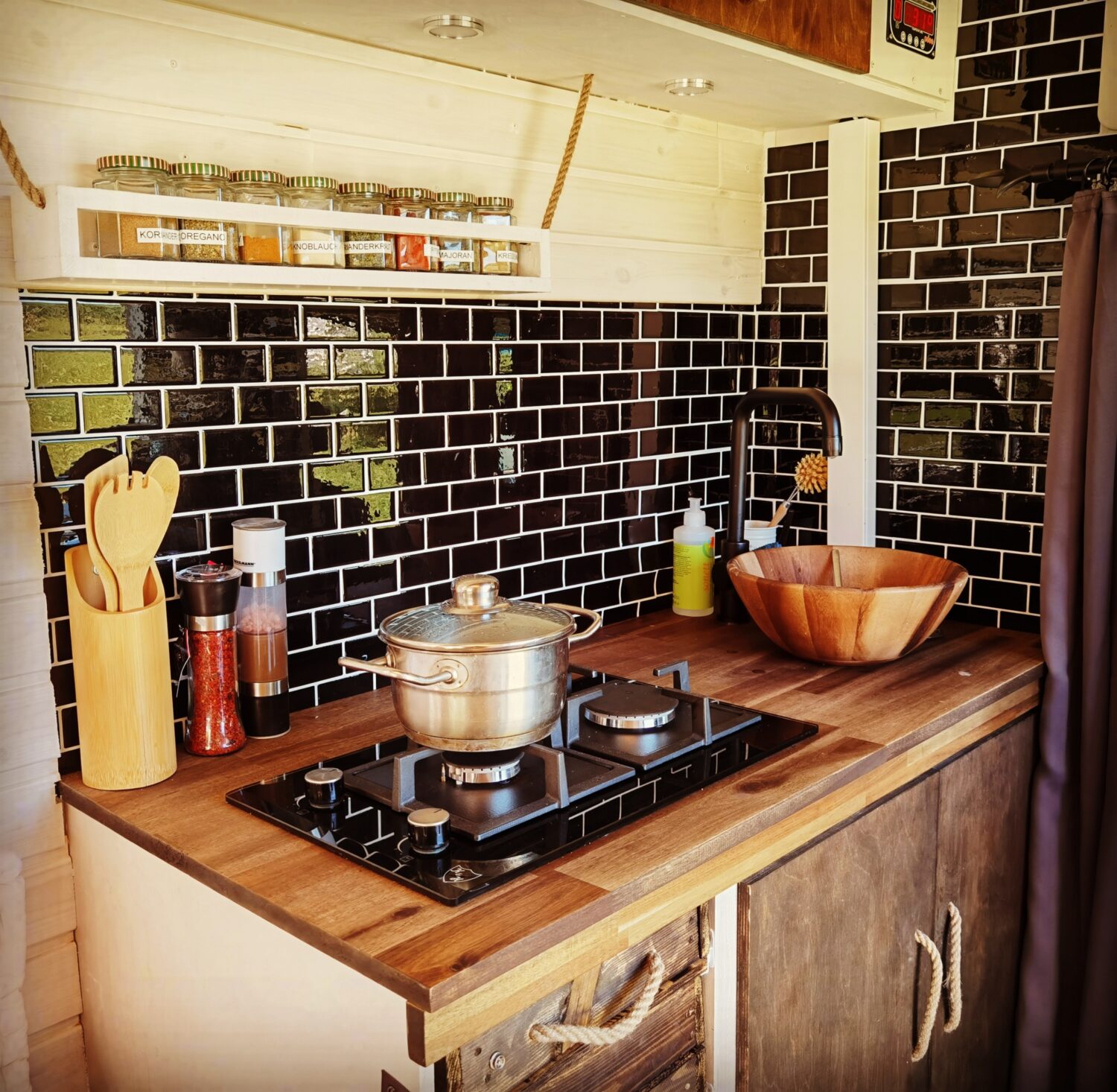 Der Ausbau hat ca. 2,5 Monate gedauert. Größere extravagante Features haben wir bisher noch nicht eingebaut, außer z. B. Die erweiterbare Arbeitsfläche im Küchenbereich, oder das wir, was uns sehr wichtig war/ist, durch unsere 550 w solar Anlage komplett Outark sind. 100 Liter Frischwasser und eine Druckpumpe sind neben 230V und einem extra großen Kühlschrank mit Gefrierfach ebenfalls mit an Bord. Der Warmwasserboiler fasst 6 Liter und kann über 230 V oder das Kühlwasser auf 90 Grad beheizt werden. Die Dusche inklusive Duschtasse steht bereits als Grundgerüst und wir bald fertig gemacht. Sie dient bisher bereits erfolgreich als Kabine für unsere Trocken - Trenn - Toilette. Wir sind auf alles besonders stolz. Vorallem wohl darauf, daß wir es ohne Vorkenntnisse in so kurzer Zeit geschafft haben unsere Ziele umzusetzen, und auf den für uns besonderen und gemütlichen Charme, den unser Toni hat.