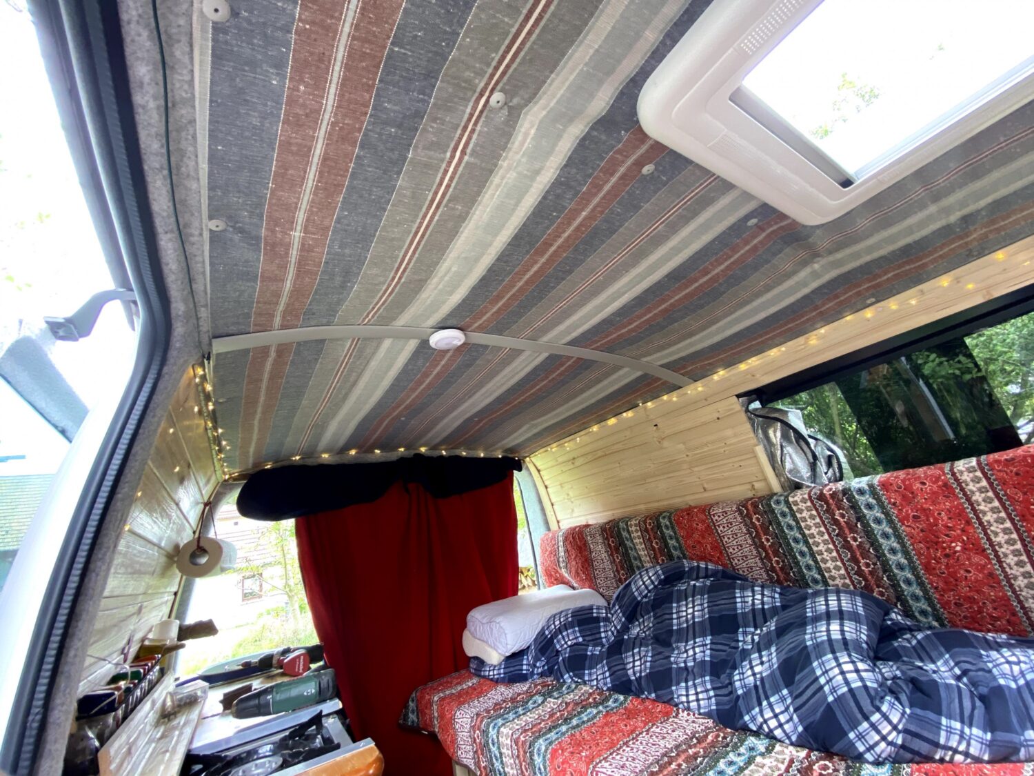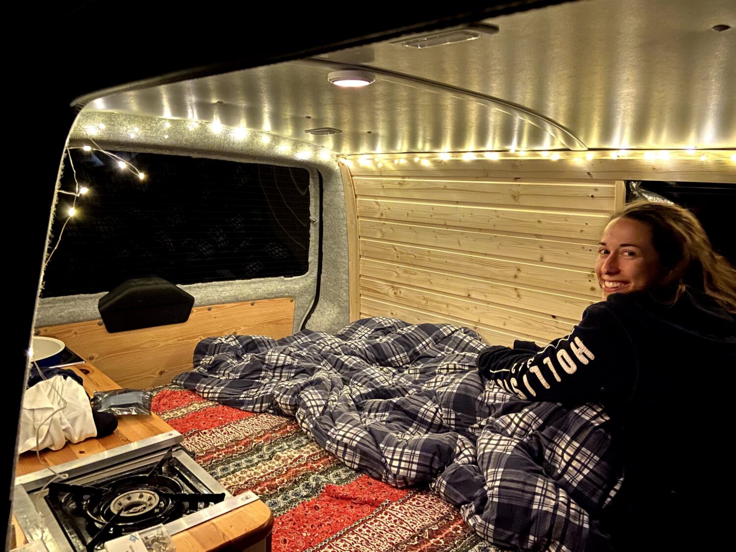 Alleine ausgebaut in der -Corona Hochphaseââˆinnerhalb 3 Wochen in Vollzeit-Arbeit. Besonderheiten: Ich lebe ohne Zweitbatterie vollzeit im Auto. Ich habe keinen Kühlschrank und mein Wasser bekomme ich mit einer Fußpumpe aus meinem 20L Wassertank. Das Licht ist Akkubetrieben musste ich aber noch nie laden. Ich komme so wunderbar klar und mir gefällt das einfache daran. Ausbaukosten: 1939€.