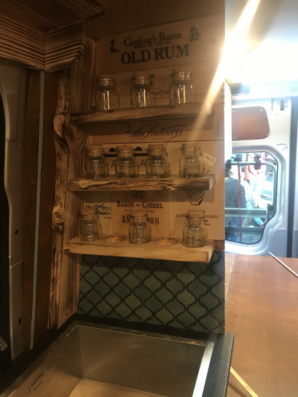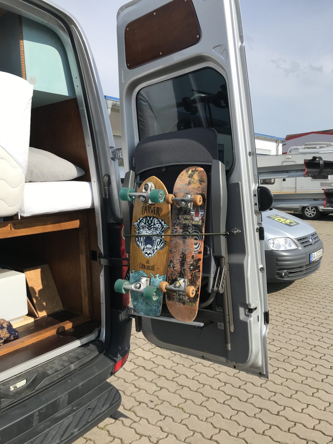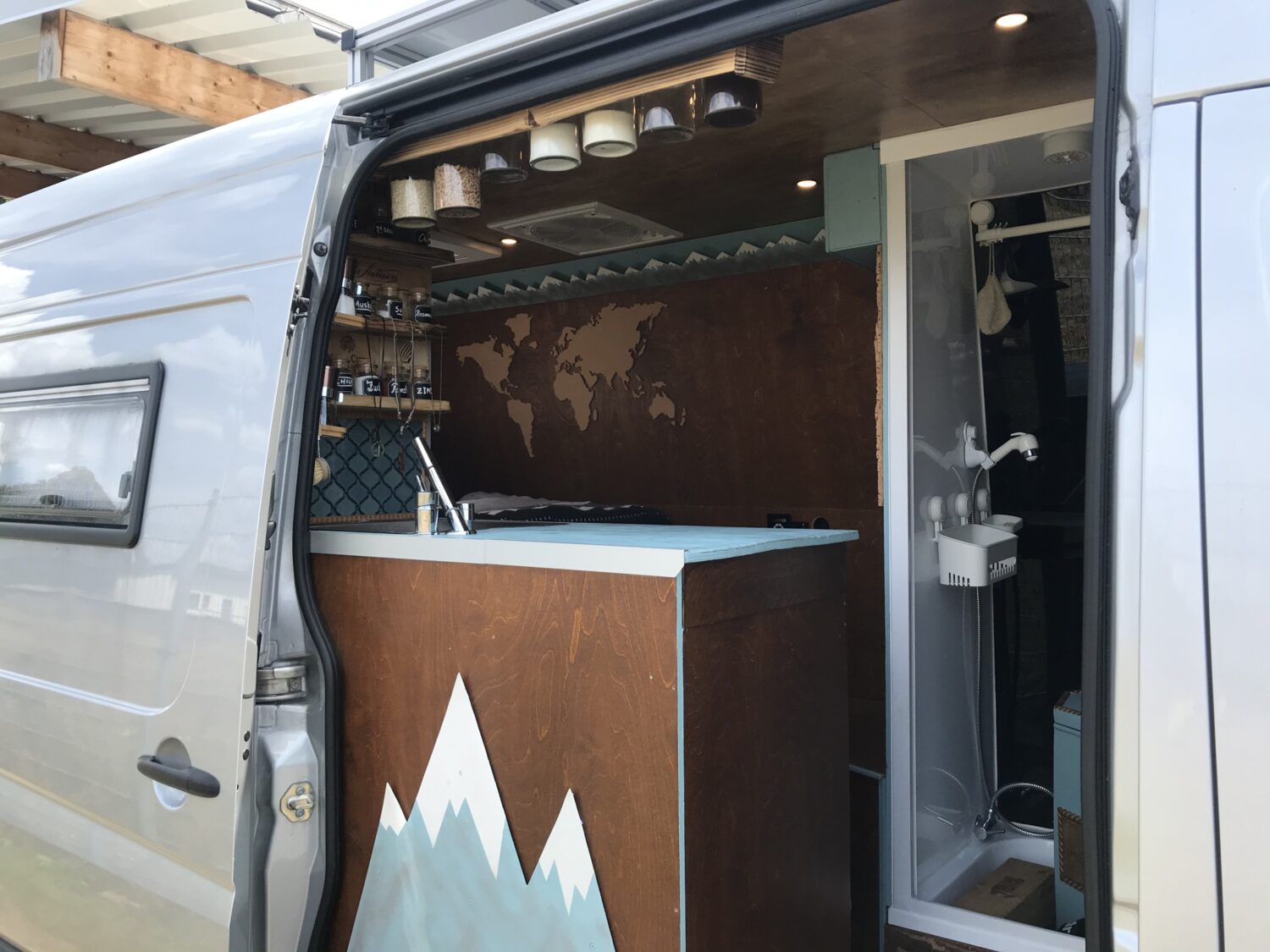 Der Ausbau hat ca 1,5 Jahre gedauert mit einigen Unterbrechungen. Nach dem ersten Monat war er zwar nicht optimiert aber zumindest mal funktionstüchtig. Zusammen gerechnete Arbeitszeit waren es ca 4 Monate. Er hat eine Dusche mit Warmwasser in der eine mobile Trockentrenntoilette steht. 90 Liter Kühlschrank mit Gefrierfach und einer Bettschiebefunktion bei der man in kürzester Zeit Fast den halben Van als Liegefläche hat. Besonders nützlich erwiesen hat sich das kleine Atomkraftwerk, 160 Ah Lithium Batterie kombiniert mit 320W Solarpanel lässt fast keine Wünsche mehr offen. Dann natürlich noch weiter Schnickschnack wie Dachlüfter,Duschlüfter, Standleitung, Sternenhimmel Fenster und diverse Beleuchtung wie auch indirekte Beleuchtung.