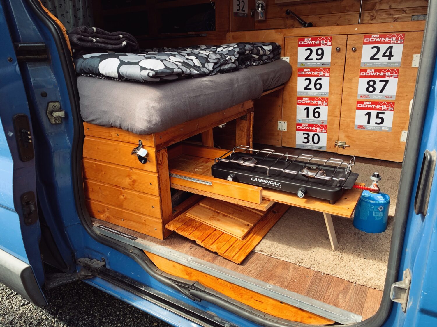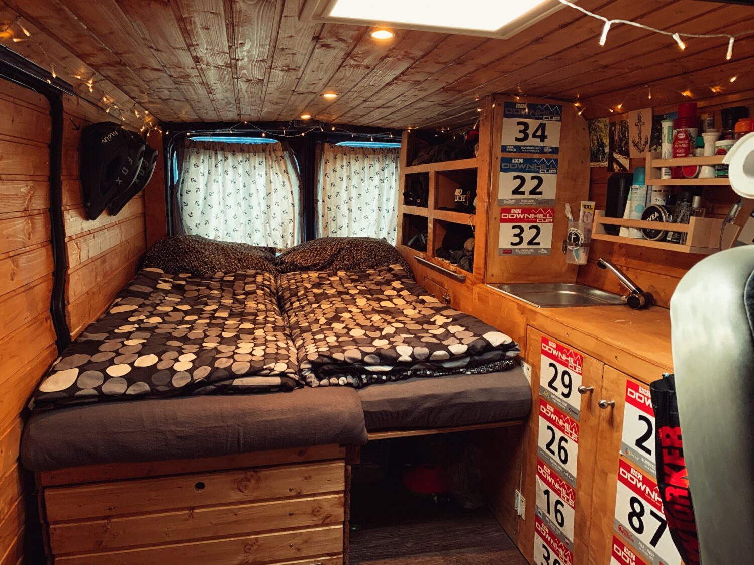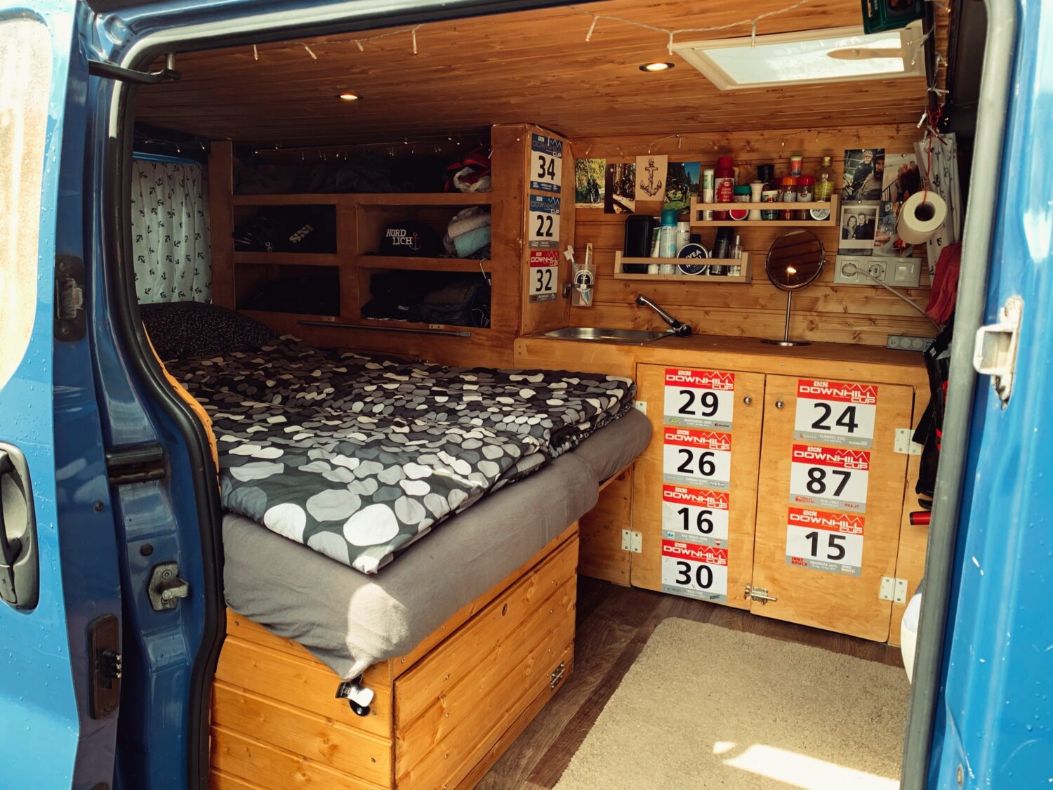 Wir haben Balu 2017 gekauft und ein 1/2 Jahr so ausgebaut das wir zu zweit mit 2 Rädern reisen können. Den Innenraum ziert Holz in Saunaoptik. Damit wir 2 Räder mitbekommen ist das Bett klappbar. Eingeklappt ist es 80x190cm und ausgeklappt 130x190cm, allerdings müssen dir Räder dann draußen schlafen. Für Strom sorgt eine 95aH AGM Bordbatterie die alle Verbraucher 4 Tage lang bedienen kann. Im Innenraum befindet sich eine Spüle mit 20L Wassertank, das Abwasser wird rausgeleitet. Unter dem Bett ist ein ausziehbarer 2 Platten Gaskocher. Im Heck ist eine Aussendusche mit 10L Wassertank verbaut. Der Beifahrersitz ist drehbar und die Schränke bieten jede Menge Staumöglichkeit. Für Schatten sorgt ein Sonnensegel befestigt mittels Kederschiene.
