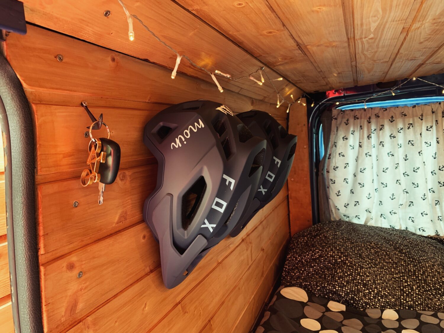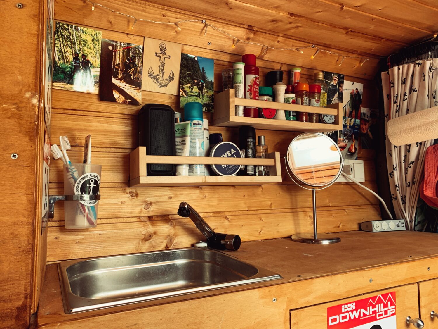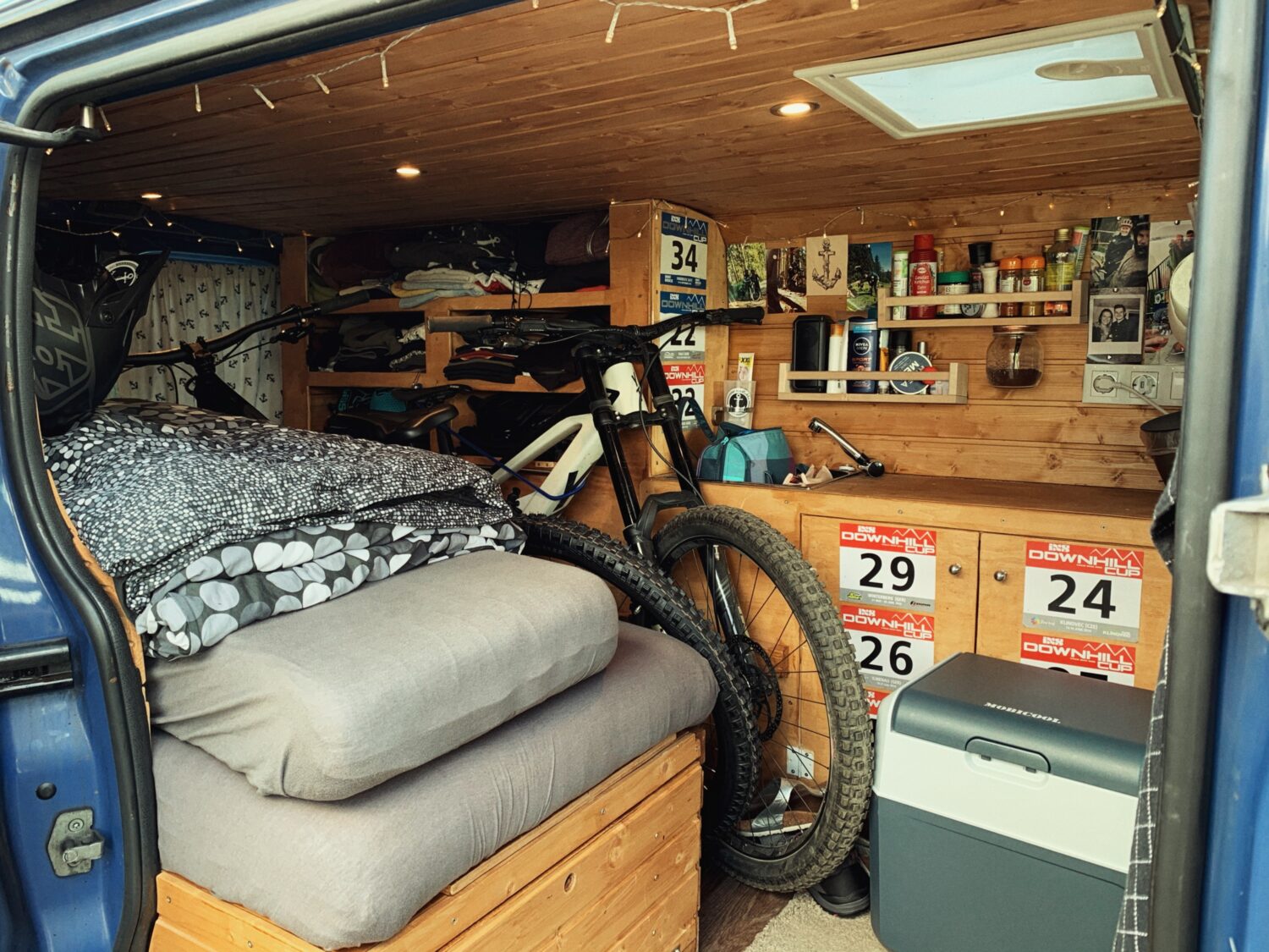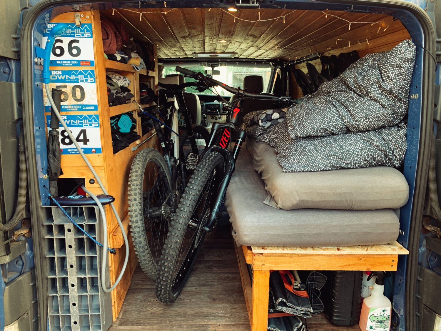 Wir haben Balu 2017 gekauft und ein 1/2 Jahr so ausgebaut das wir zu zweit mit 2 Rädern reisen können. Den Innenraum ziert Holz in Saunaoptik. Damit wir 2 Räder mitbekommen ist das Bett klappbar. Eingeklappt ist es 80x190cm und ausgeklappt 130x190cm, allerdings müssen dir Räder dann draußen schlafen. Für Strom sorgt eine 95aH AGM Bordbatterie die alle Verbraucher 4 Tage lang bedienen kann. Im Innenraum befindet sich eine Spüle mit 20L Wassertank, das Abwasser wird rausgeleitet. Unter dem Bett ist ein ausziehbarer 2 Platten Gaskocher. Im Heck ist eine Aussendusche mit 10L Wassertank verbaut. Der Beifahrersitz ist drehbar und die Schränke bieten jede Menge Staumöglichkeit. Für Schatten sorgt ein Sonnensegel befestigt mittels Kederschiene.