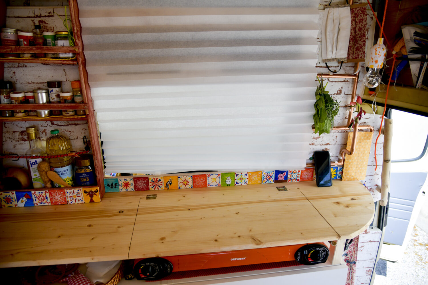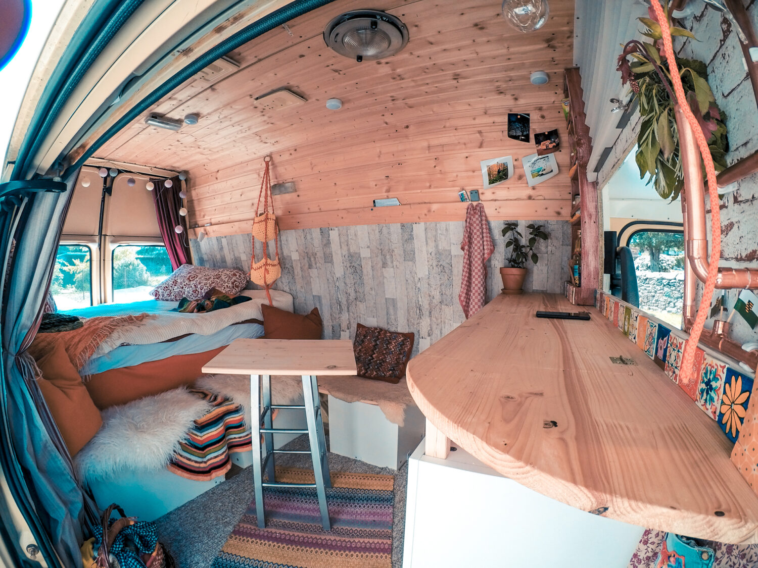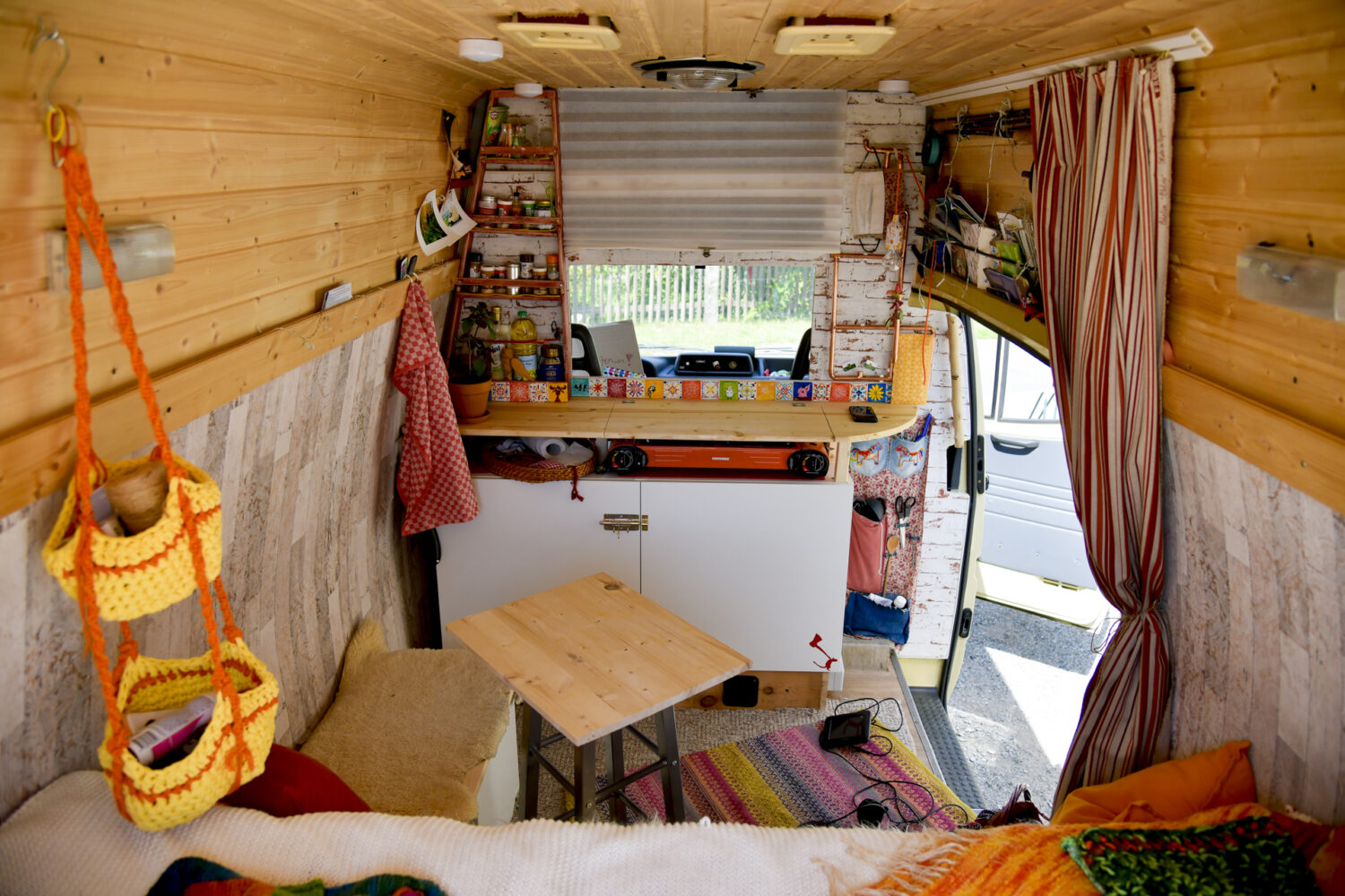 Ellie ist ein alter Krankenwagen, der beim Katastrophenschutz irgendwo in Dittmarschen eingesetzt war. Wir haben sie ohne Inhalt, quasi nackt wie der Autogott sie erschuf, übernommen. Der erste Ausbau von Ellie hat insgesamt drei Tage gedauert. De Wagen ist komplett mit Amarflex gedämmt. (Bis auf den Fußboden). Den unteren Teil haben wir mit Original gelassen- tapezierte Presspappe Der obere Teil wurde mit leichtem Fichtenholz vertäfelt. Diese Holzsorte ist leicht austauschbar. Es lassen sich auch leicht Schrauben und Haken ins Material drehen. Eine ausgefeilte Technik, wie es mittlerweile viele Campervans haben, gibt es bei uns nicht. Die Hauptbatterie versorgt das Auto und die Standheizung. Ellie hat einen Anschluss für Landstrom. Die Beleuchtung übernehmen Stromversorger wie Akkus und Solarzellen. Wir haben keinen Wassertank. Drei Kanister mit etwa 25 Liter Fassungsvermögen reichen uns aus. Geduscht wird draussen mit einer Solardusche. Besonders stolz ist Nicole auf ihre handgefertigten Fliesen in der Bordküche. Die hat sie in einer zweiten Ausbauwelle 2020 innerhalb von drei Tage hergestellt und verbaut.