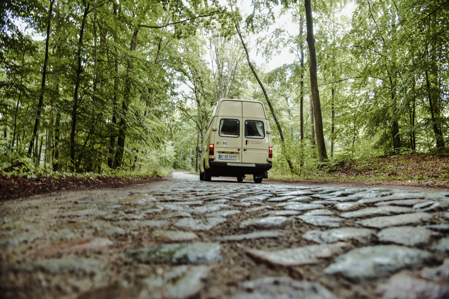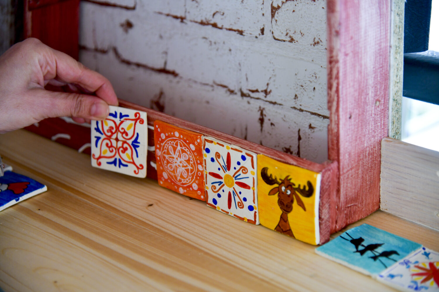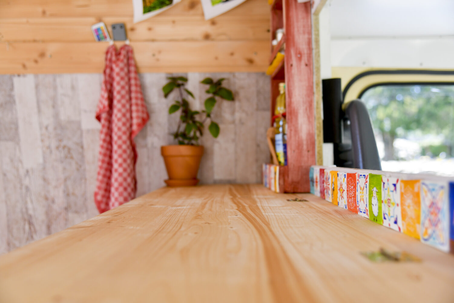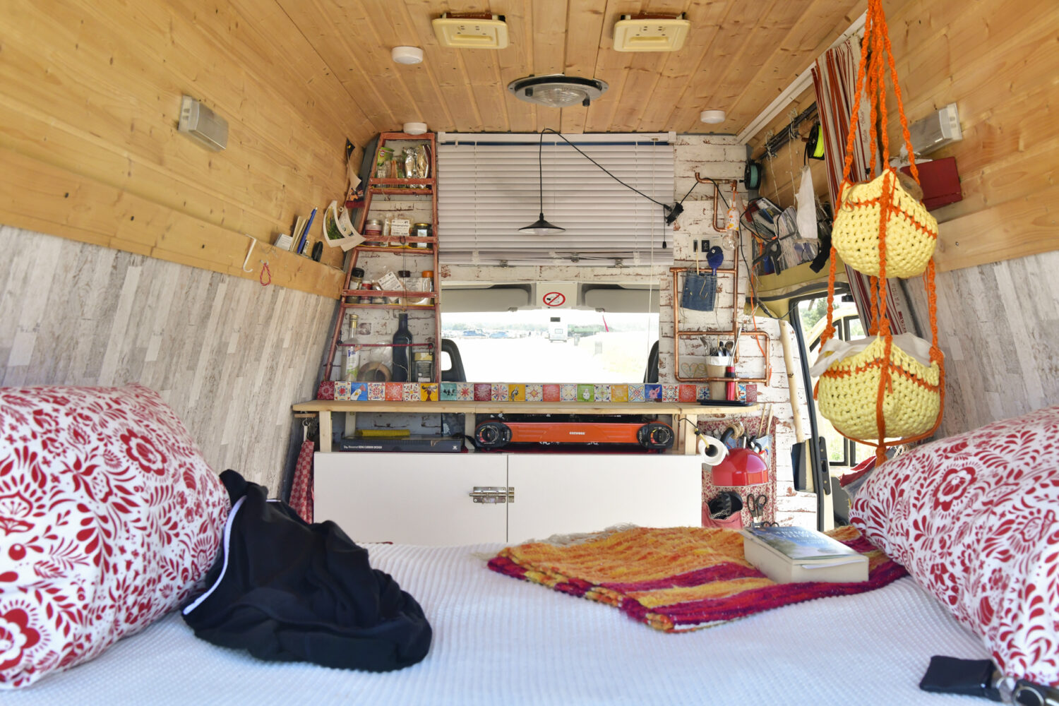 Ellie ist ein alter Krankenwagen, der beim Katastrophenschutz irgendwo in Dittmarschen eingesetzt war. Wir haben sie ohne Inhalt, quasi nackt wie der Autogott sie erschuf, übernommen. Der erste Ausbau von Ellie hat insgesamt drei Tage gedauert. De Wagen ist komplett mit Amarflex gedämmt. (Bis auf den Fußboden). Den unteren Teil haben wir mit Original gelassen- tapezierte Presspappe Der obere Teil wurde mit leichtem Fichtenholz vertäfelt. Diese Holzsorte ist leicht austauschbar. Es lassen sich auch leicht Schrauben und Haken ins Material drehen. Eine ausgefeilte Technik, wie es mittlerweile viele Campervans haben, gibt es bei uns nicht. Die Hauptbatterie versorgt das Auto und die Standheizung. Ellie hat einen Anschluss für Landstrom. Die Beleuchtung übernehmen Stromversorger wie Akkus und Solarzellen. Wir haben keinen Wassertank. Drei Kanister mit etwa 25 Liter Fassungsvermögen reichen uns aus. Geduscht wird draussen mit einer Solardusche. Besonders stolz ist Nicole auf ihre handgefertigten Fliesen in der Bordküche. Die hat sie in einer zweiten Ausbauwelle 2020 innerhalb von drei Tage hergestellt und verbaut.