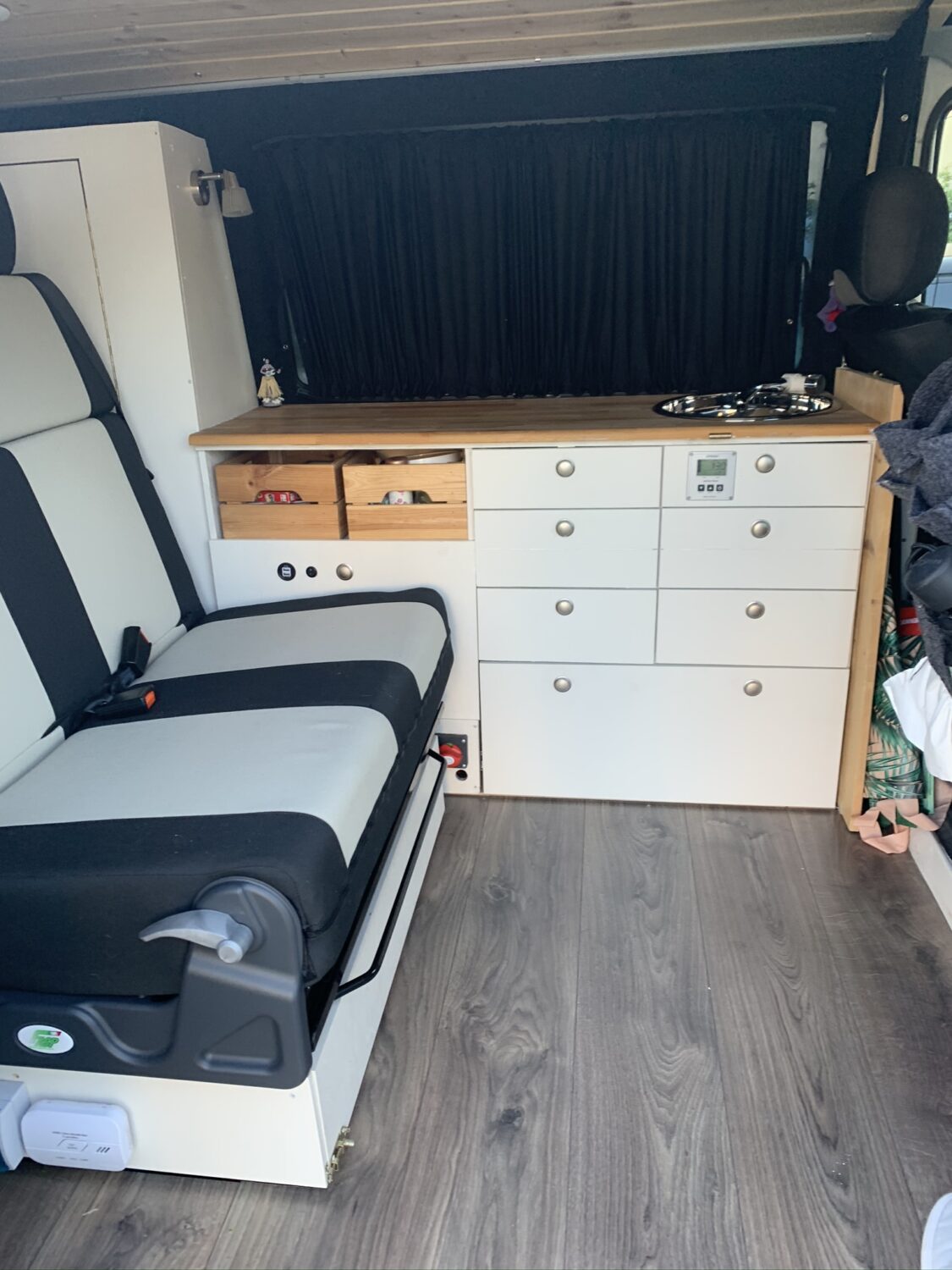 Komplett selbst ausgebauter Bus auf den ich sehr stolz bin. Ingesamt habe ich jetzt den 4ten Ausbau drin und wahrscheinlich ist es auch nicht der Letzte. Ole ist ein 2.0 Liter Benziner mit 84Ps der seit 4 Jahren in meinem Besitz ist. Er verfügt über ein drehbaren Beifahrersitz, Tempomat, Funkzentralverriegelung, Anhängerkupplung, eine Spüle mit 12 Liter Frischwasser-und Abwassertanks, eine Kompressorkühlbox, ein Porta Potti, eine Doppelsitz-Schlafbank von FASP, eine 2te Batterie mit Batteriecomputer, Markise sowie Fahrradträger von Fiamma. Seine Innenverkleidung besteht aus Filz und Holz.