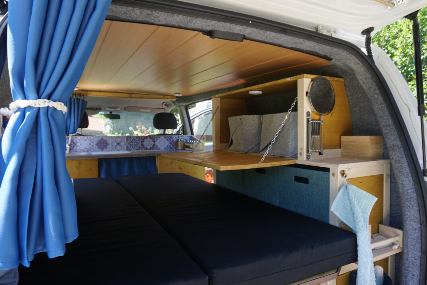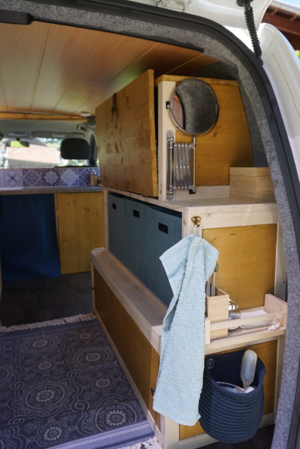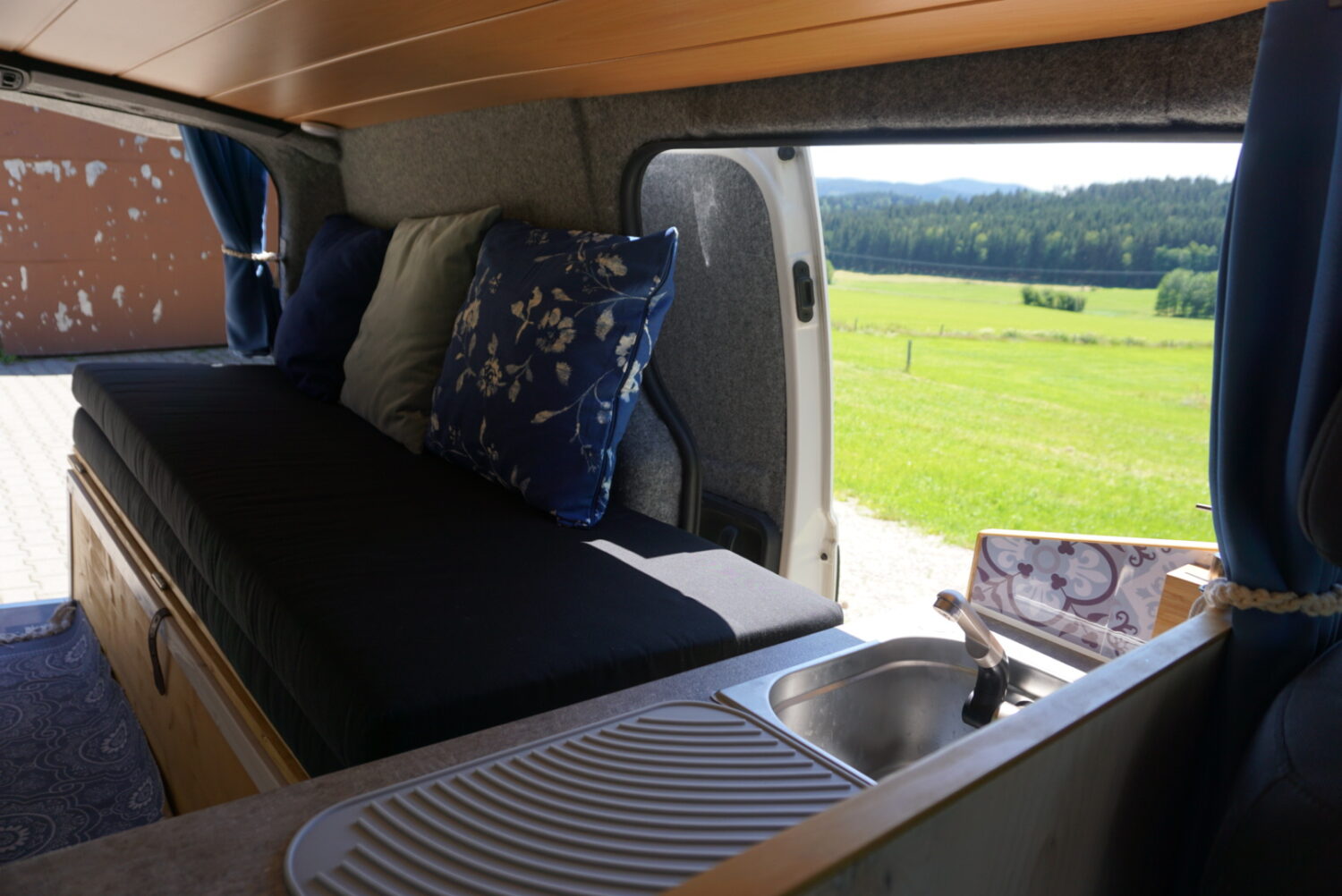 Wir haben jeden Samstag am Bus gebastelt im Winter 2019/2020. Durch Solar können wir autark stehen. Die Decke sind alte Paneelen, die vorher bereits Jahrzehnte in der elterlichen Küche hingen. Wir haben ein kleines "Badezimmer" im Heck, ein Klappbett und viel Stauraum. Der Ausbau war ein Familienprojekt, darauf sind wir stolz. Jeder hat so ein bisschen mitgetüftelt.