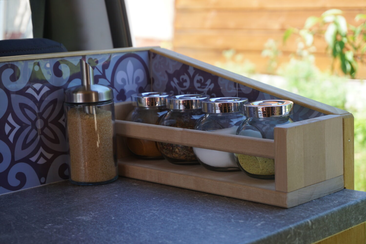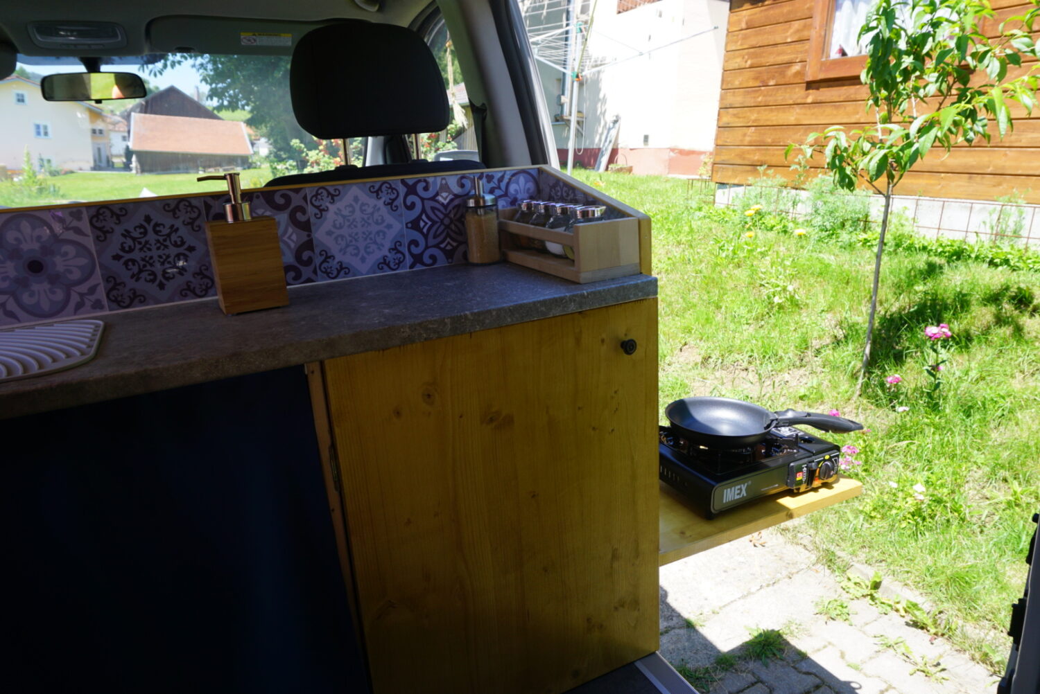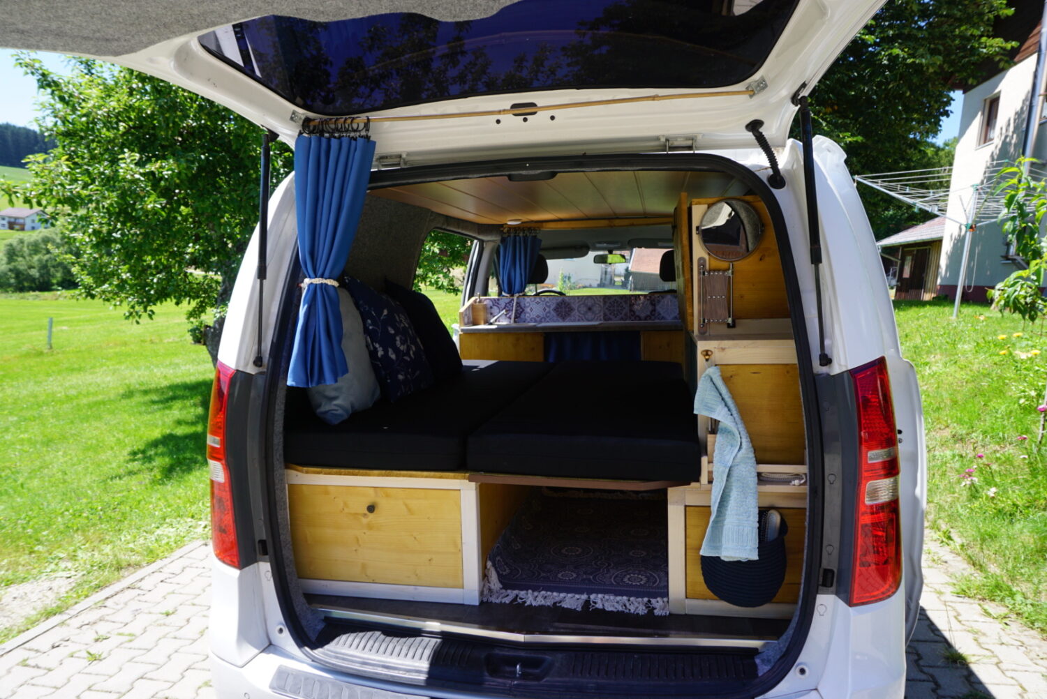 Wir haben jeden Samstag am Bus gebastelt im Winter 2019/2020. Durch Solar können wir autark stehen. Die Decke sind alte Paneelen, die vorher bereits Jahrzehnte in der elterlichen Küche hingen. Wir haben ein kleines "Badezimmer" im Heck, ein Klappbett und viel Stauraum. Der Ausbau war ein Familienprojekt, darauf sind wir stolz. Jeder hat so ein bisschen mitgetüftelt.
