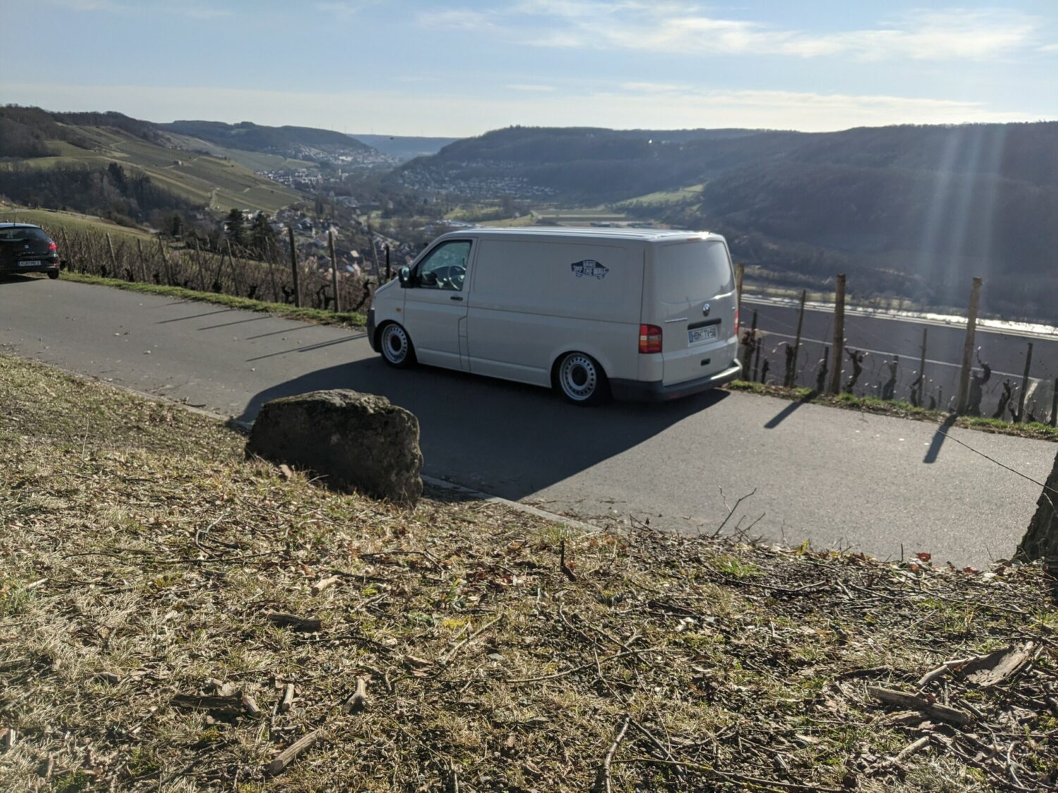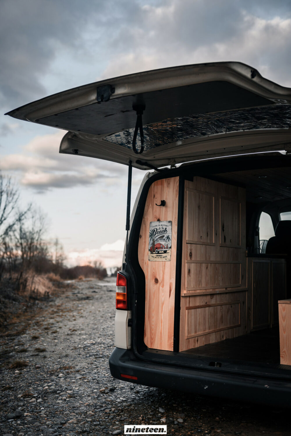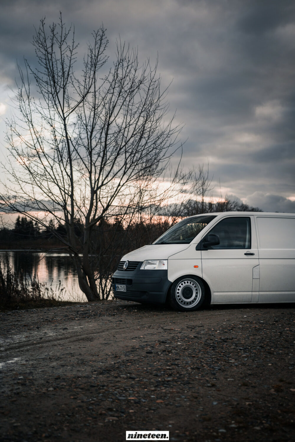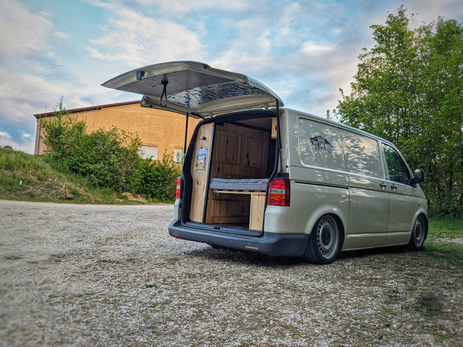Den Bus hatte ich ursprünglich wegen das Hauskaufs als Transporter gekauft und wollte ihn danach wieder verkaufen. Dann hatte ich aber so einen Spaß mit dem Wagen, dass ich ihn doch behalten wollte. Also habe ich geschaut, was denn so möglich ist mit einem T5. Nach etlichen YouTube Videos und Blogs begann die Vorstellung vom stylischen und praktischen Camper. So habe ich ein Luftfahrwerk verbaut, kombiniert mit 18 Zoll Touareg Stahlfelgen, da ich den Trapo-Look sehr cool finde.